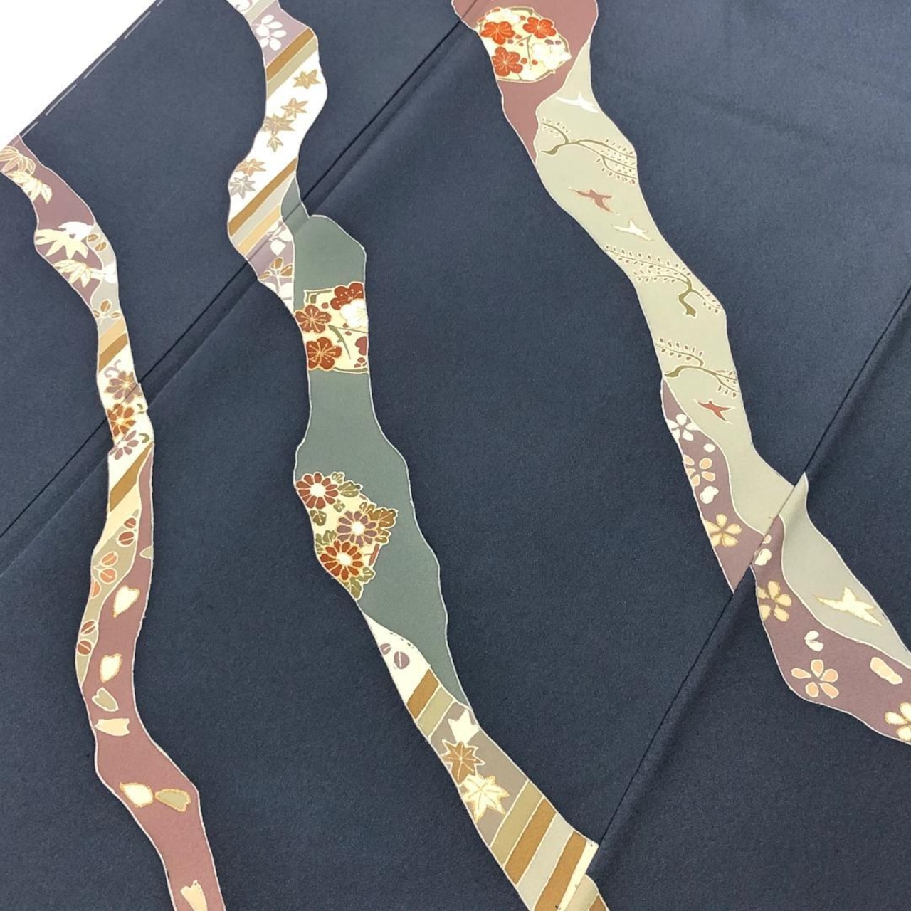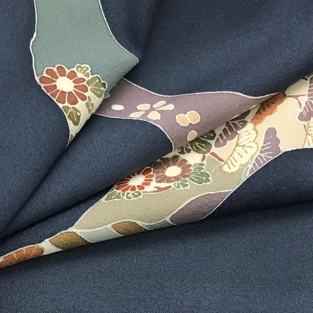 鋼色の雰囲気の良いお色味に道長取に花模様の柄裄がデザインされた素敵なお品でございます。