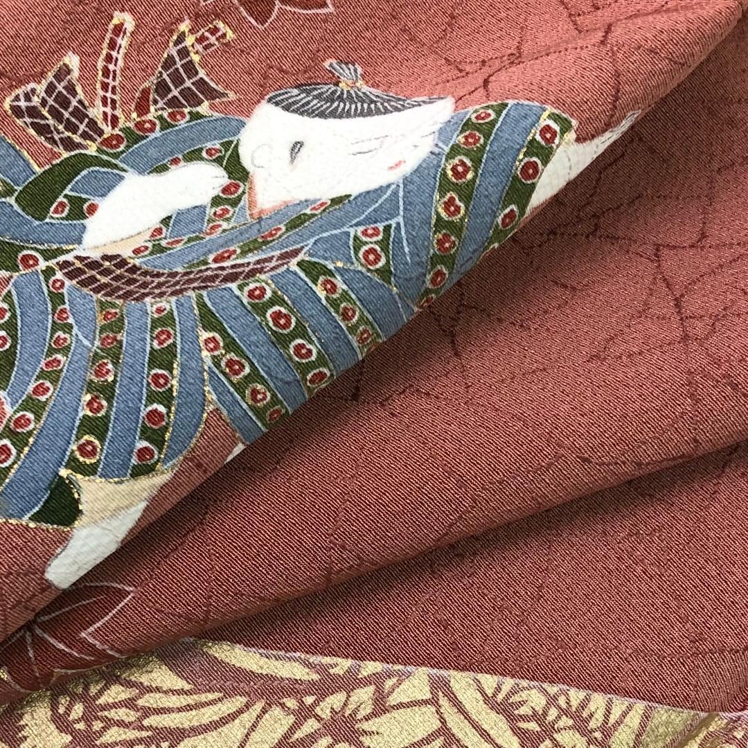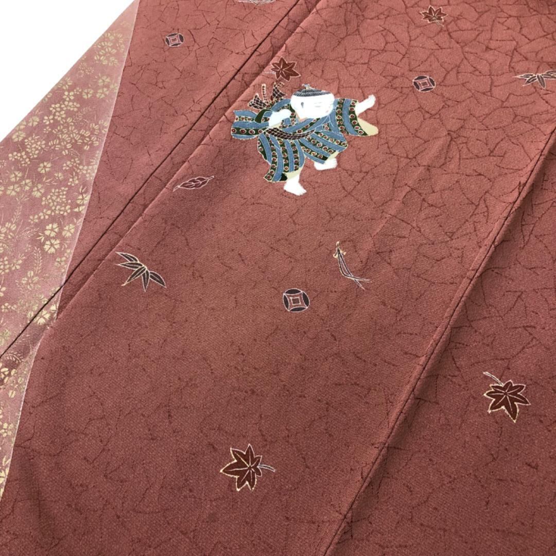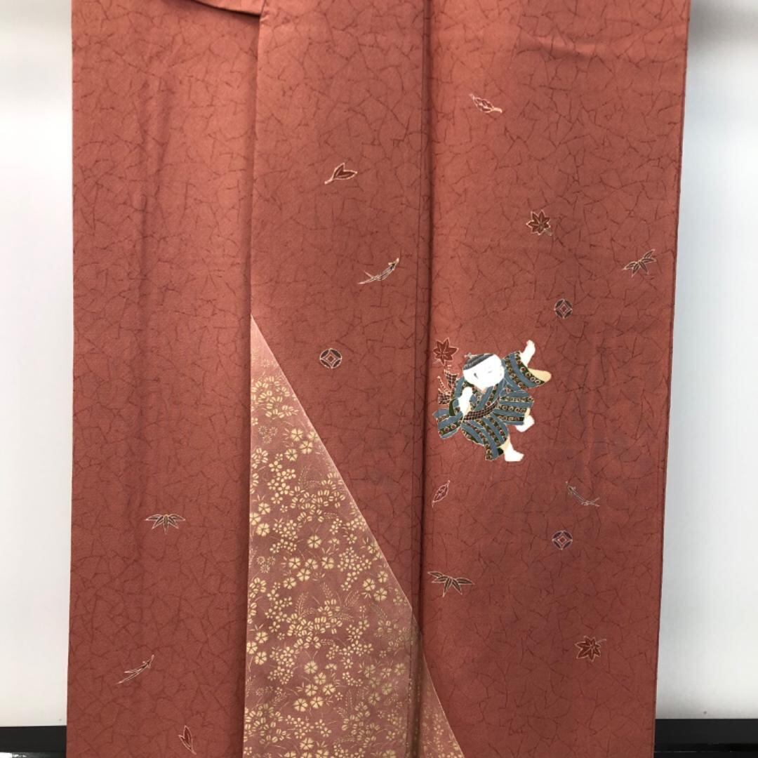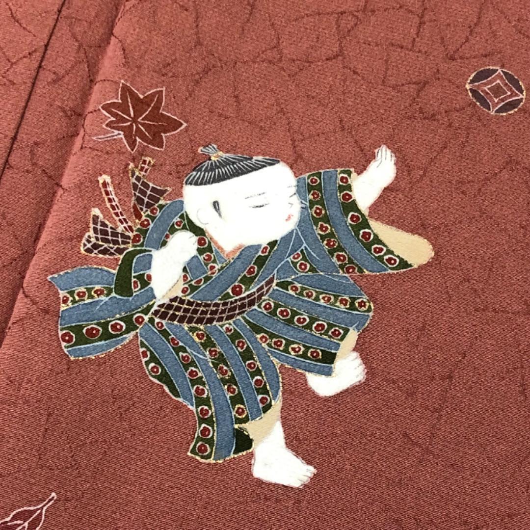 弁柄色のお色味に童子、小花柄などがデザインされた素敵なお品でございます。