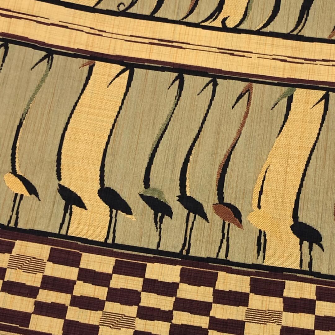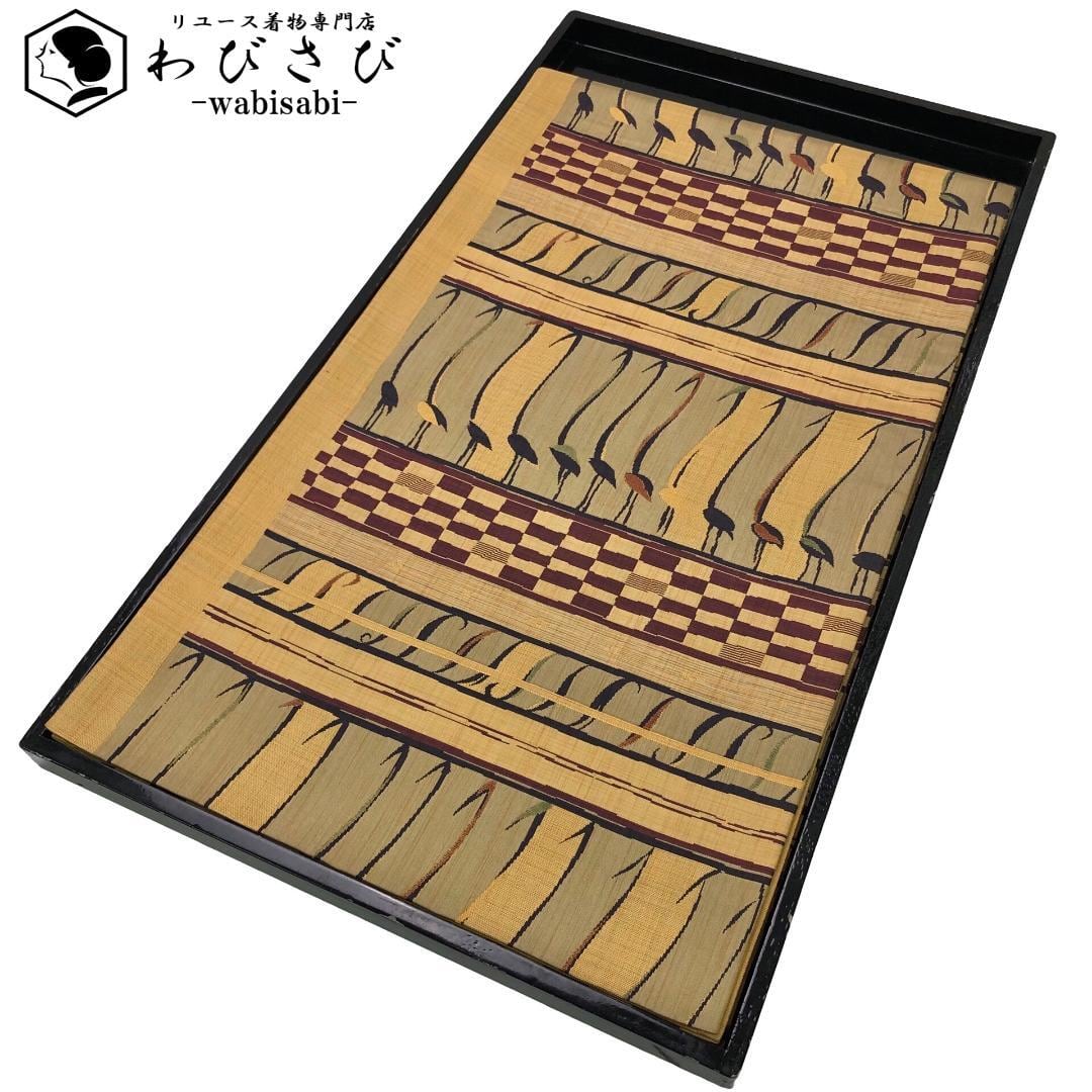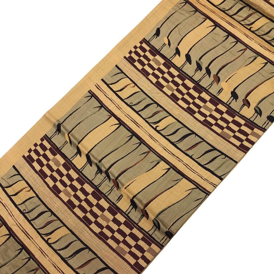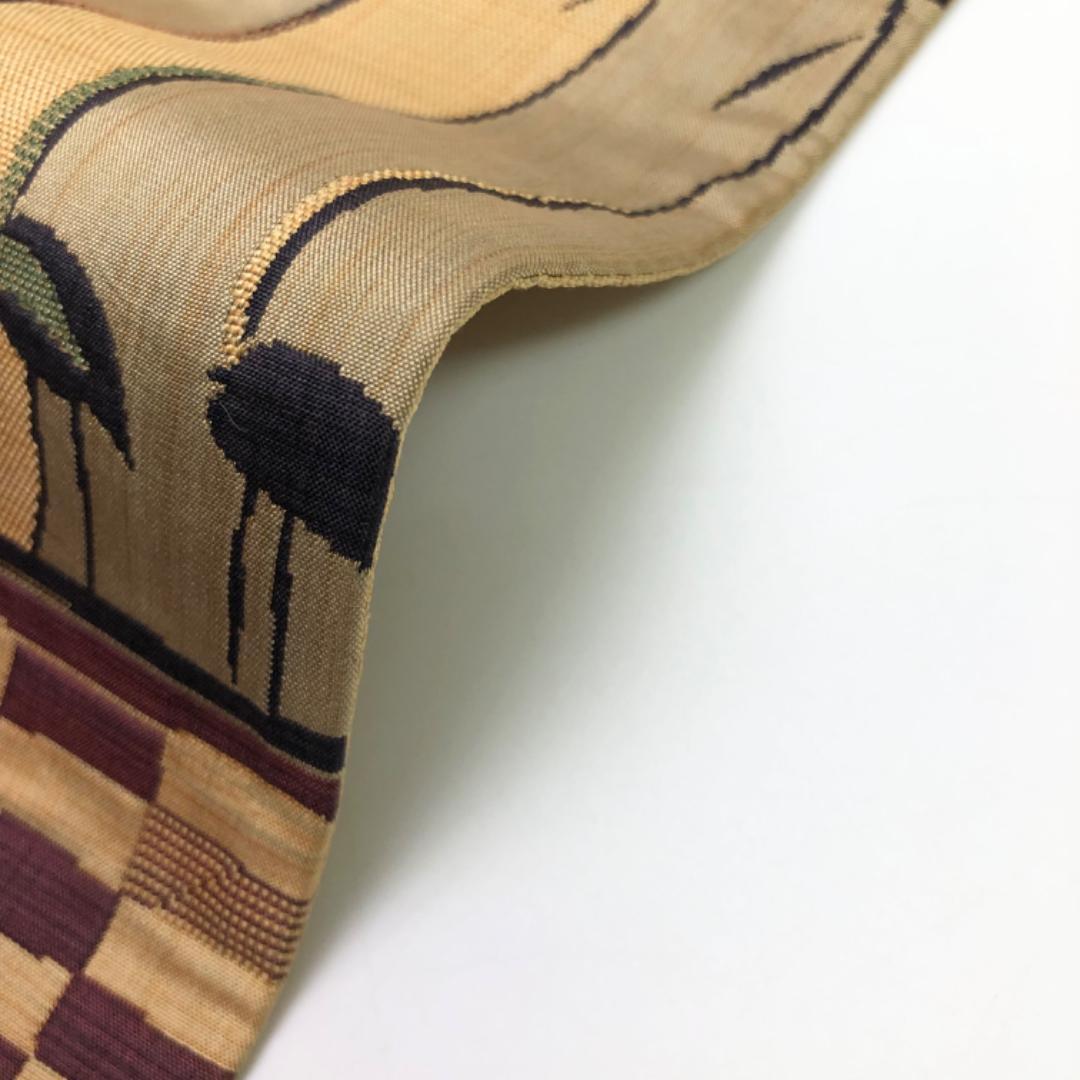 山吹色のお色味に抽象鳥柄、横段模様などがデザインされた雰囲気の良い素敵なお品でございます。