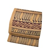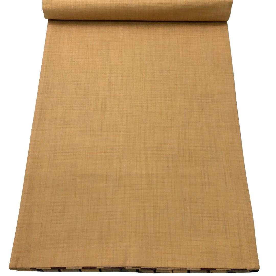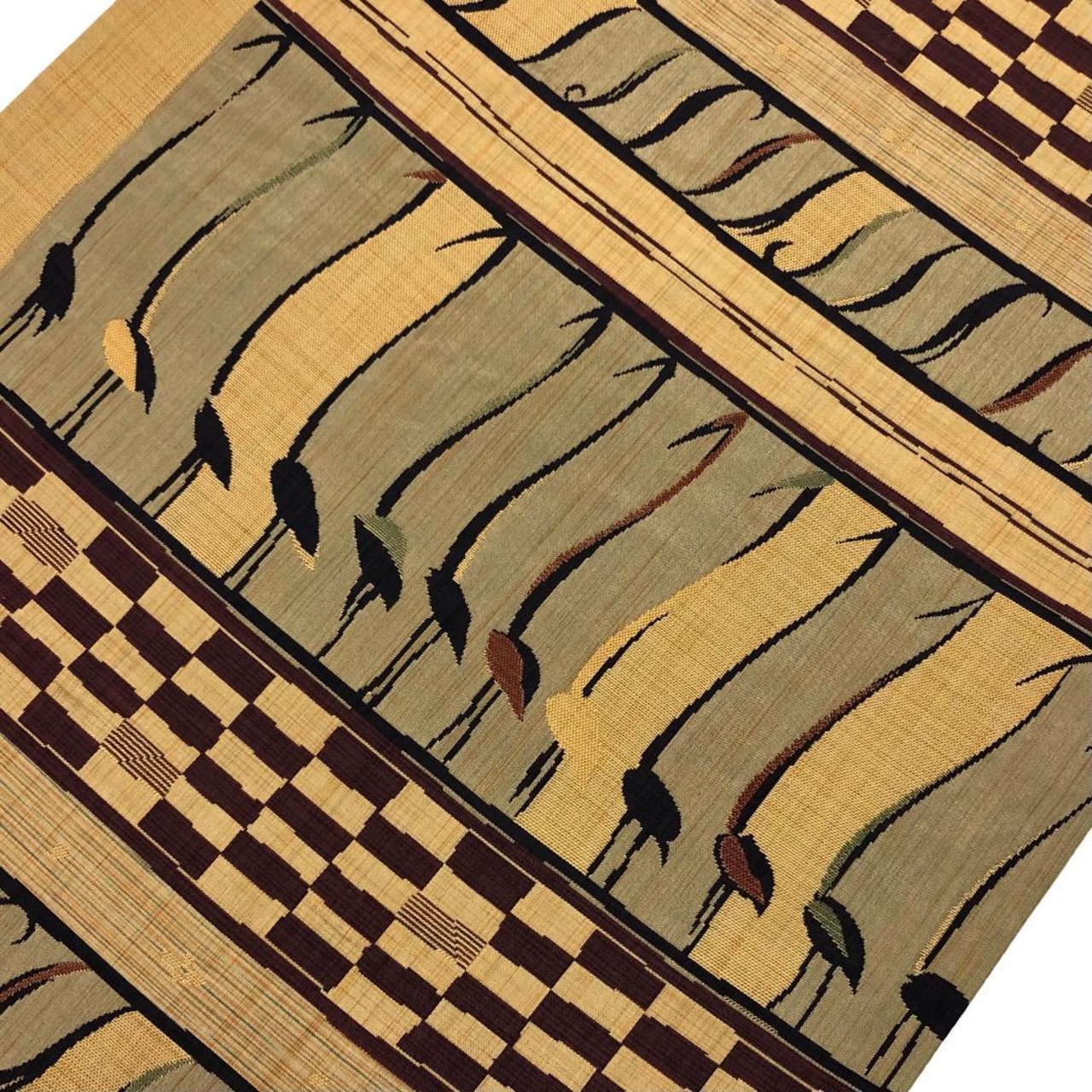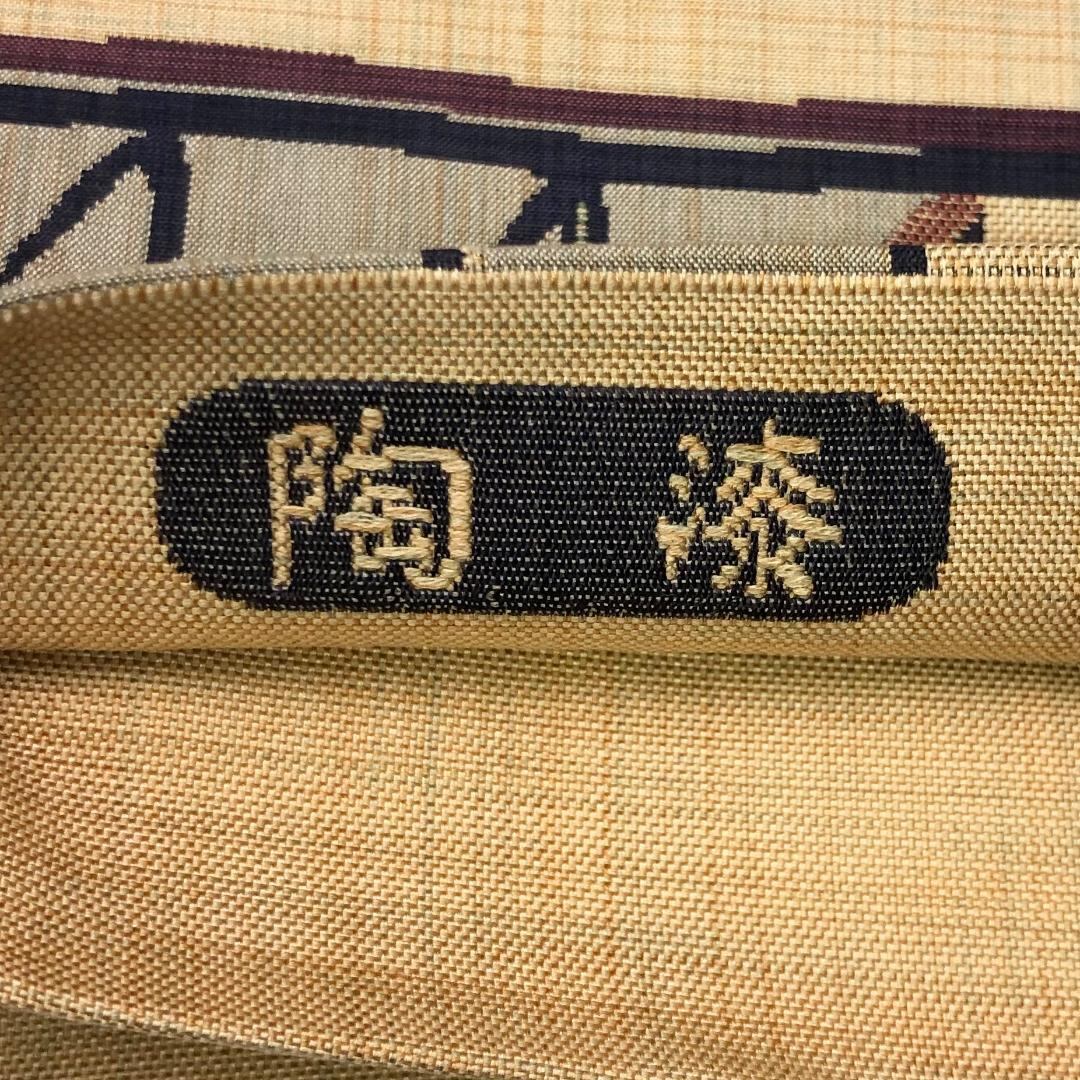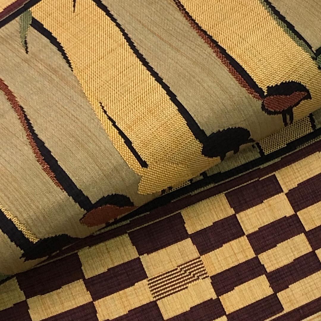 山吹色のお色味に抽象鳥柄、横段模様などがデザインされた雰囲気の良い素敵なお品でございます。