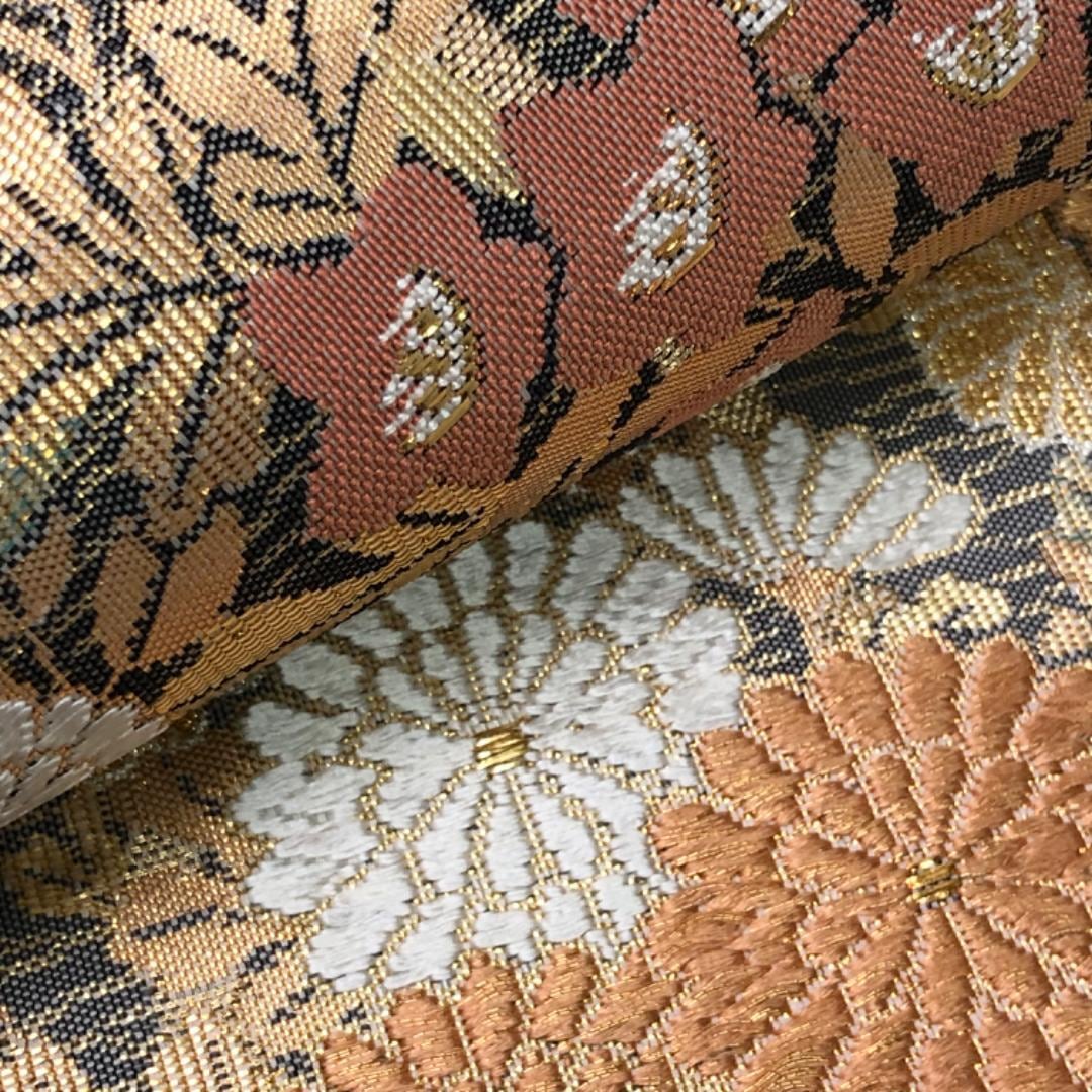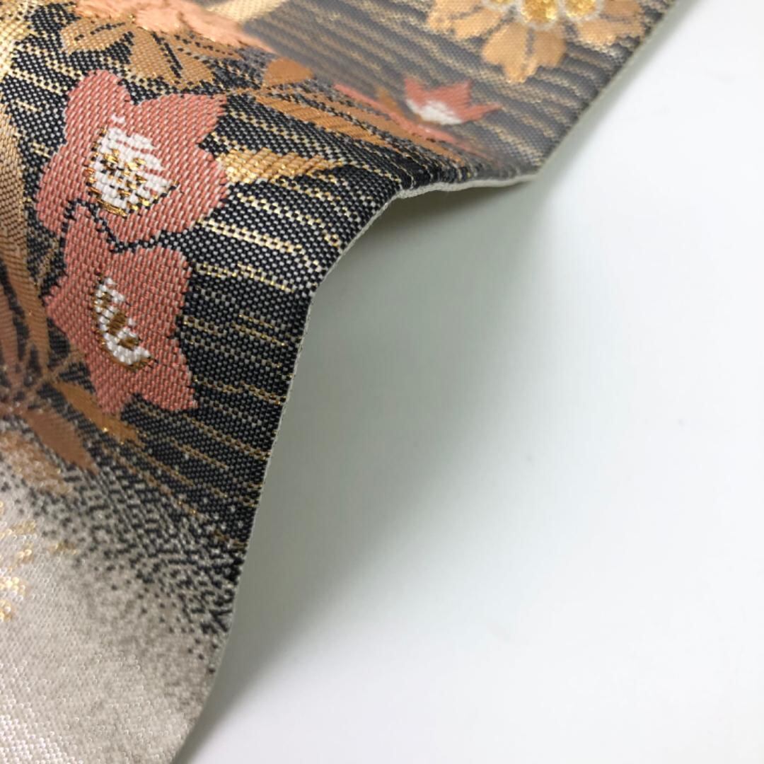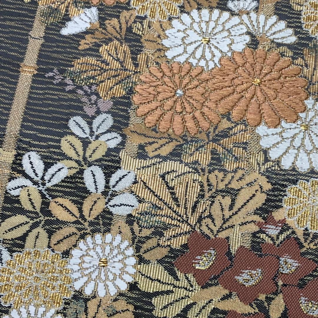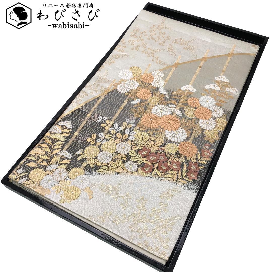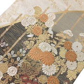 銀色ベースのお色味に竹垣に花模様の柄裄がデザインされた雰囲気の良い素敵なお品でございます。