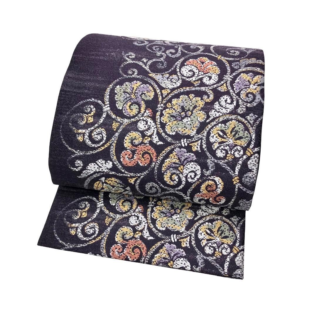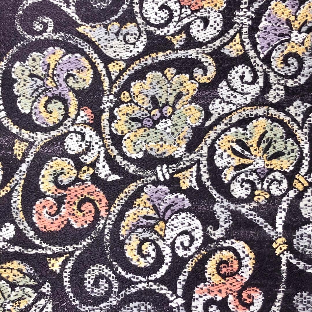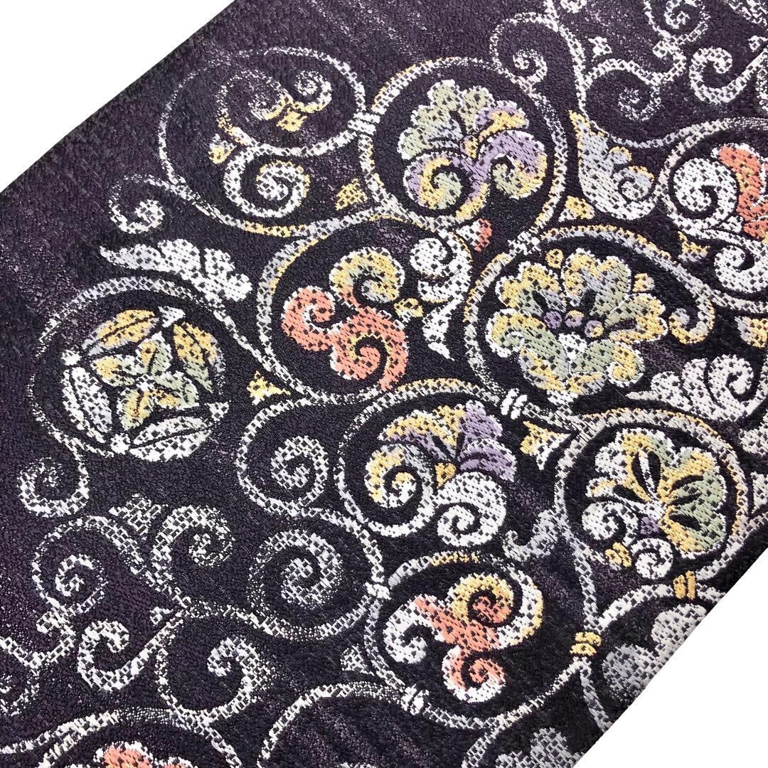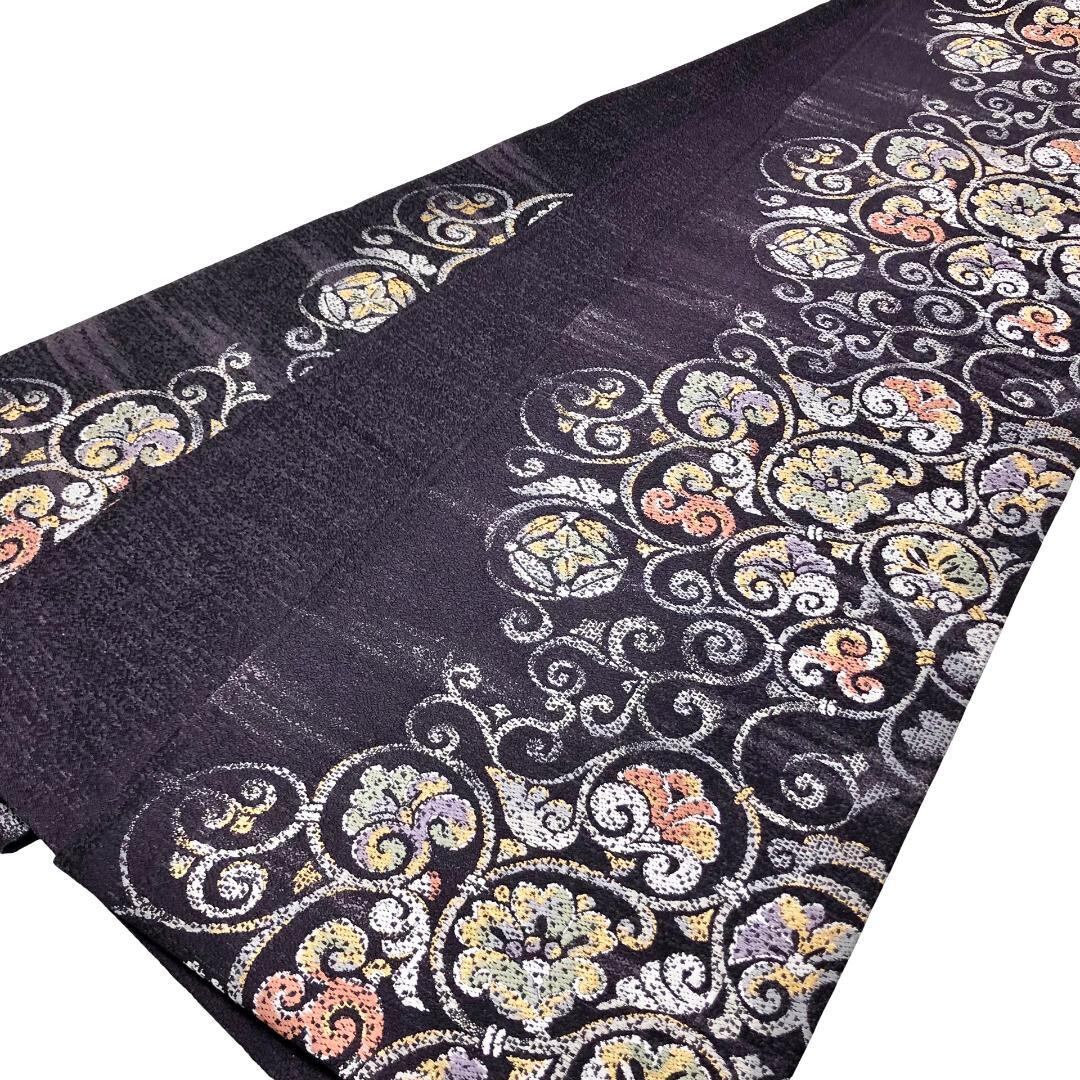 紫褐色のお色味に花唐草模様の柄裄がデザインされた雰囲気の良い素敵なお品でございます。