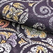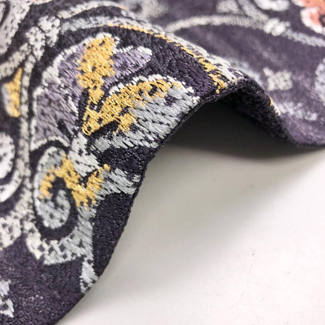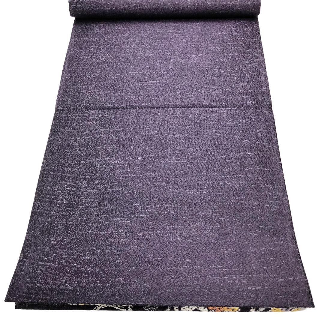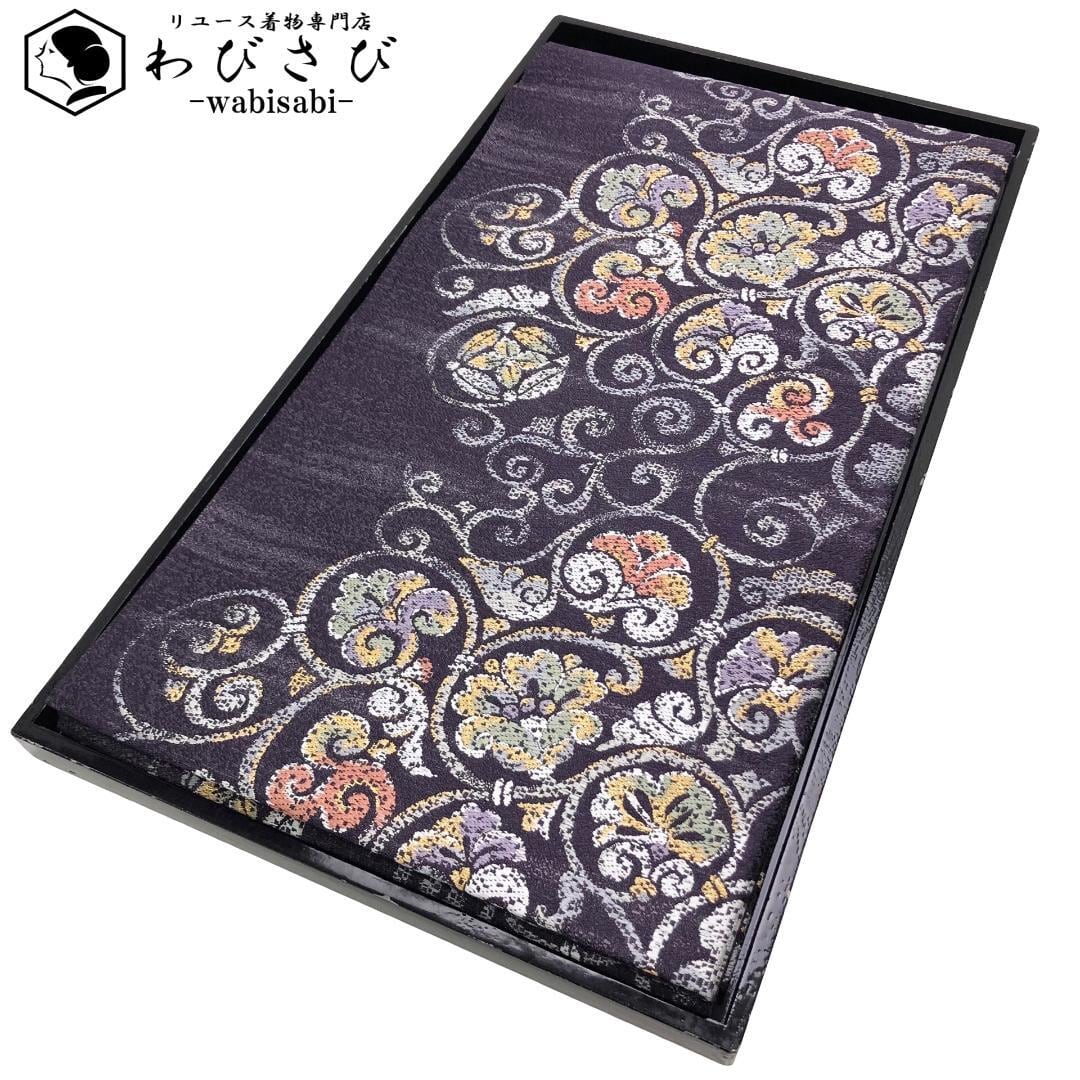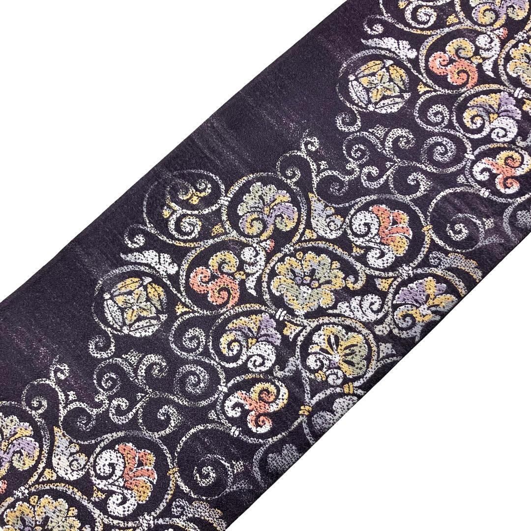 紫褐色のお色味に花唐草模様の柄裄がデザインされた雰囲気の良い素敵なお品でございます。