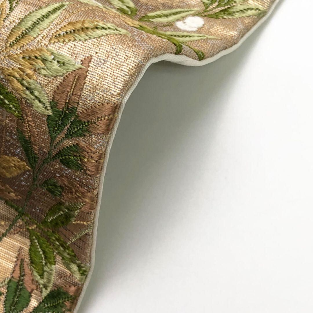 山吹色ベースのお色味に南天の柄行がデザインされた雰囲気の良い素敵なお品でございます。
