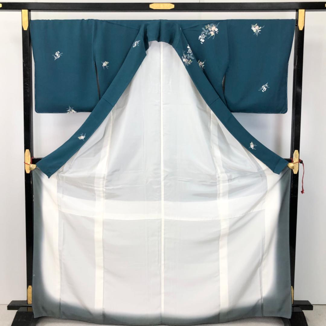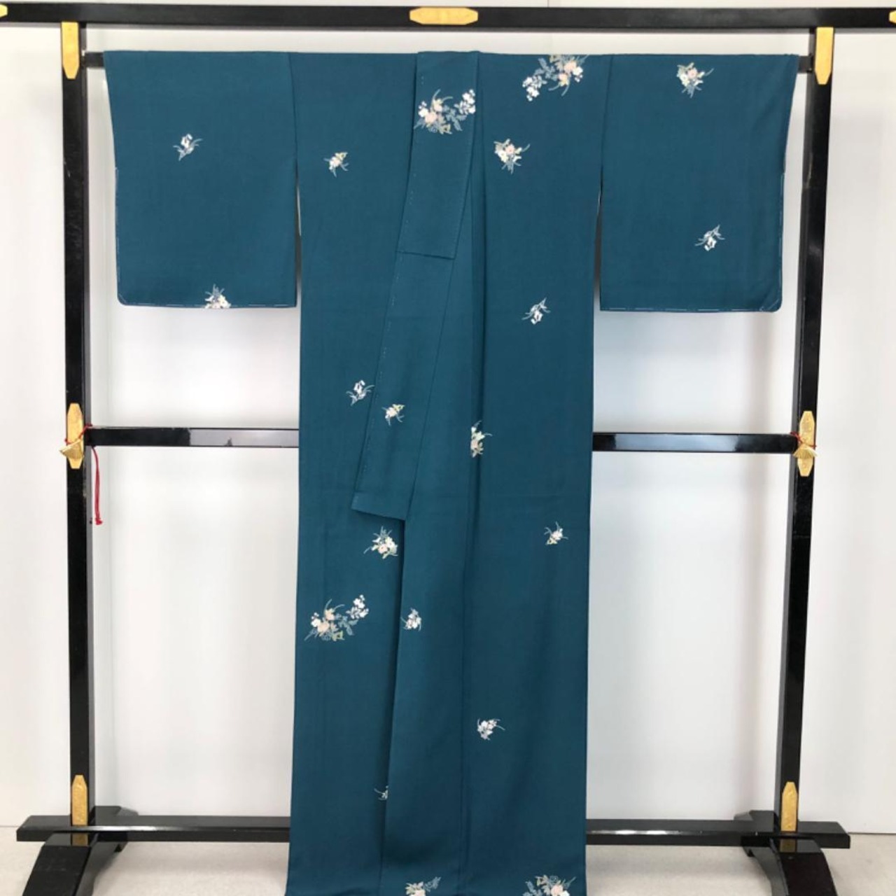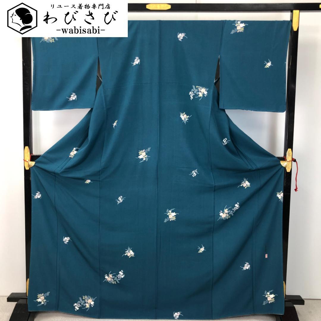 小紋 京加賀友禅 百貫石峰 花模様 藍鉄色 トールサイズ K-5583 着物 きもの kimono 和服 和装 中古 リサイクル着物 【送料無料】