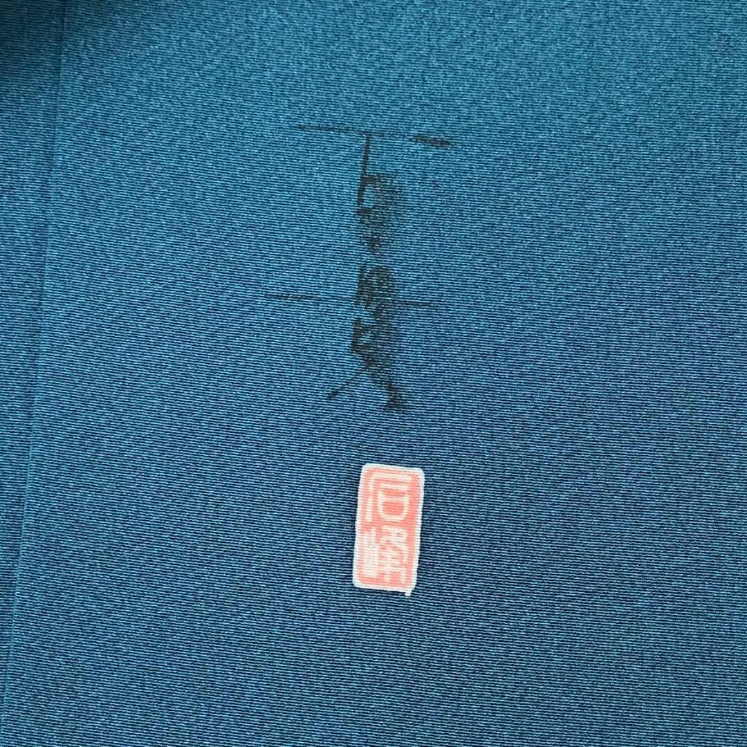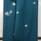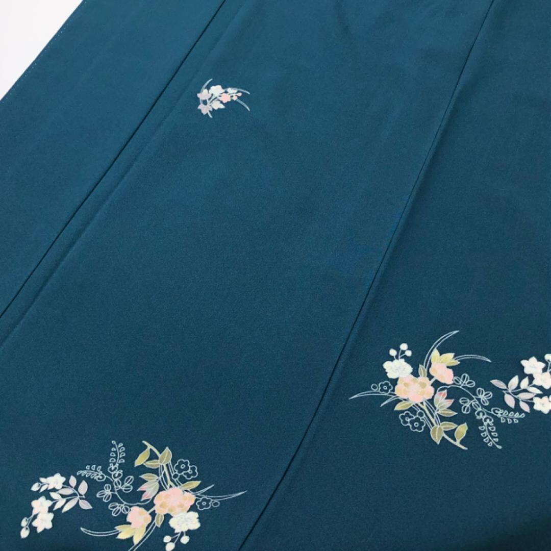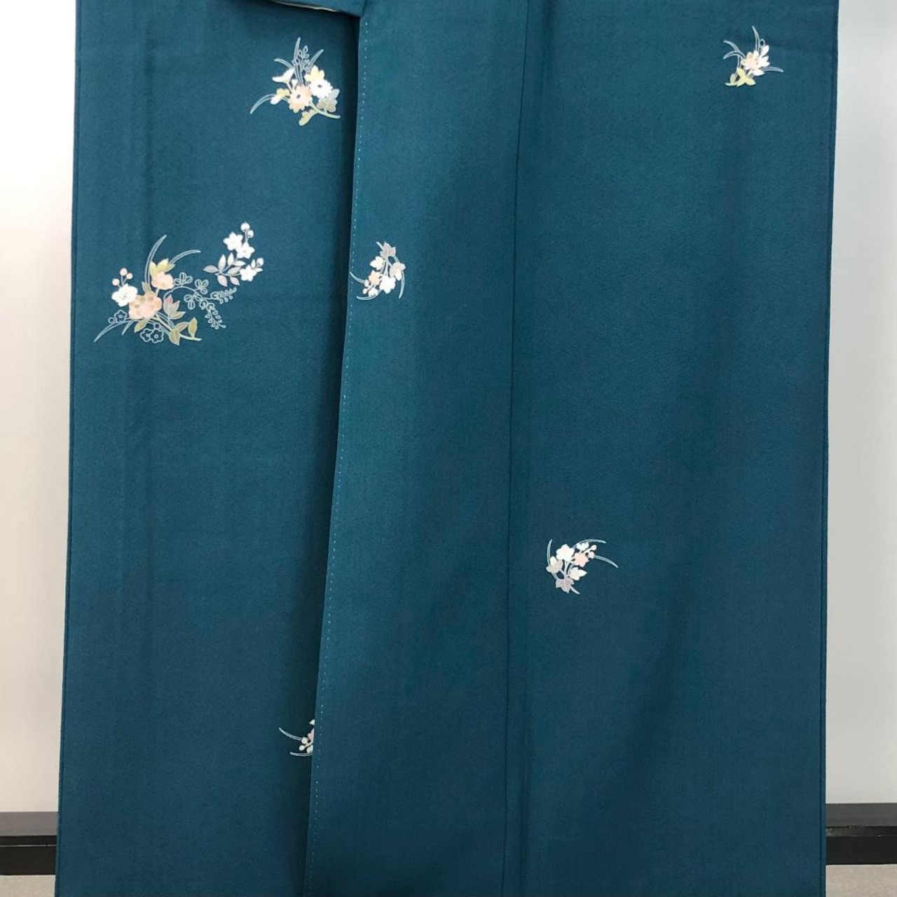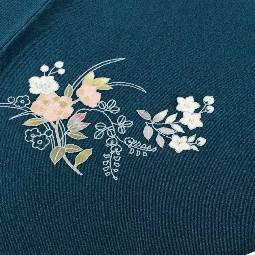 藍鉄色のお色味に飛び柄で花模様の柄裄がデザインされた素敵なお品でございます。