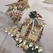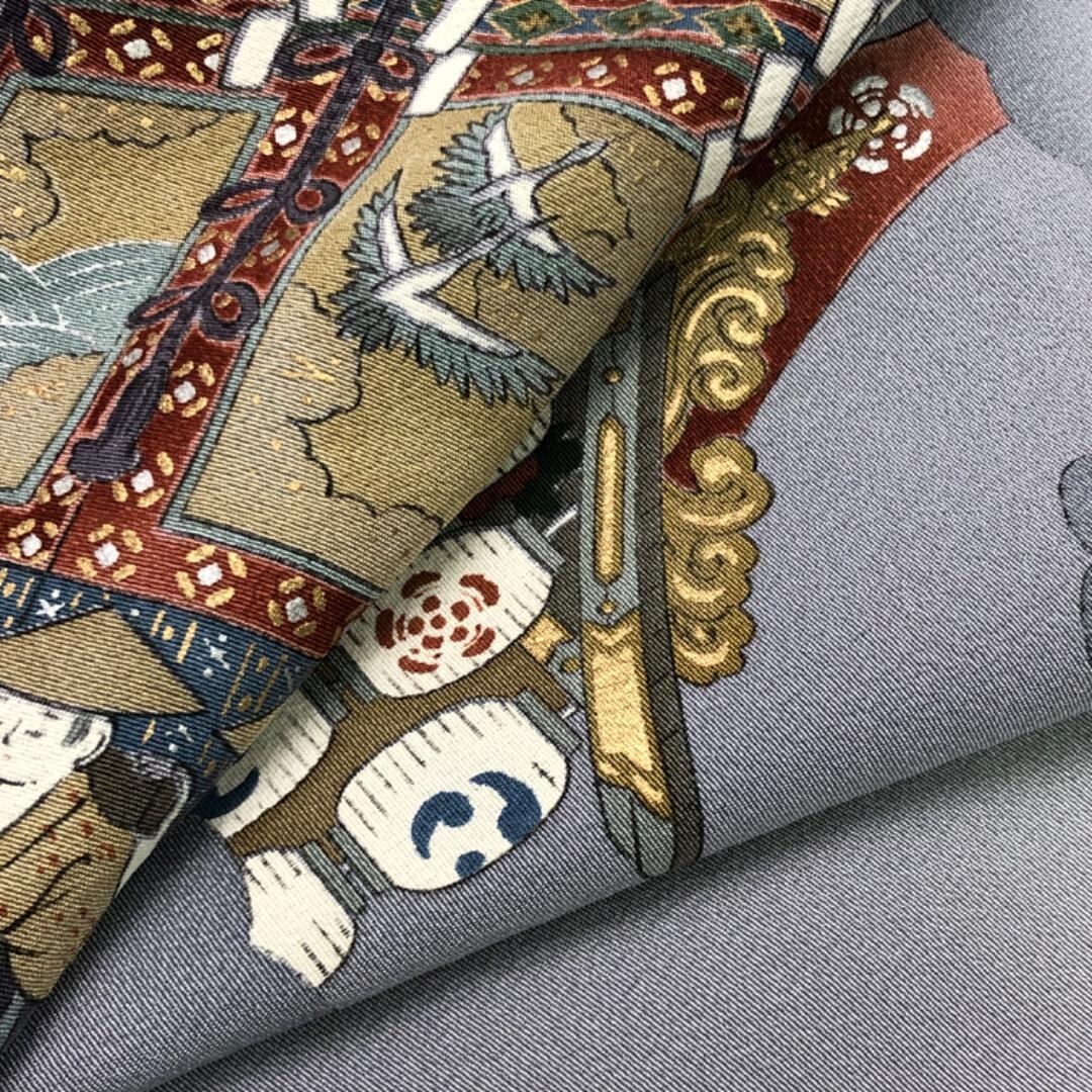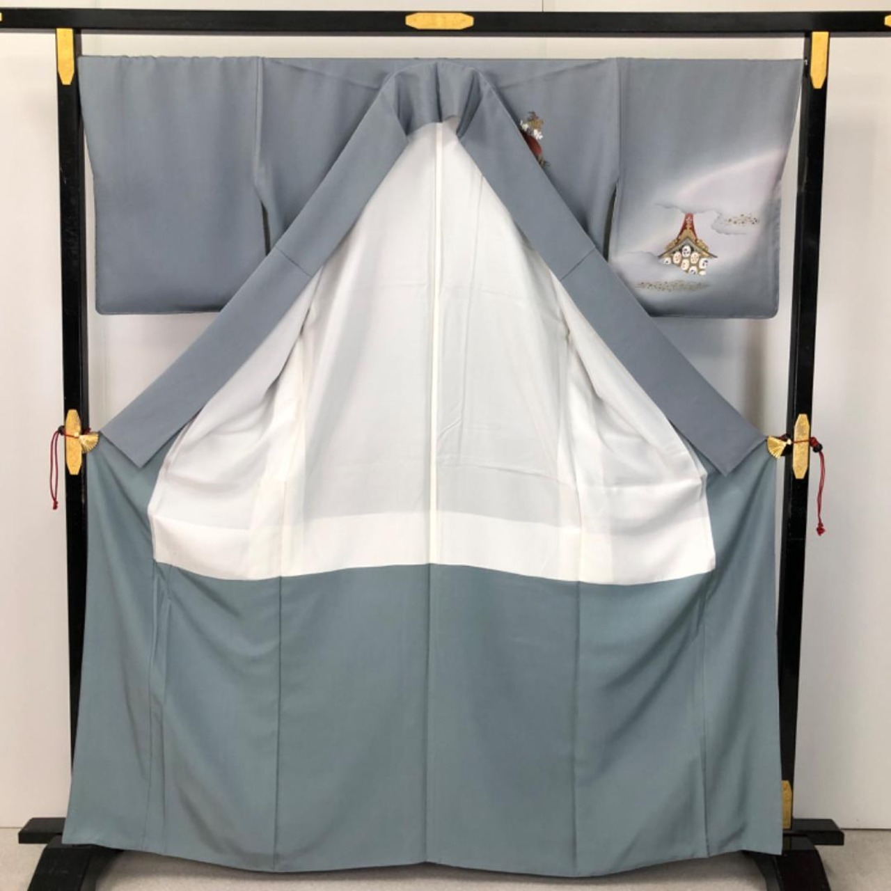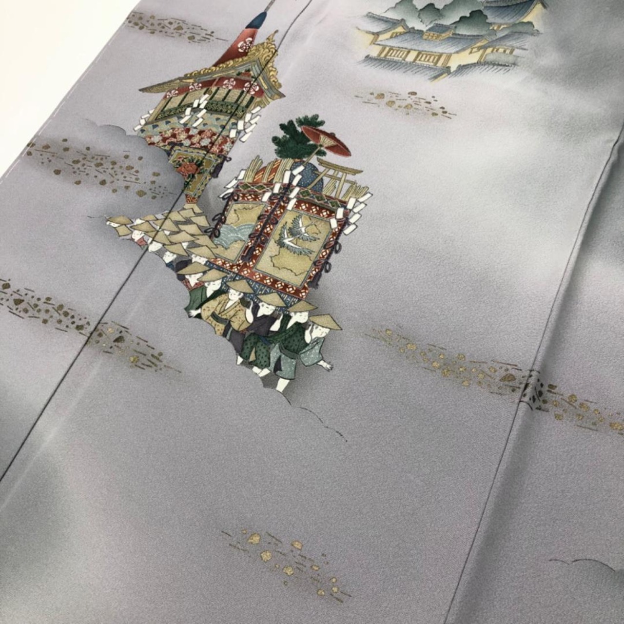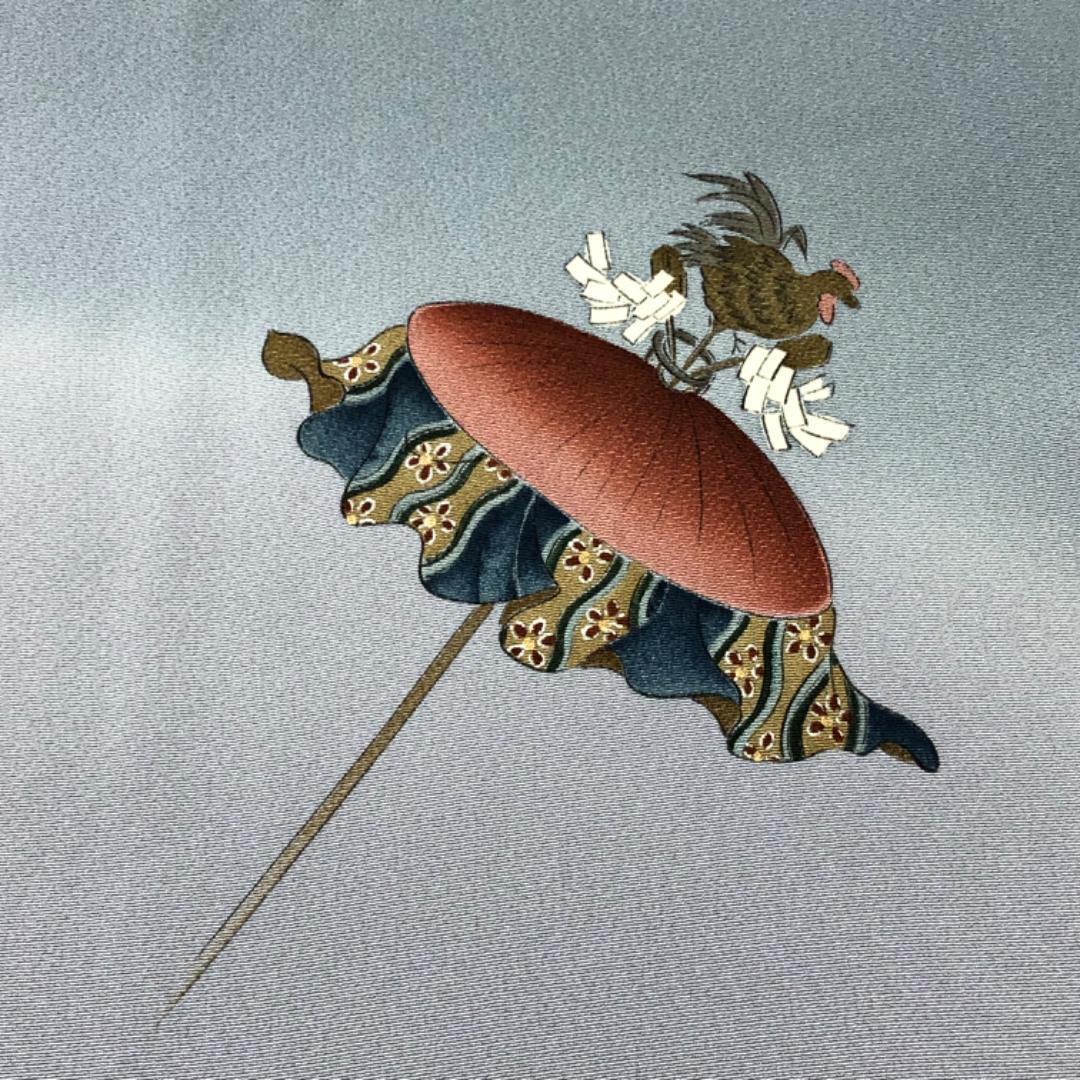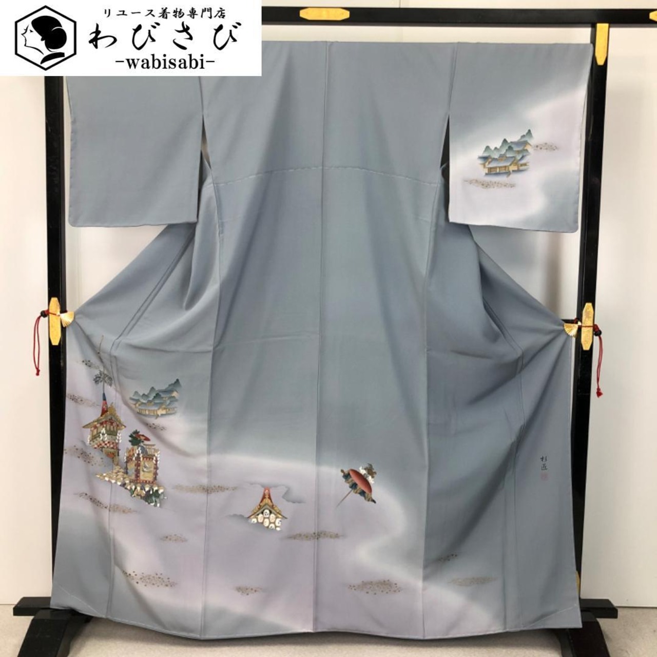 藍生壁色ベースのお色味に暈し、鉾などの風景柄がデザインされた素敵なお品でございます。
