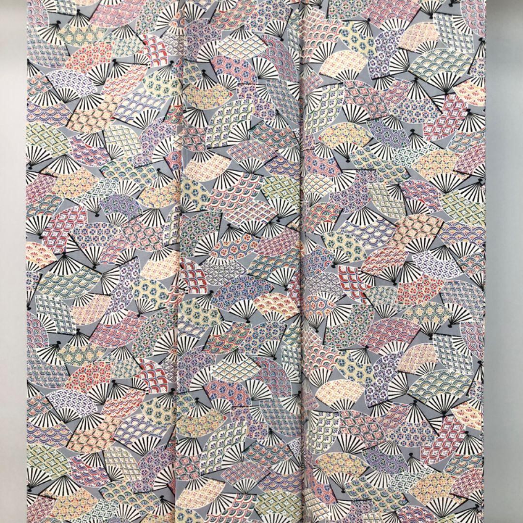 薄鈍色のお色味に扇子、花七宝に花亀甲などの色彩豊かな柄裄がデザインされた素敵なお品でございます。