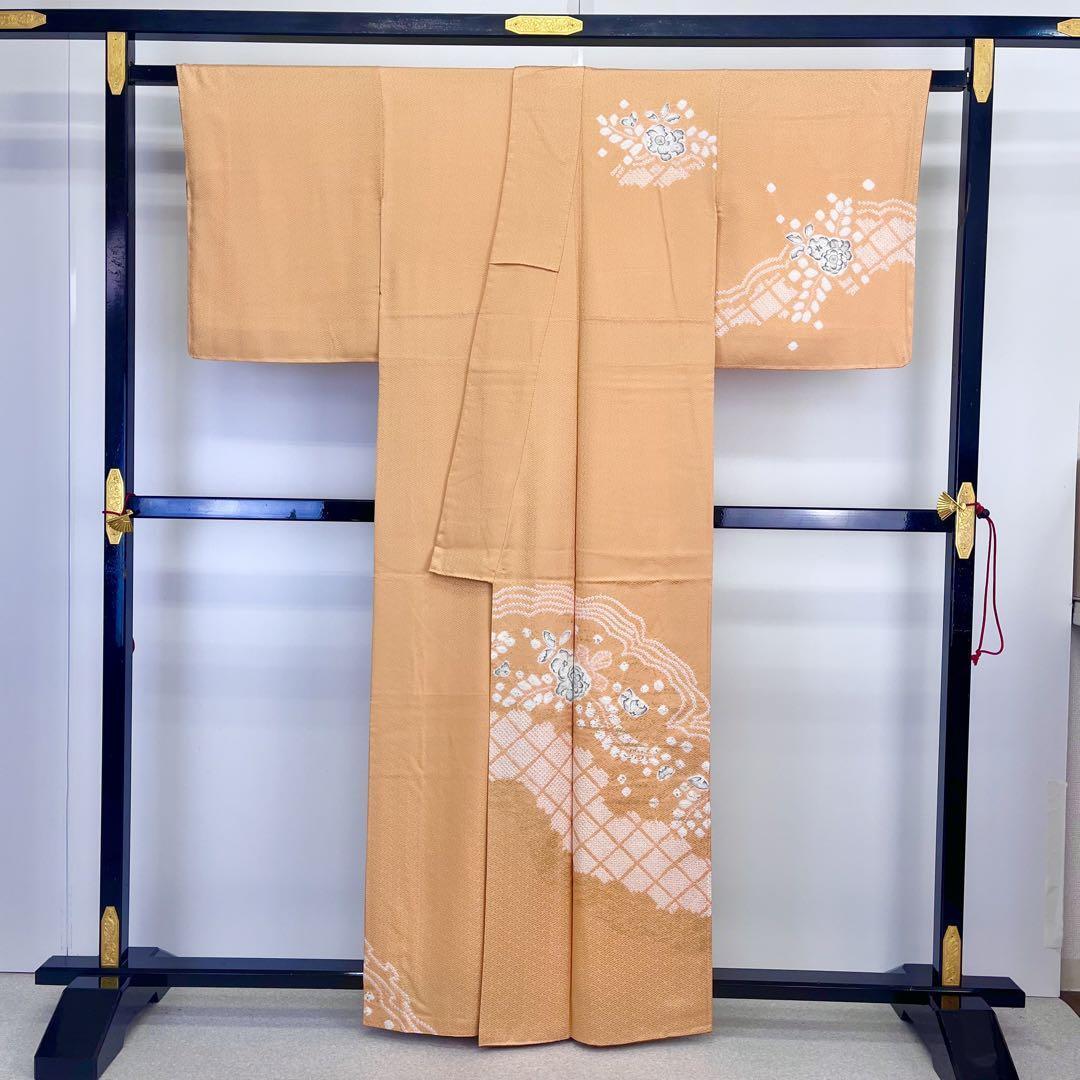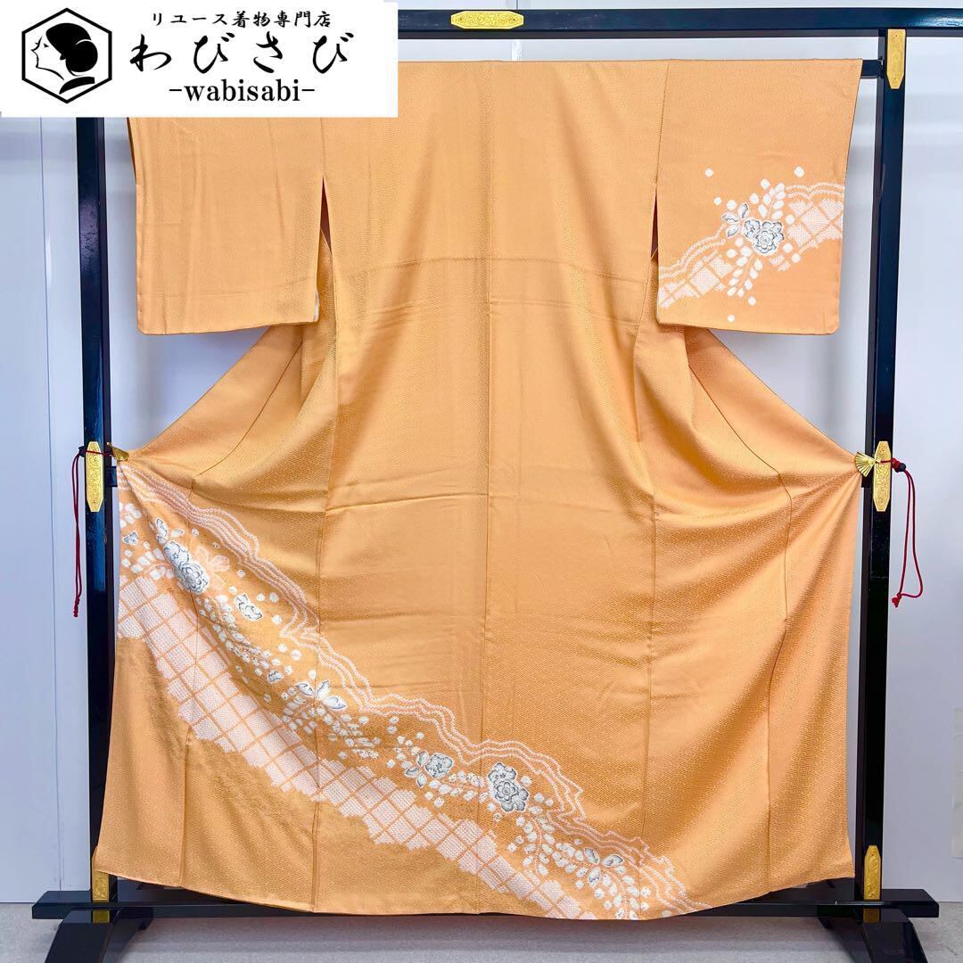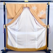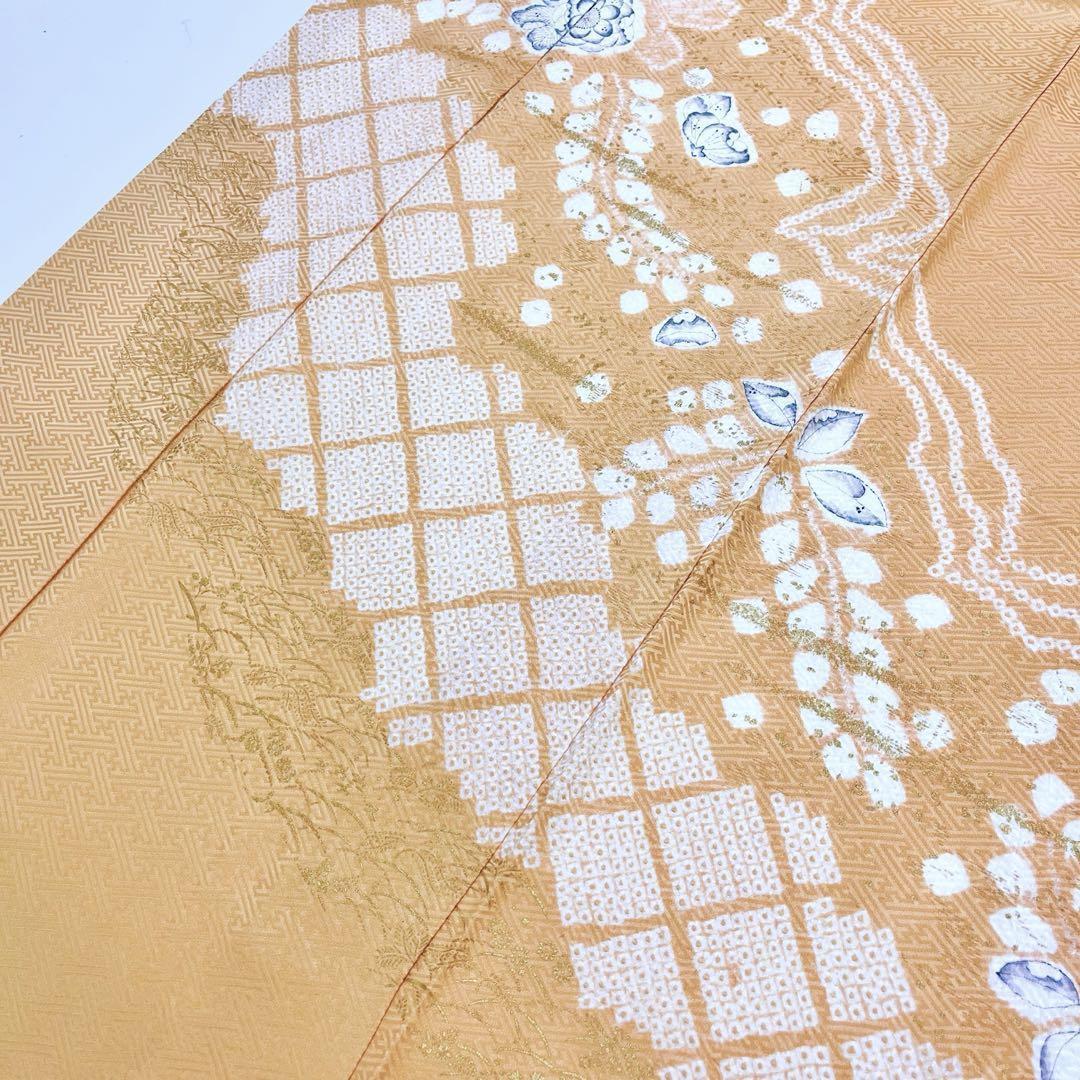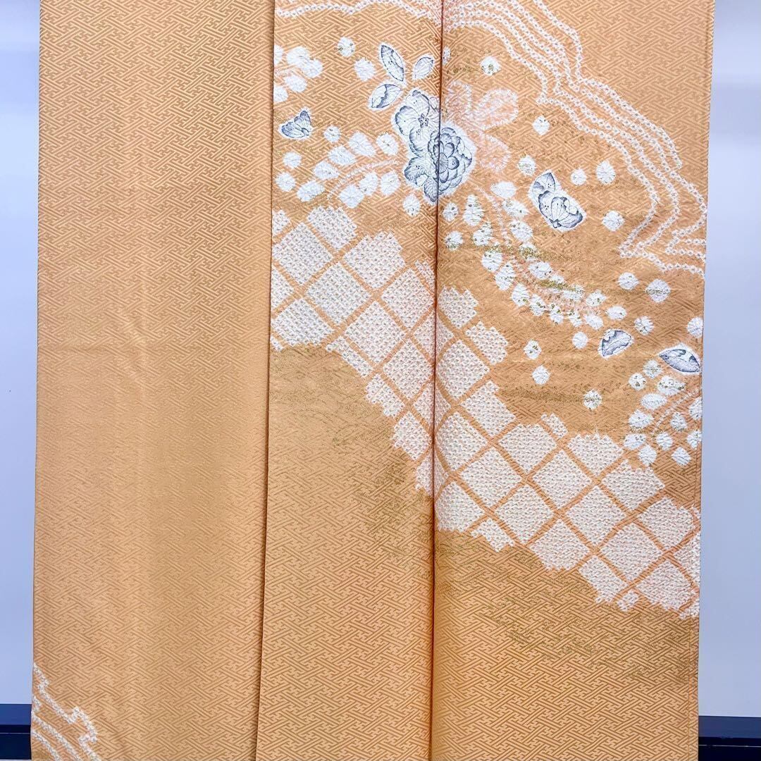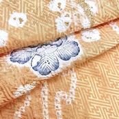 橙色ベースのお色味に紗綾形の地模様や金彩がデザインされた素敵なお品でございます。
