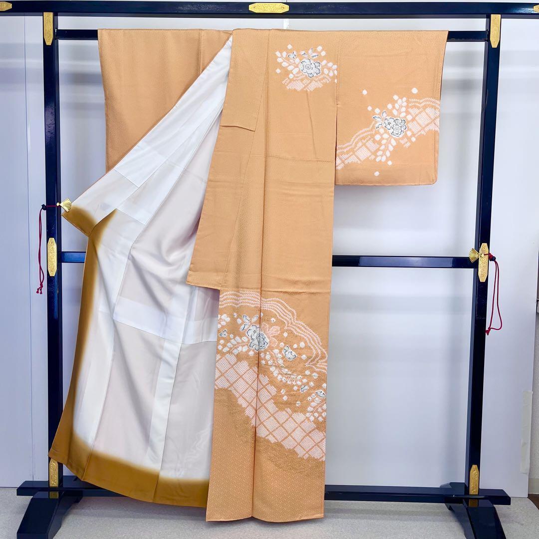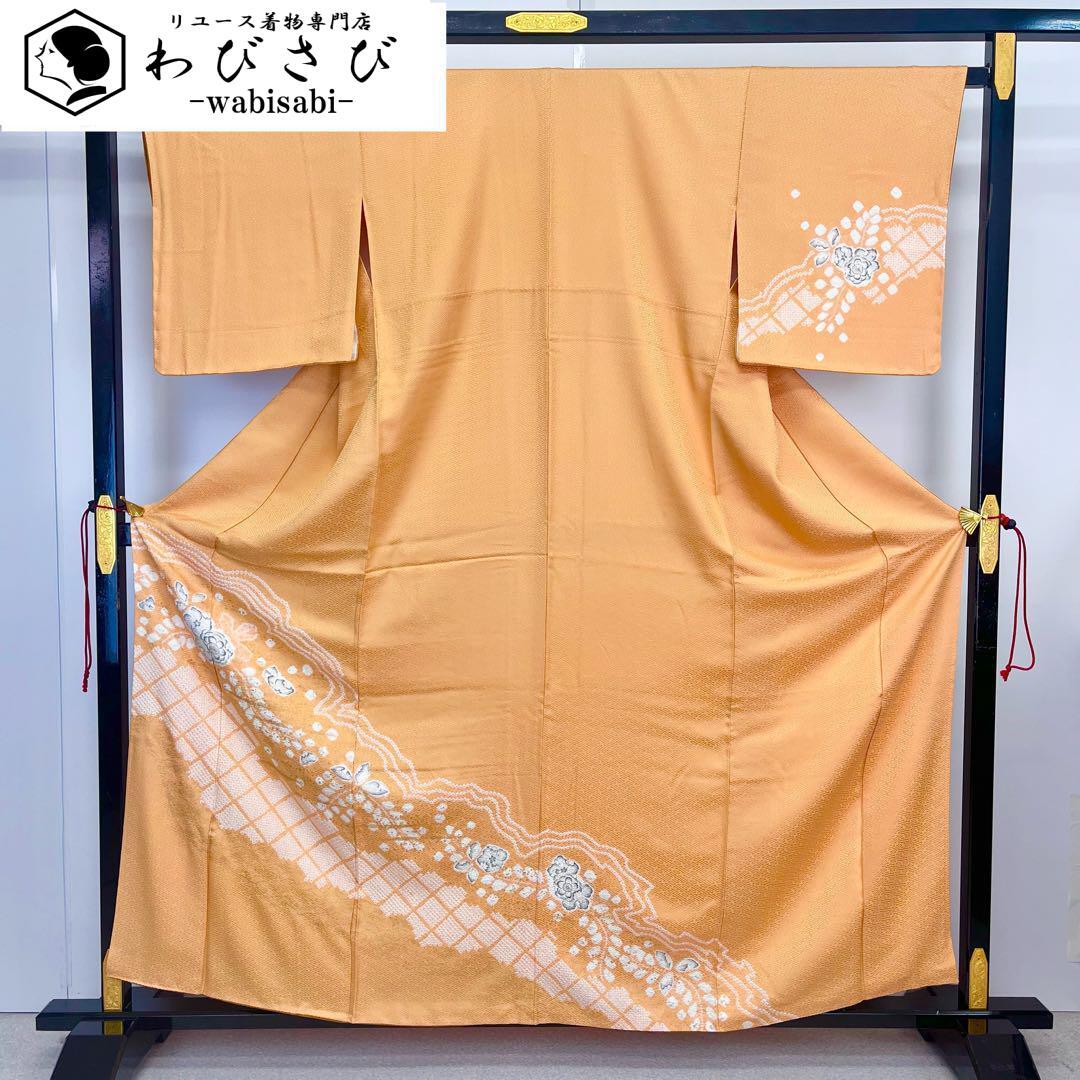 訪問着 辻が花絞り 鹿の子絞り 紗綾形模様 金彩 橙色 K-4189 着物 きもの kimono 和服 和装 中古 リサイクル着物 【送料無料】
