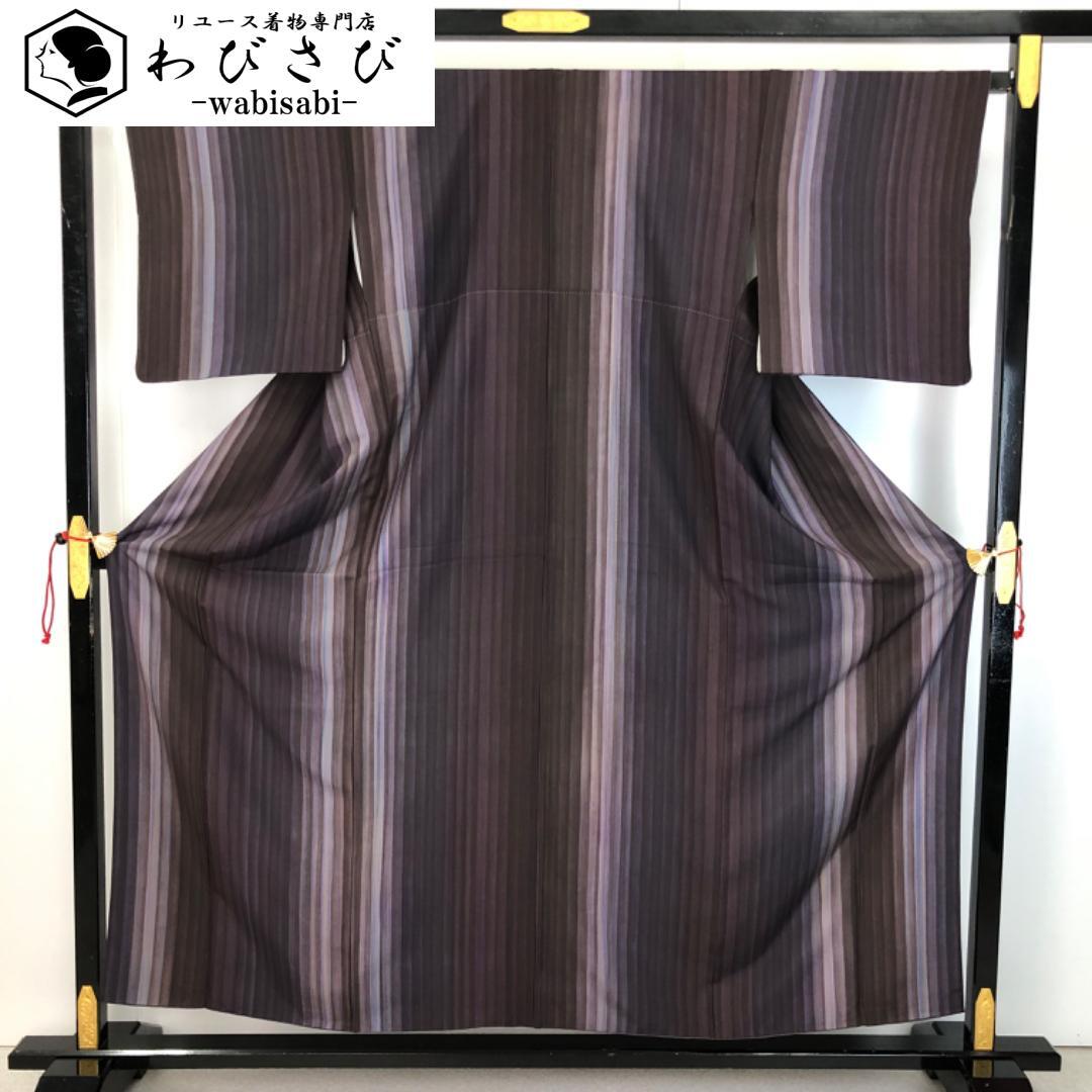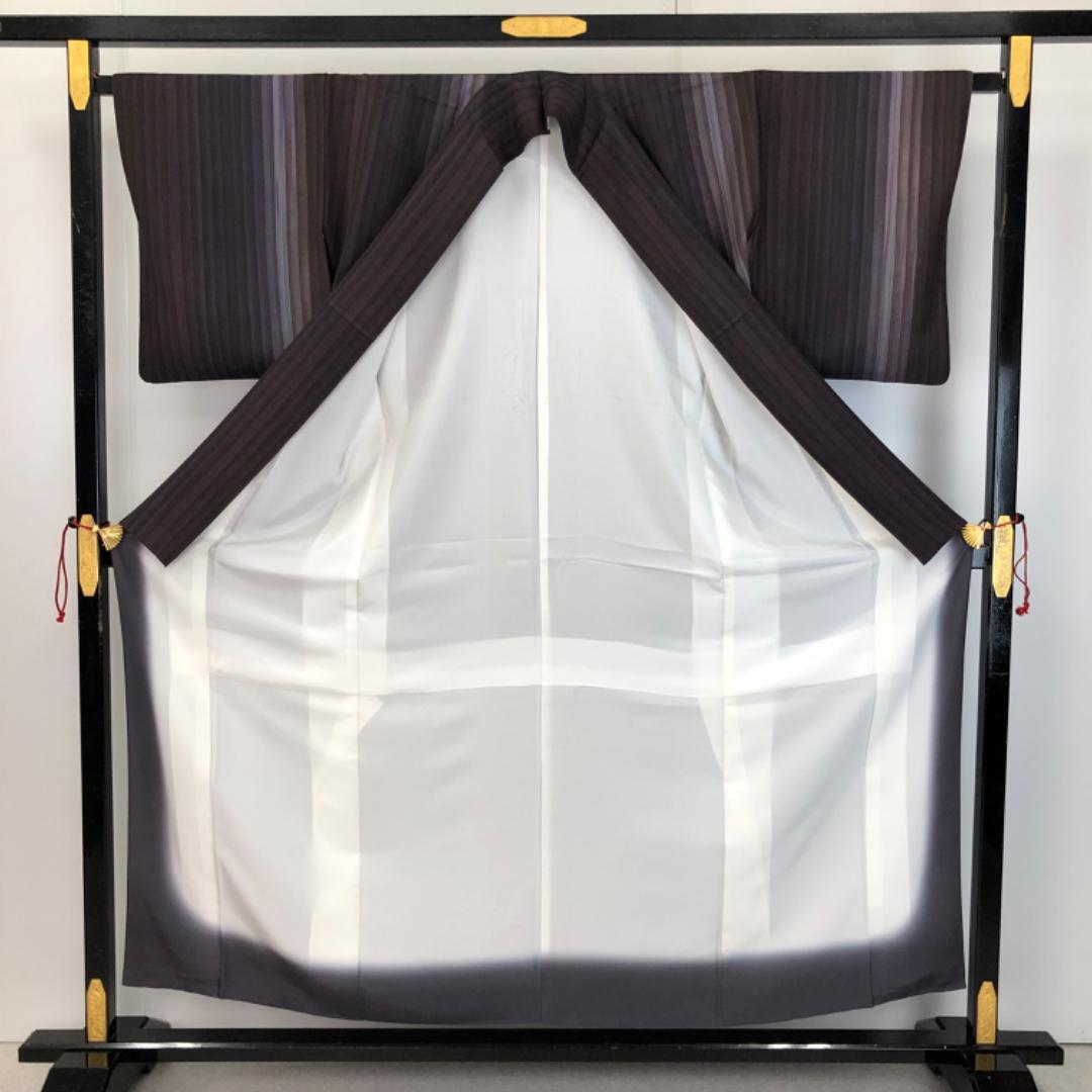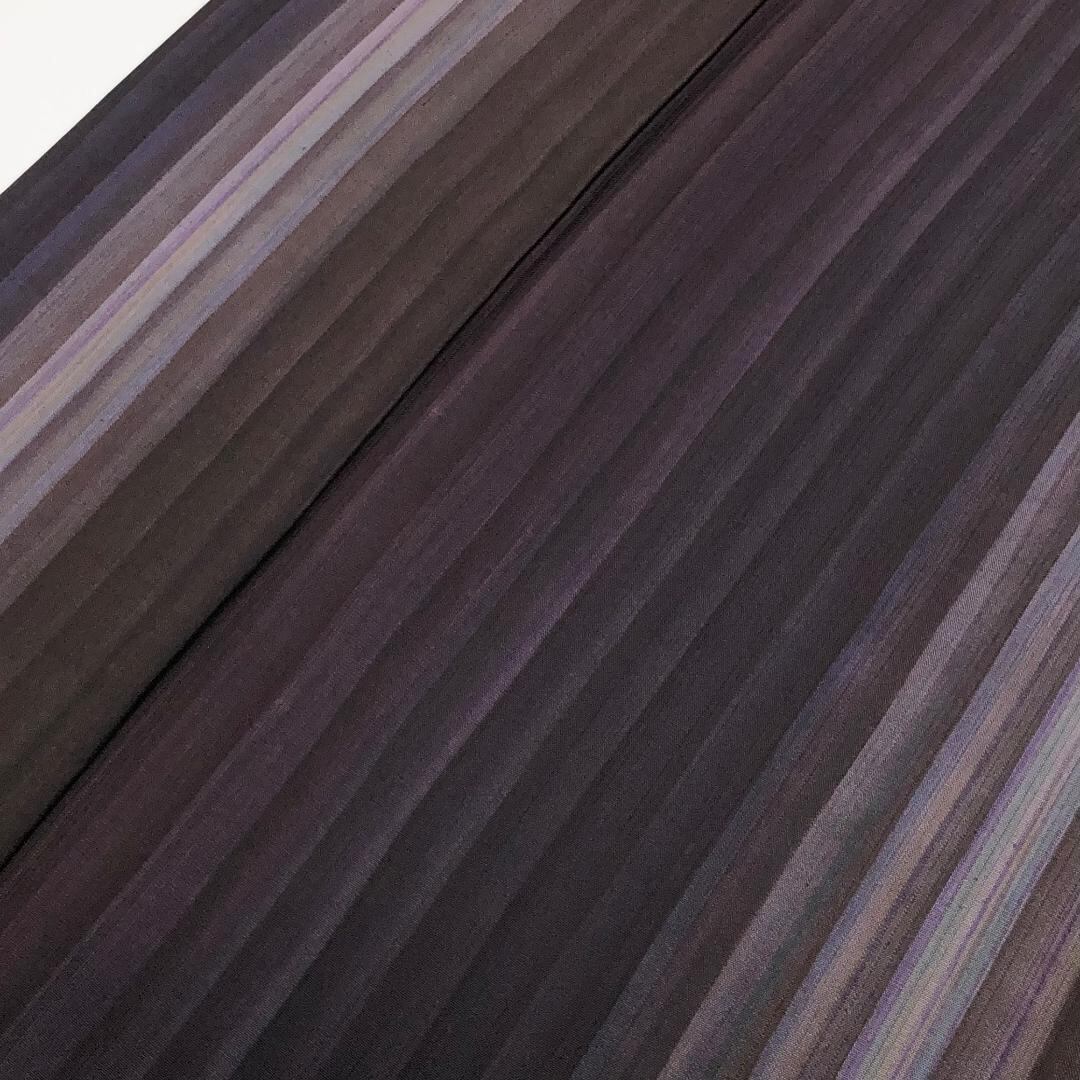 至極色ベースの落ち着きあるお色味のグラデーション、縦縞模様の柄裄がデザインされた素敵なお品でございます。