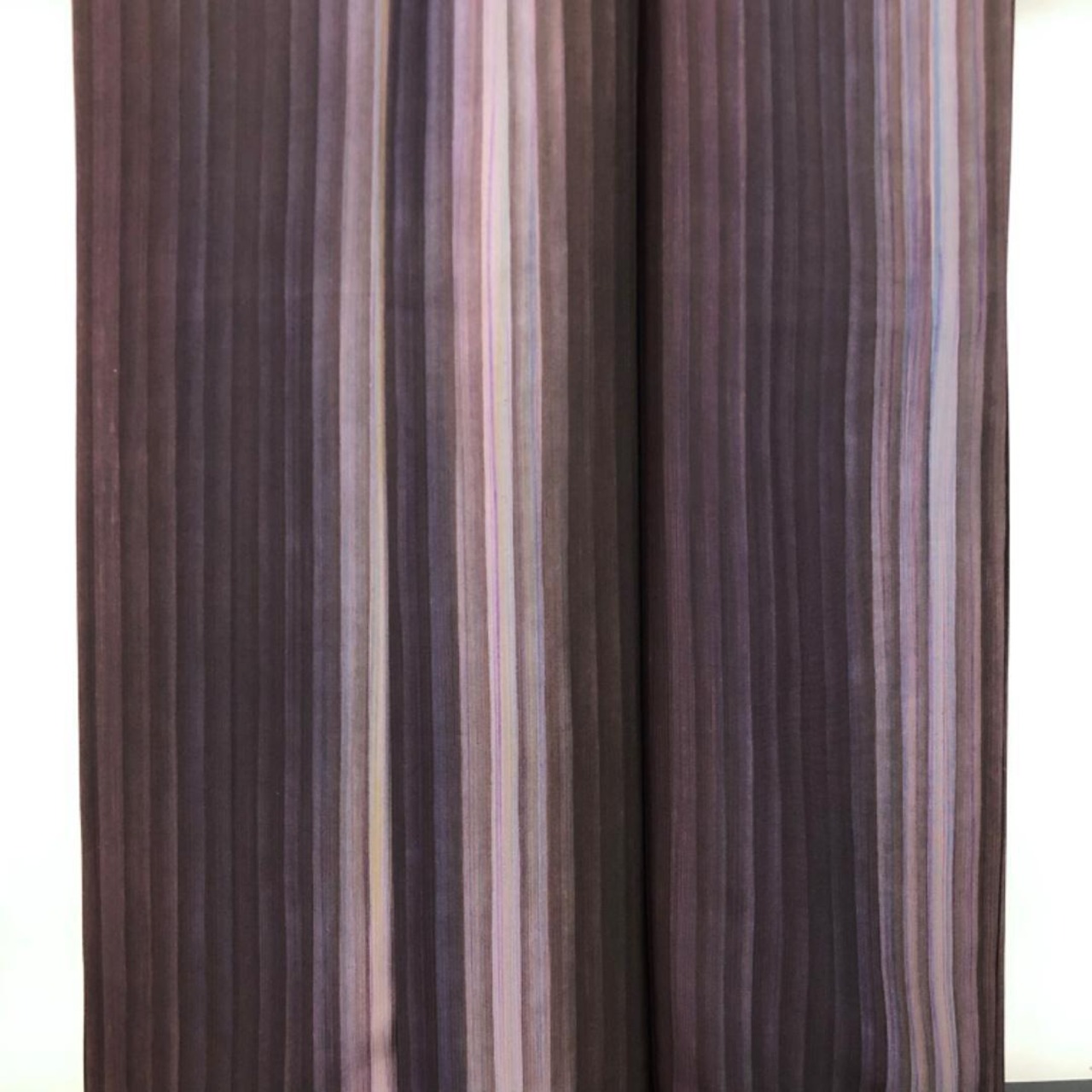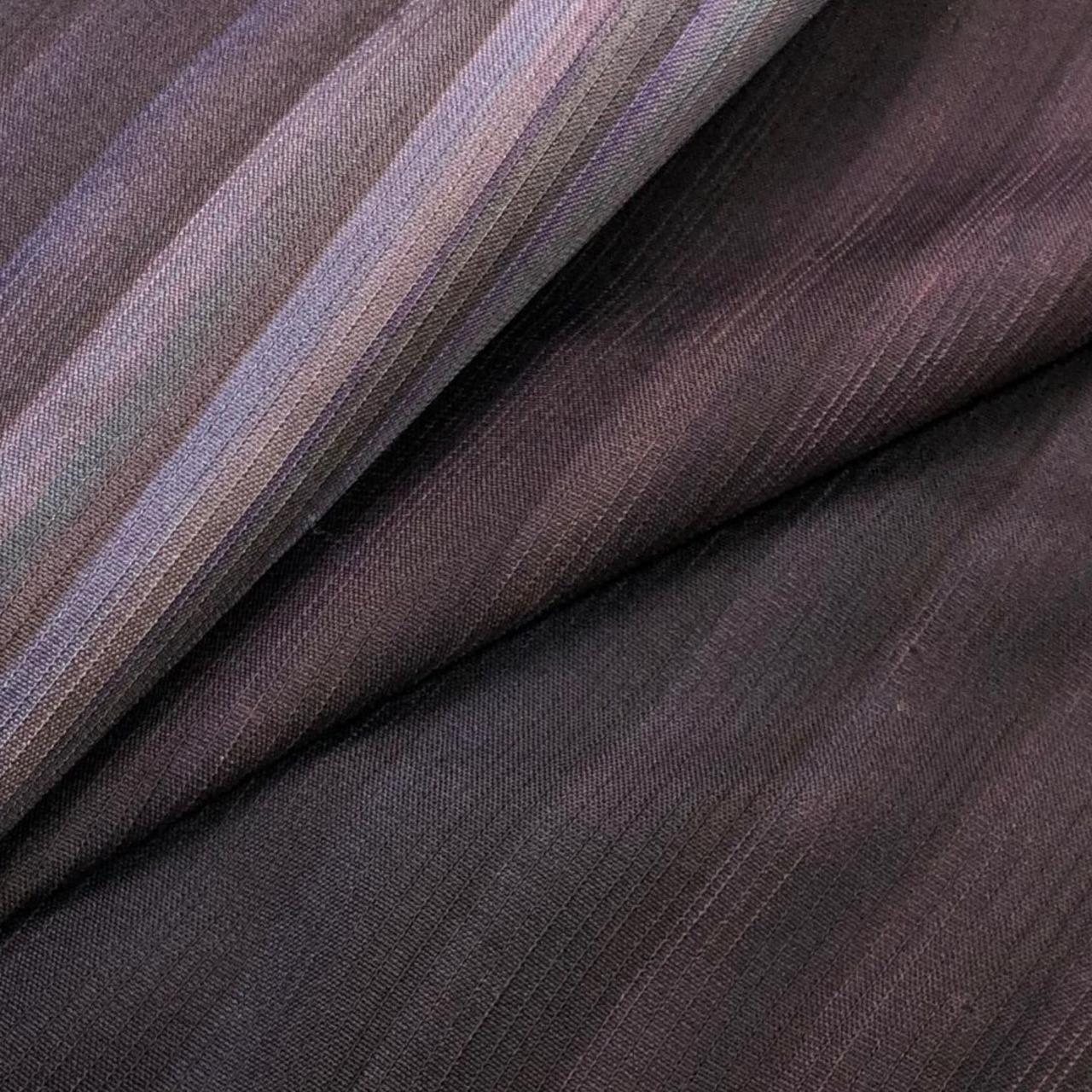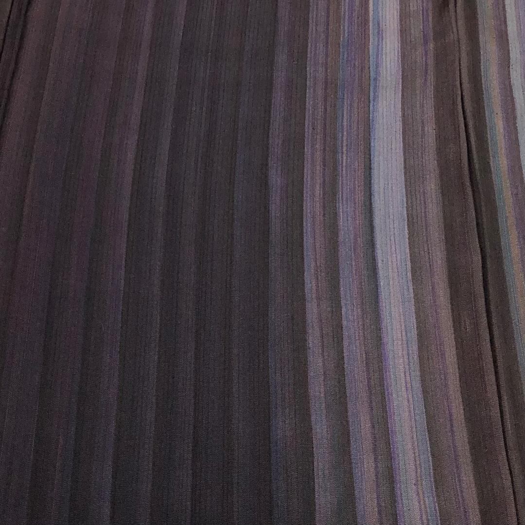至極色ベースの落ち着きあるお色味のグラデーション、縦縞模様の柄裄がデザインされた素敵なお品でございます。