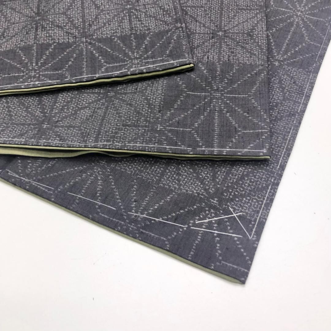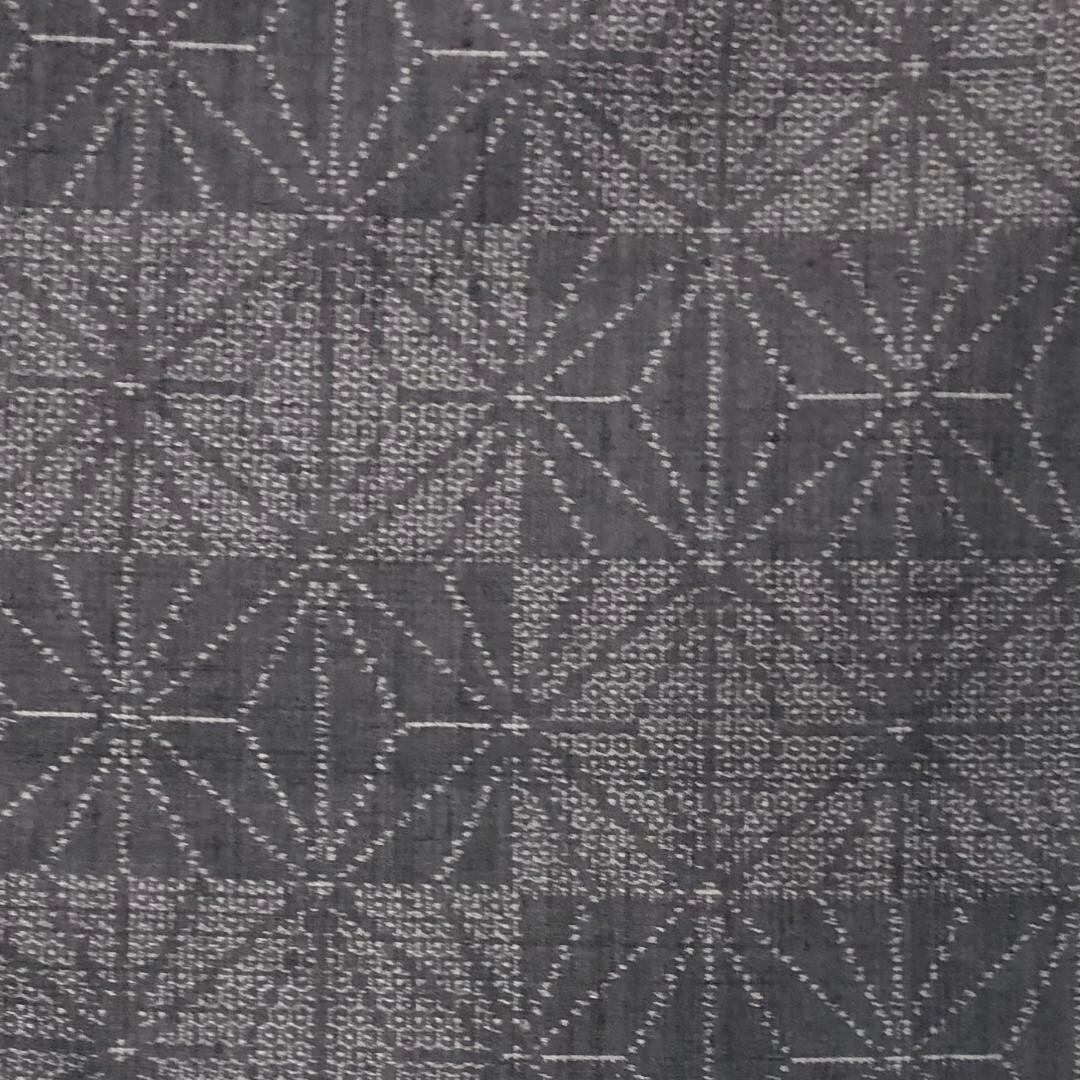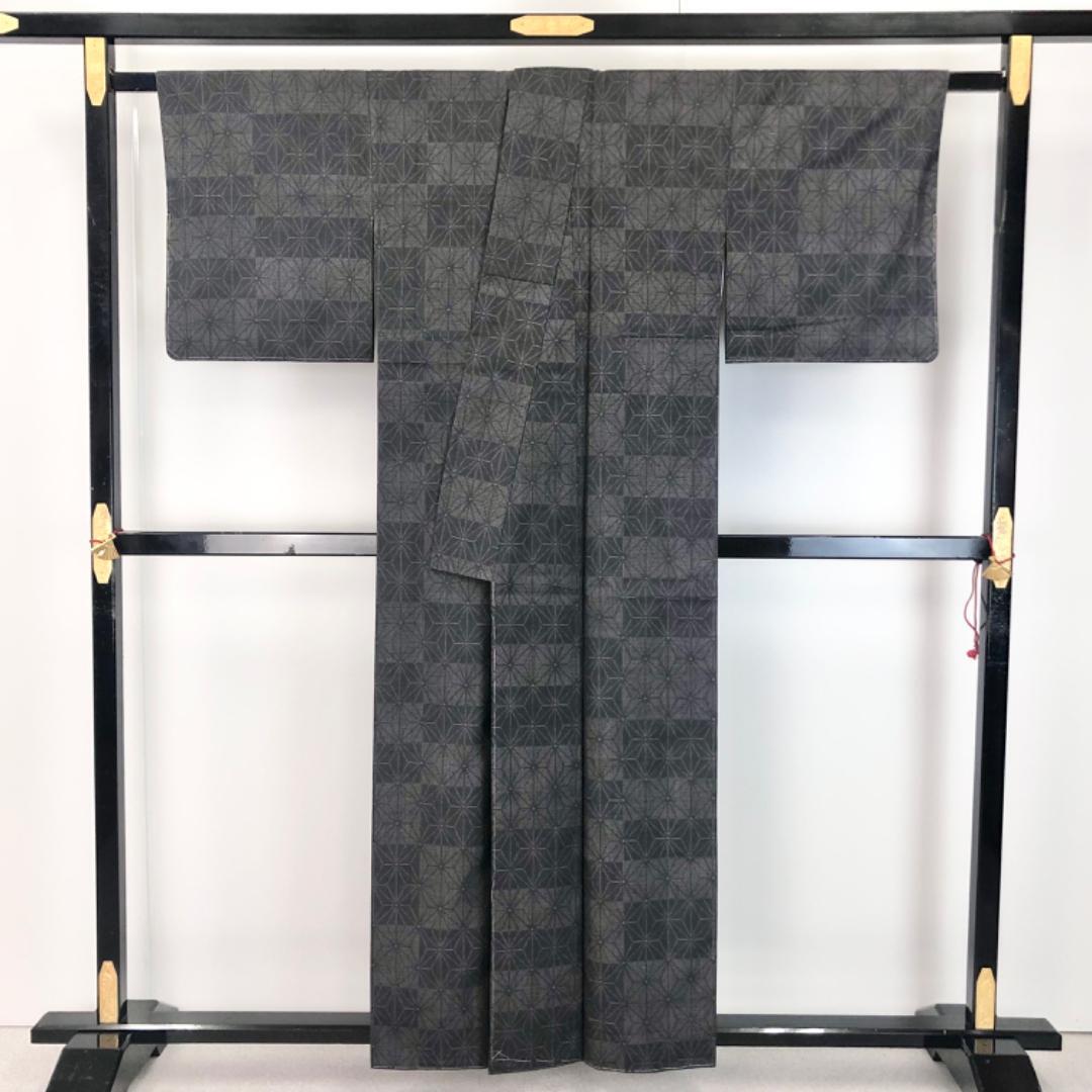 黝色のお色味に麻の葉模様の柄裄がデザインされた雰囲気の良い素敵なお品でございます。