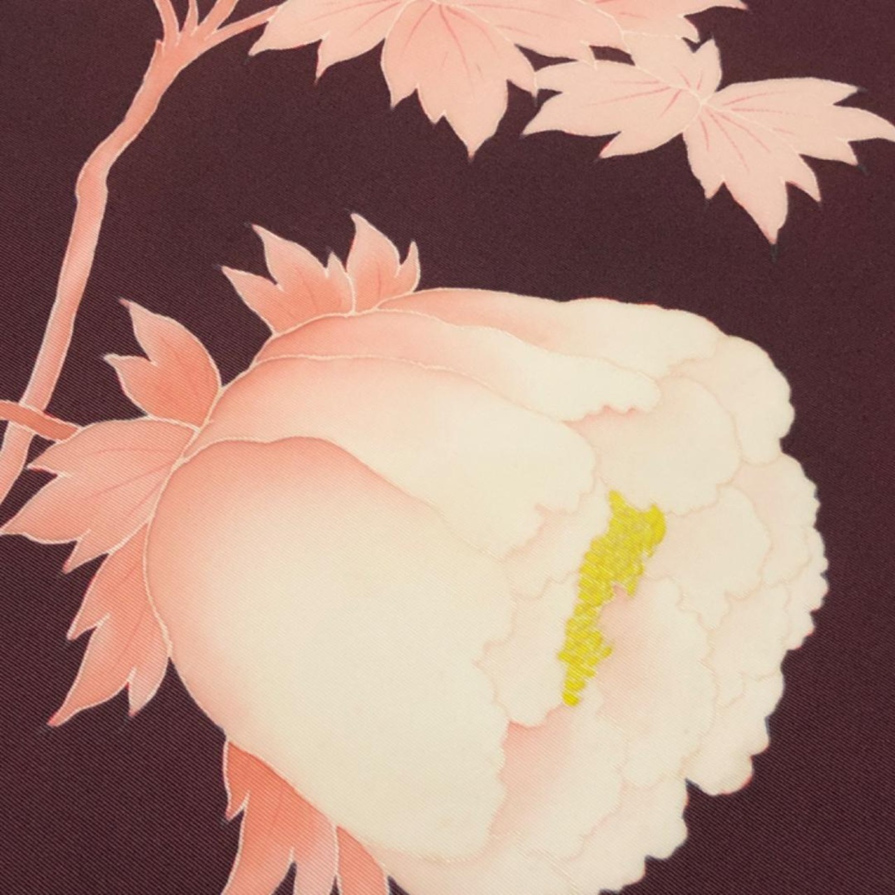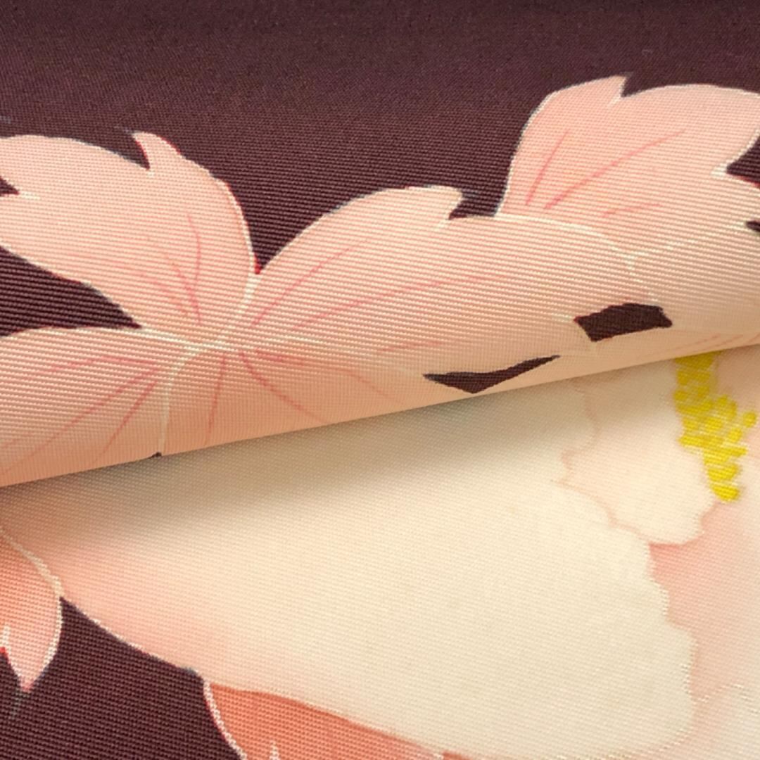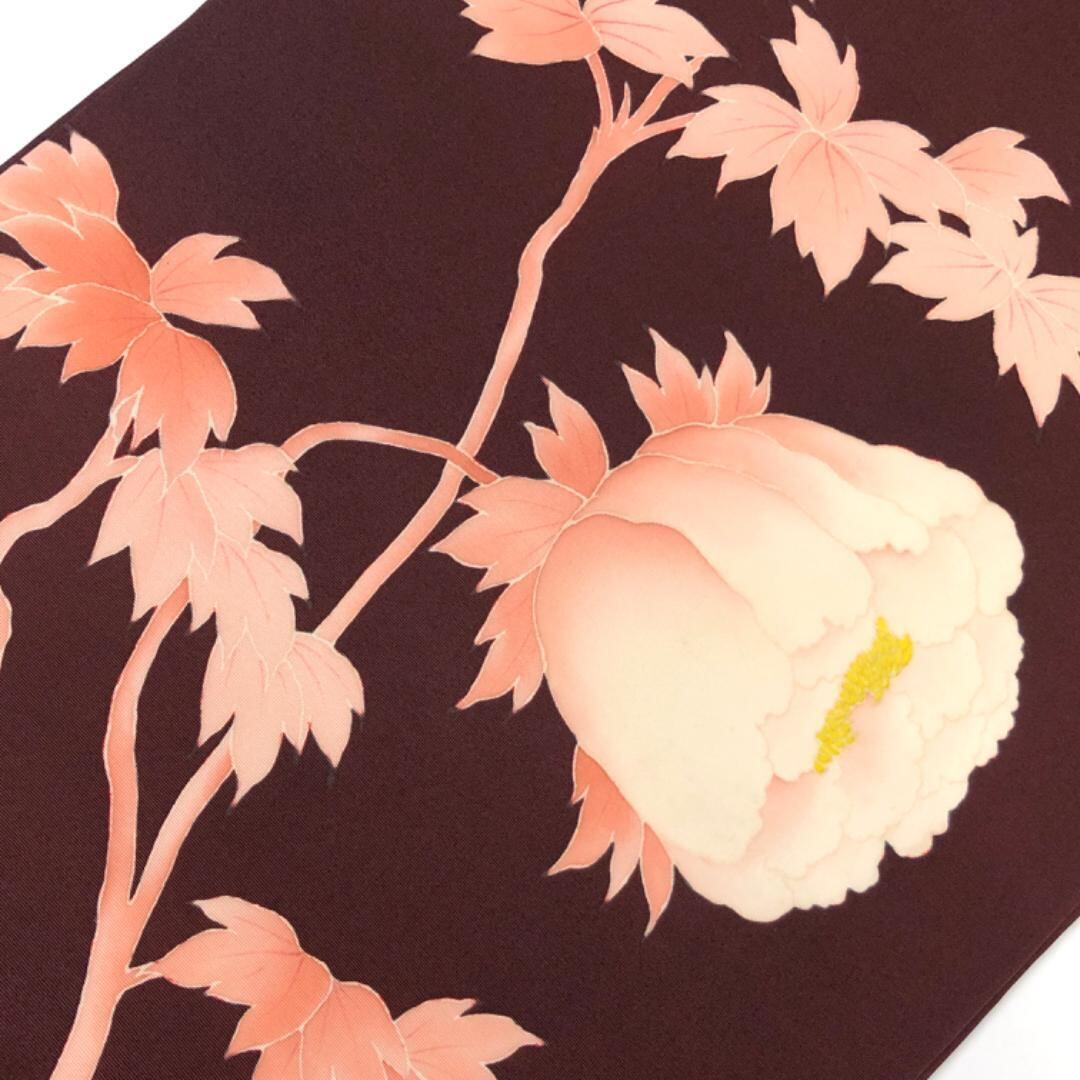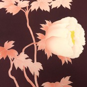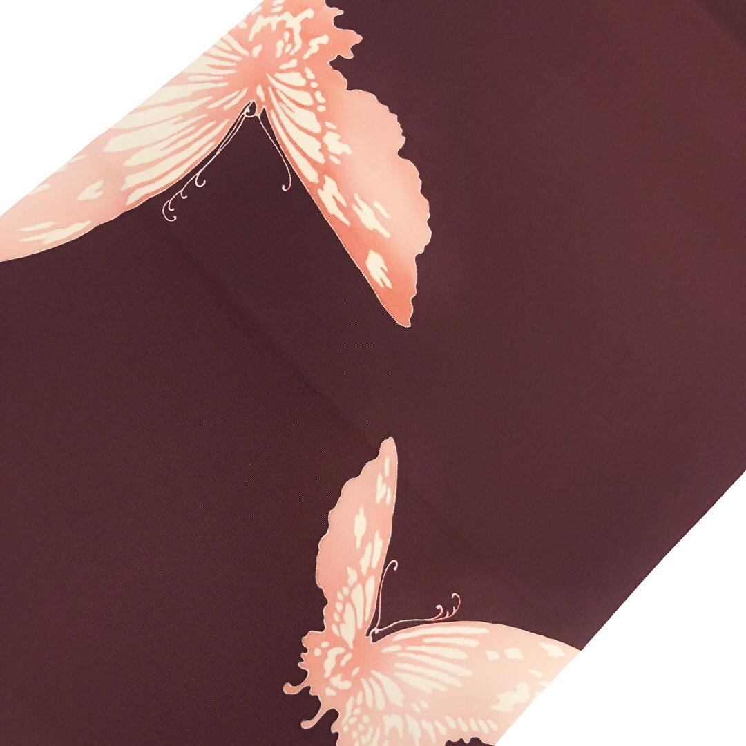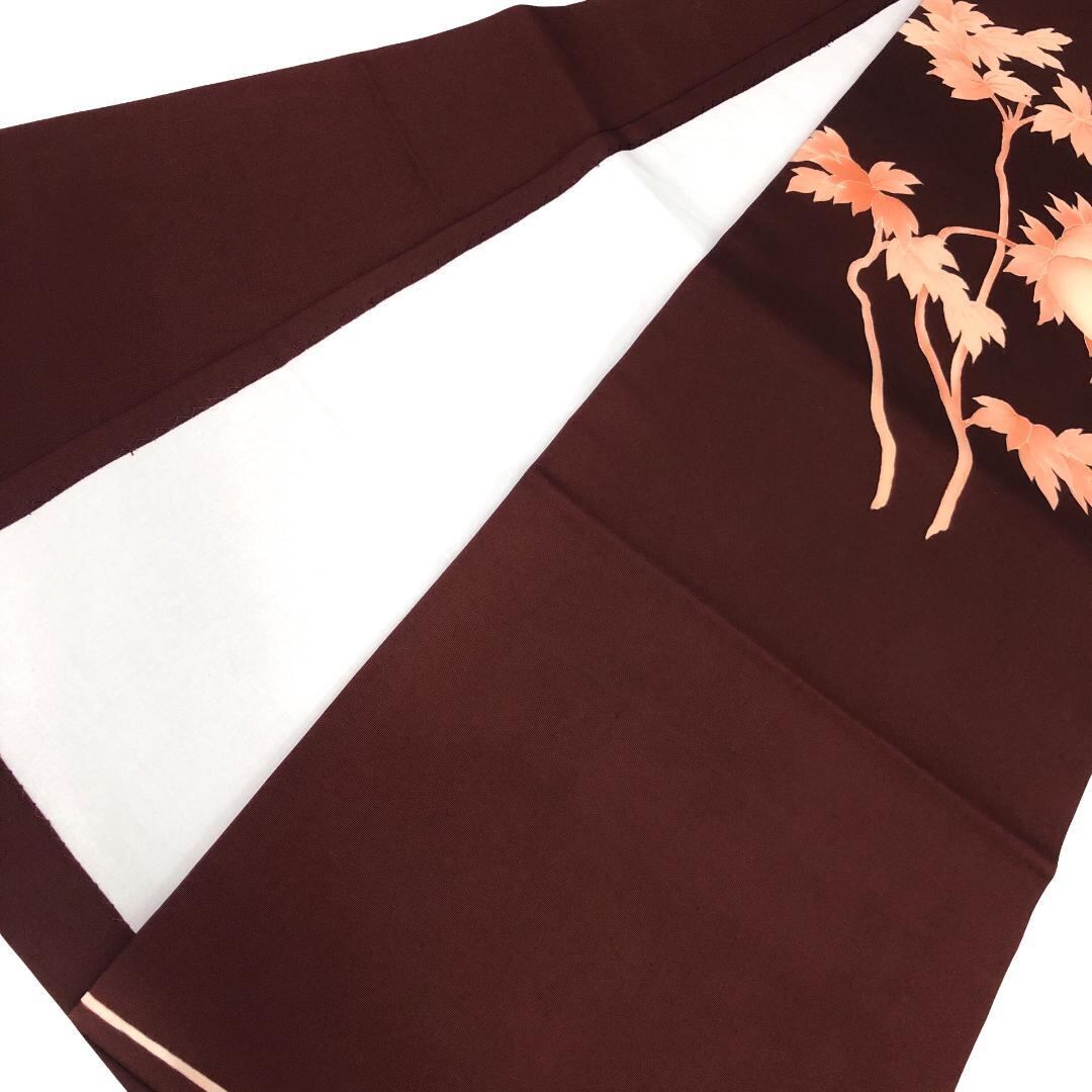 黒紅色の落ち着きのあるお色味の塩瀬に花柄模様、前柄に蝶々がデザインされた素敵な柄裄のお品でございます。