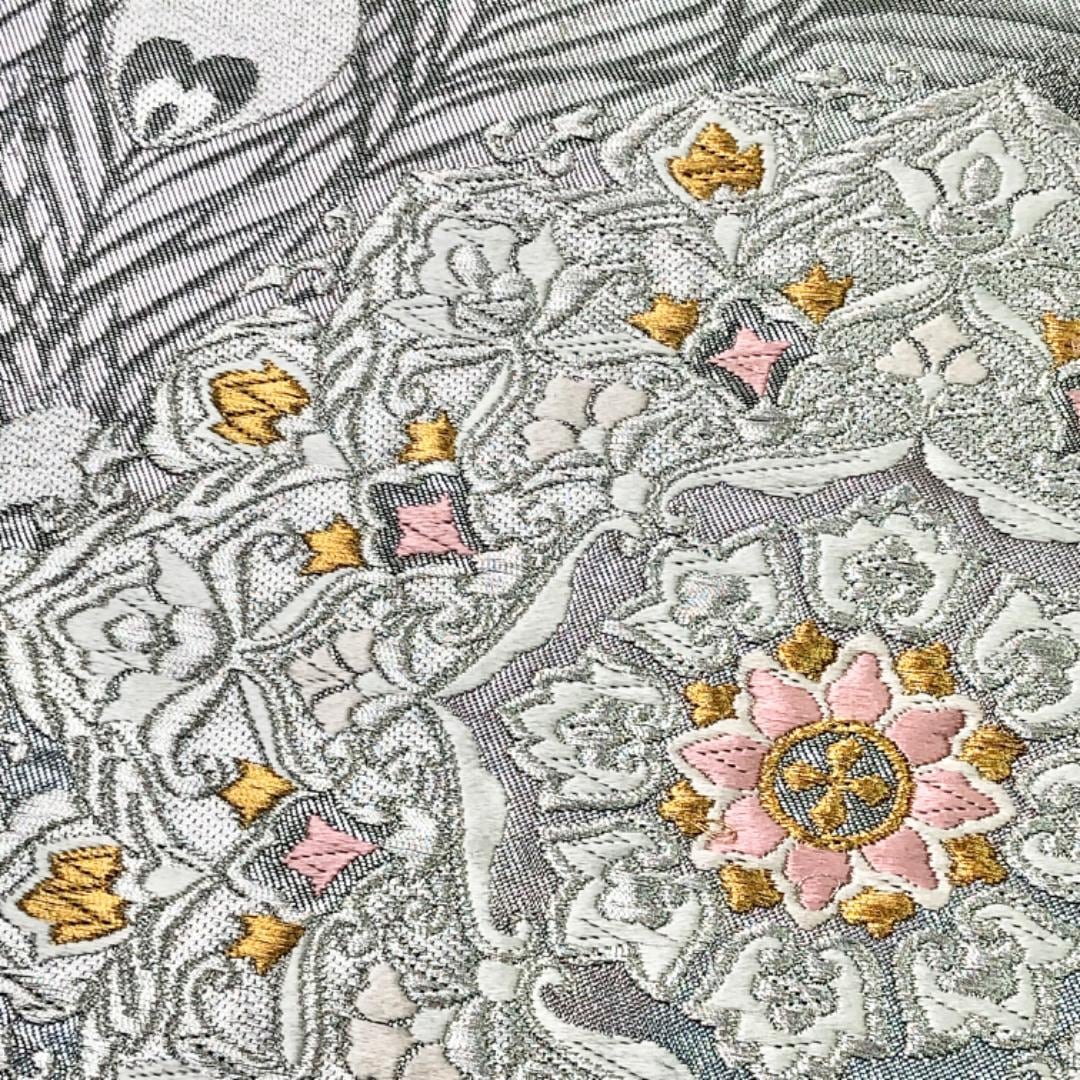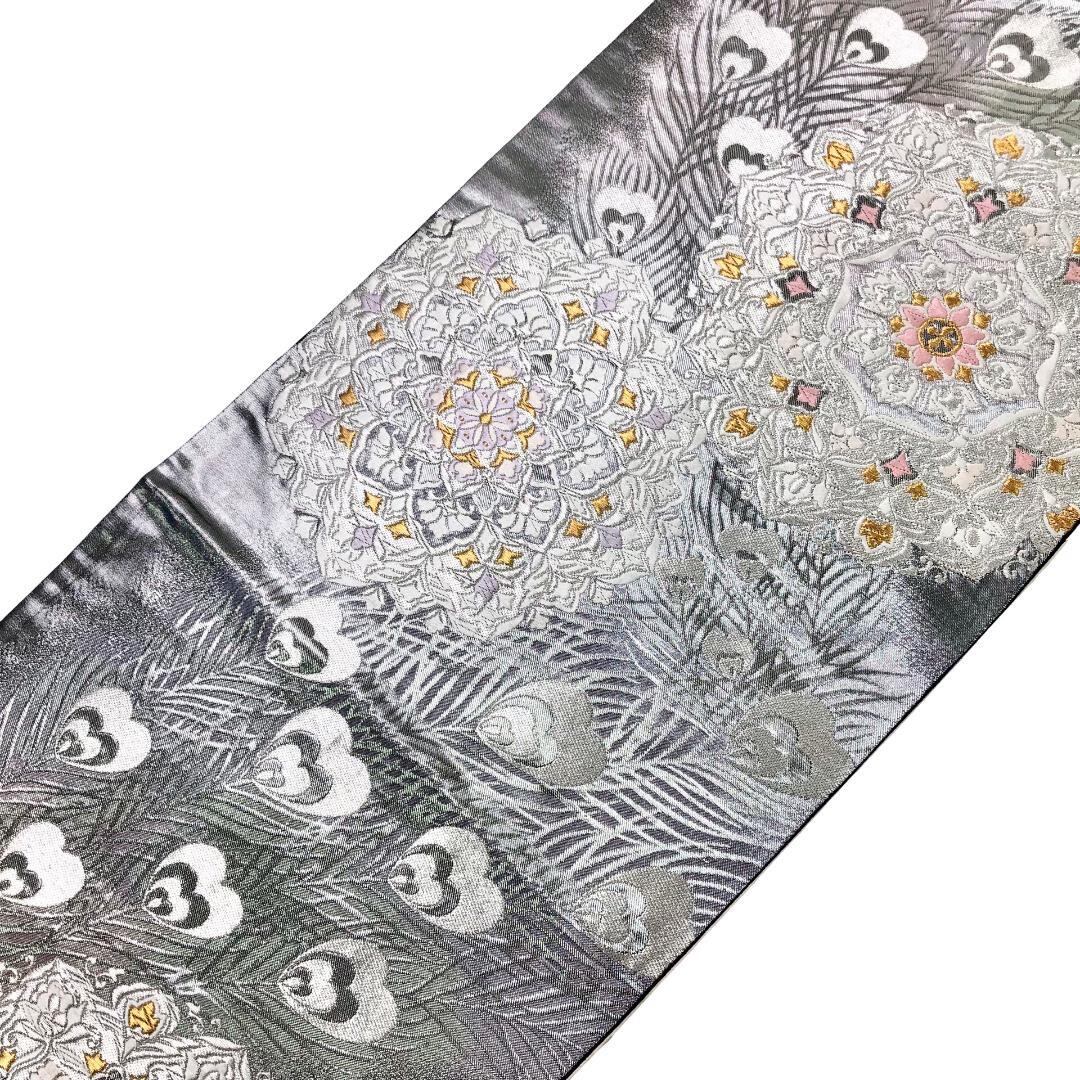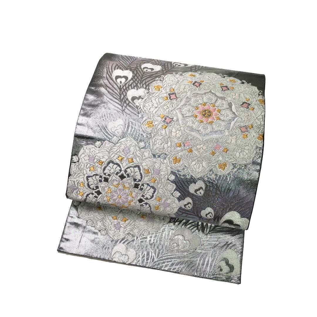 銀色ベースの煌びやかなお色味に美しい孔雀の羽、華模様がデザインされた素敵なお品でございます。