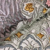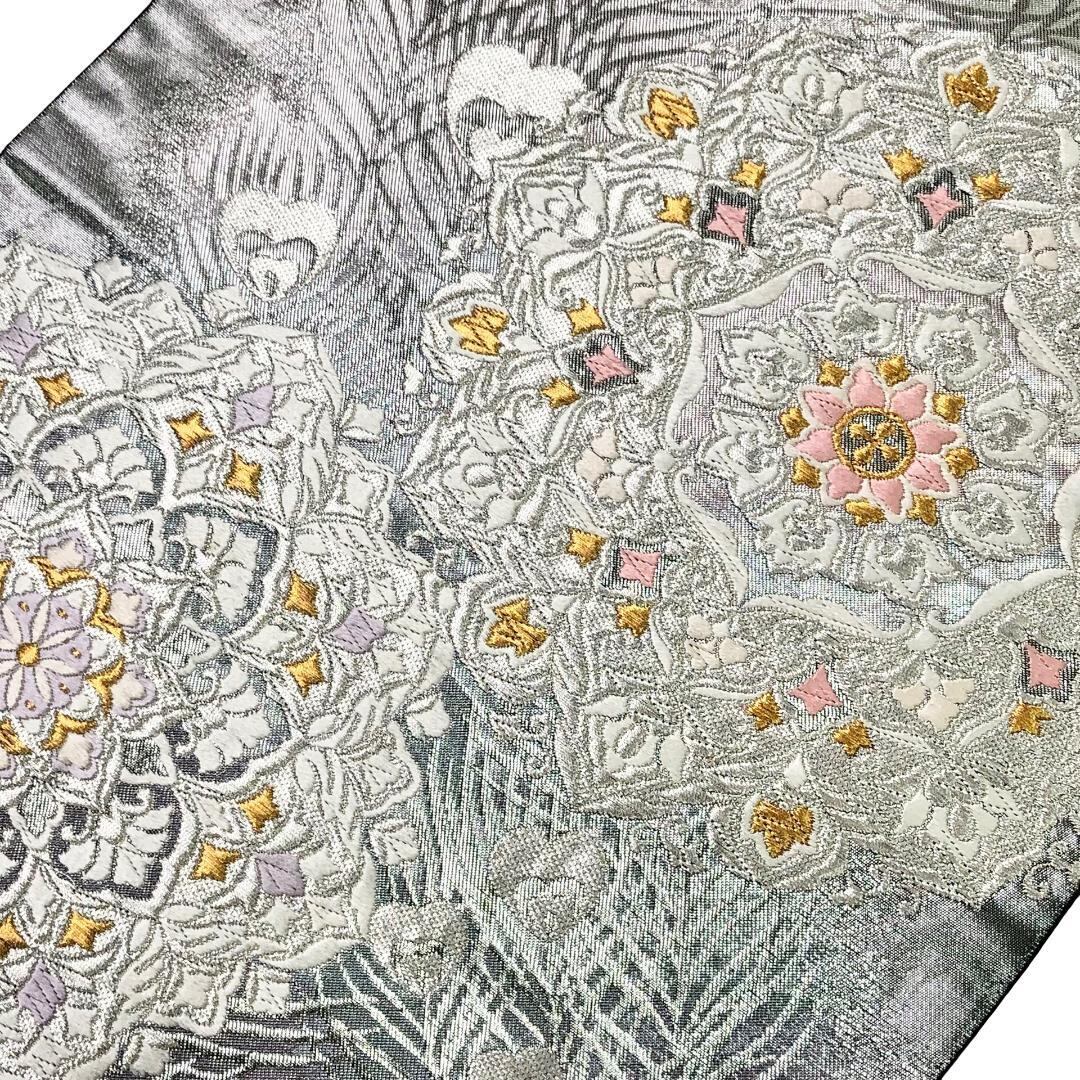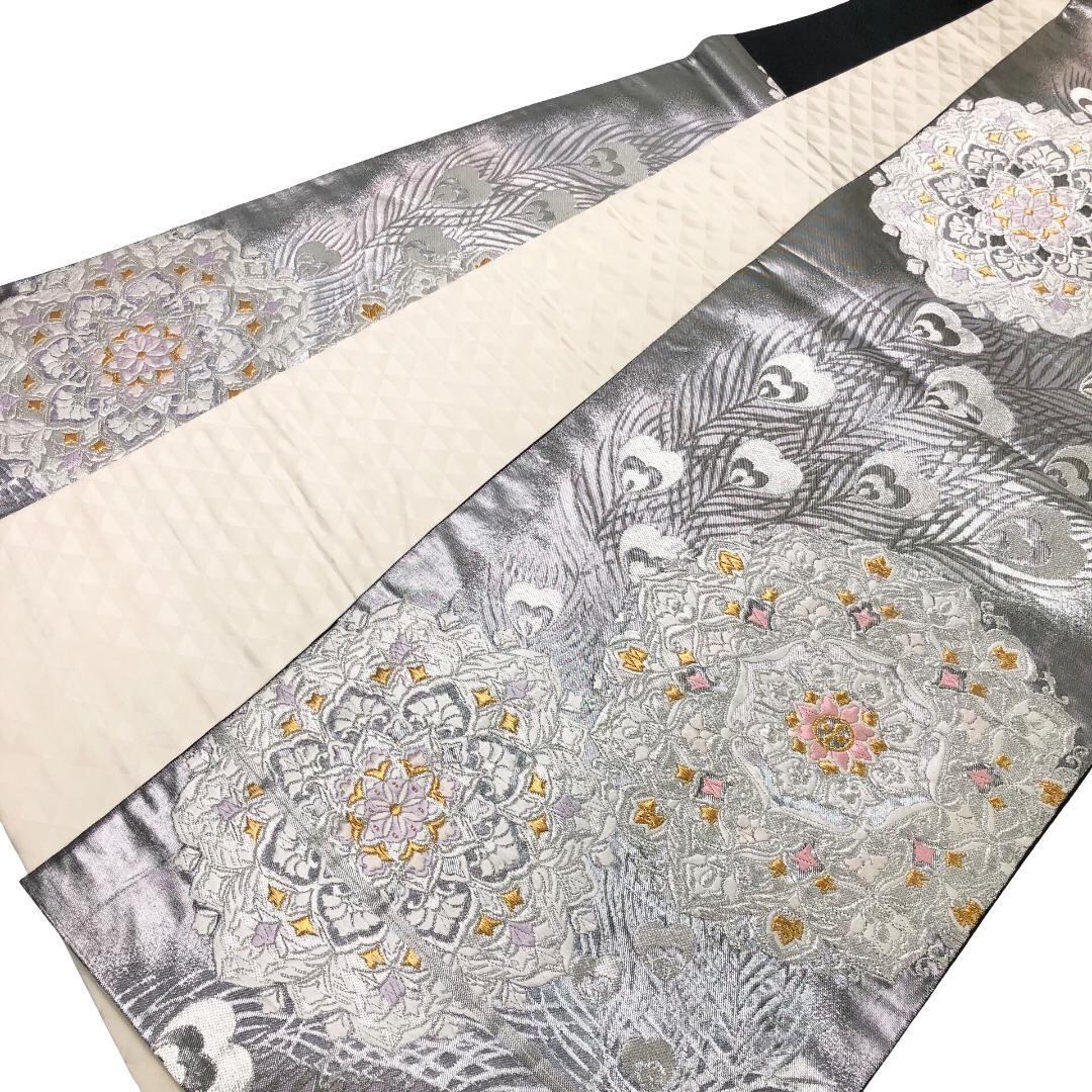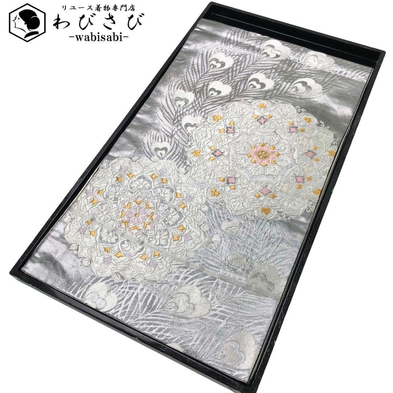 銀色ベースの煌びやかなお色味に美しい孔雀の羽、華模様がデザインされた素敵なお品でございます。