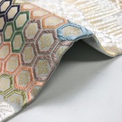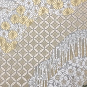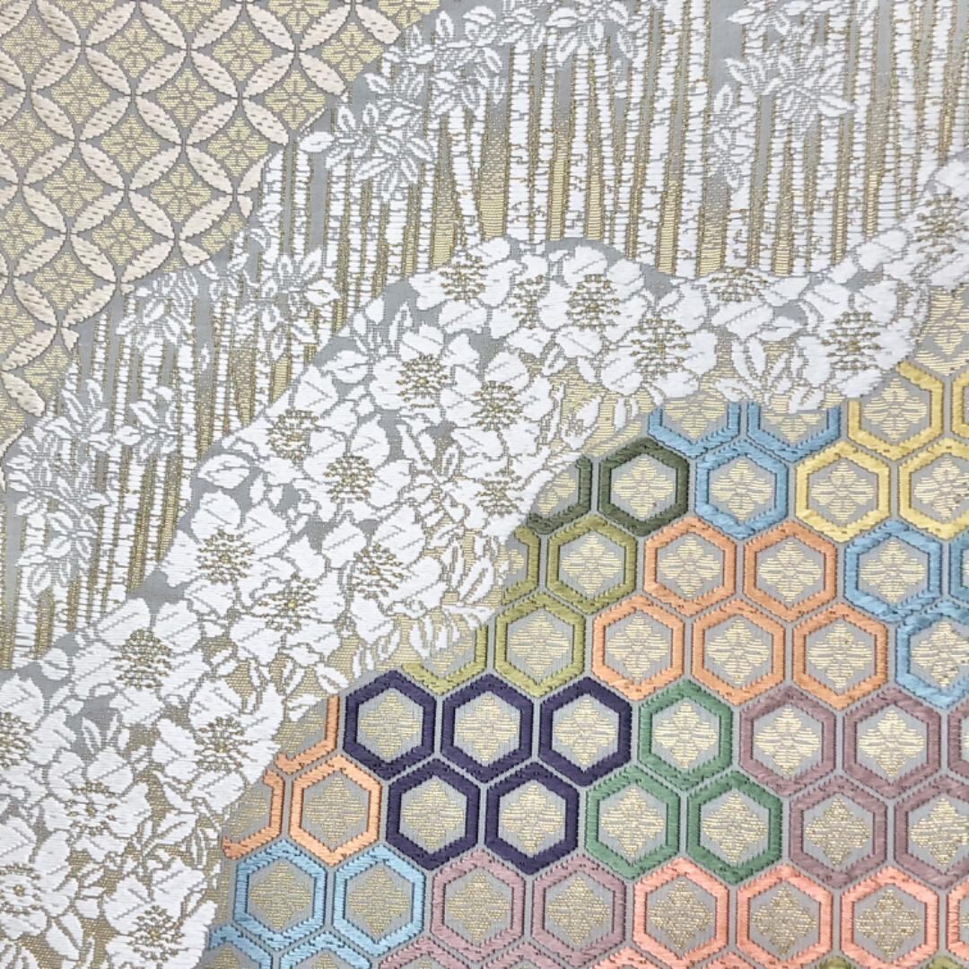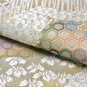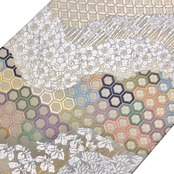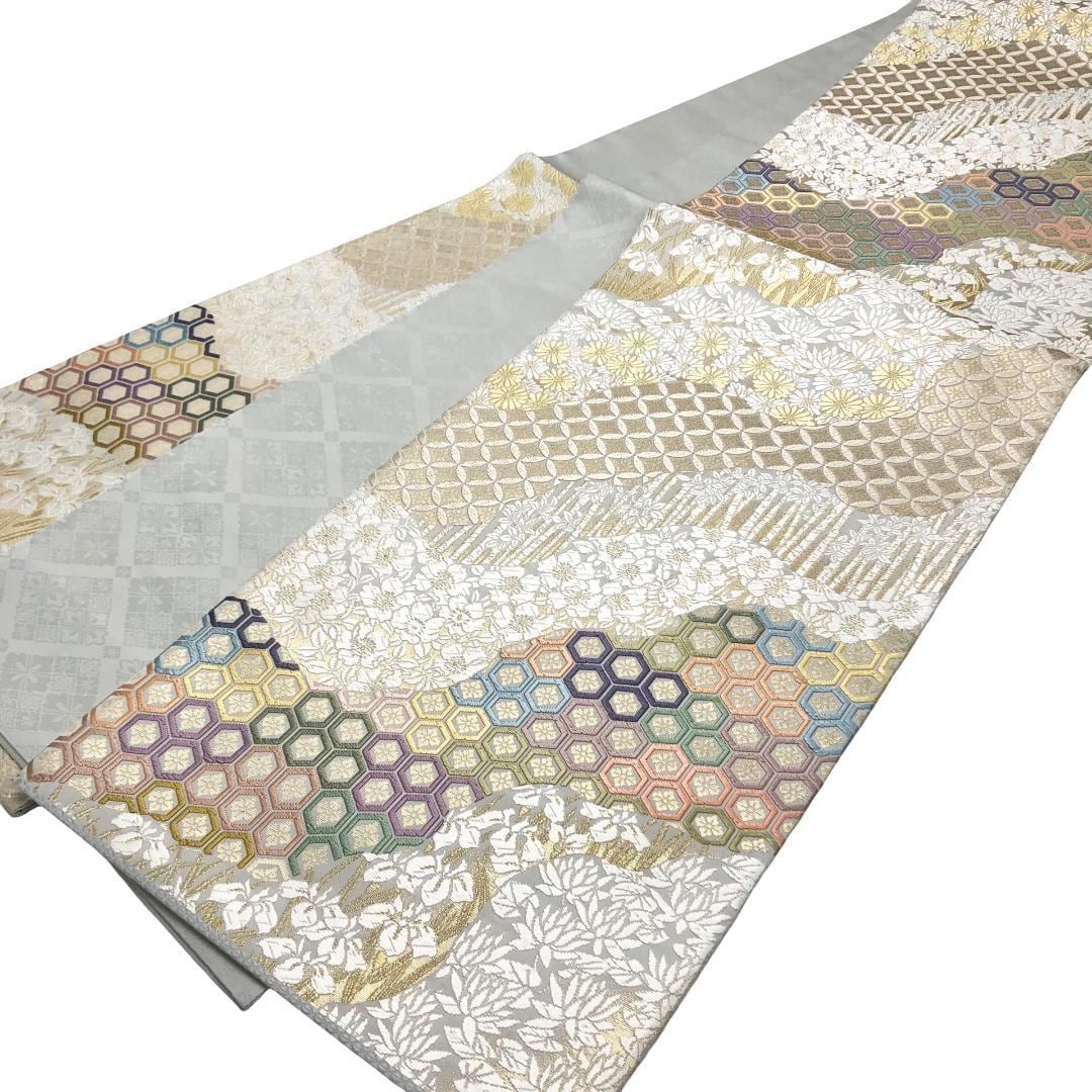 白鼠色ベースの上品なお色味に花模様、花亀甲、七宝繋ぎなどの美しい色彩の柄行がデザインされた雰囲気の良い素敵なお品でございます。