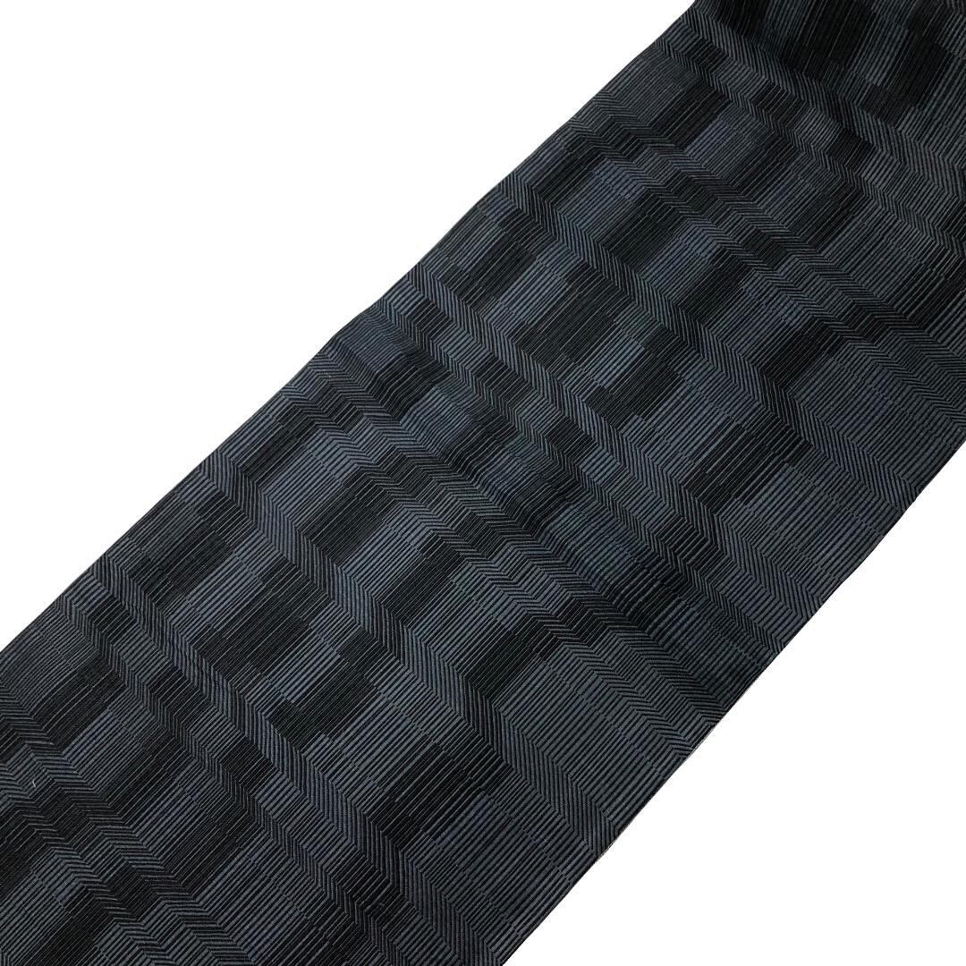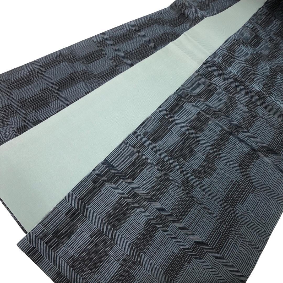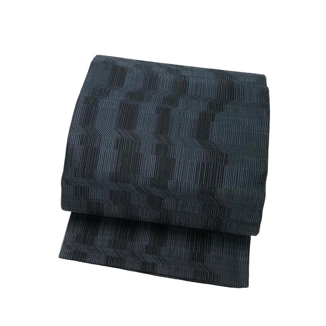 帯黒色ベースの落ち着いたお色味にモダンな織模様がデザインされた素敵なお品でございます。