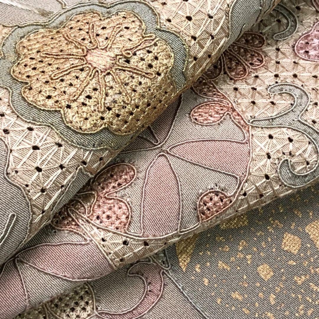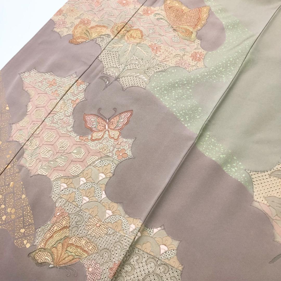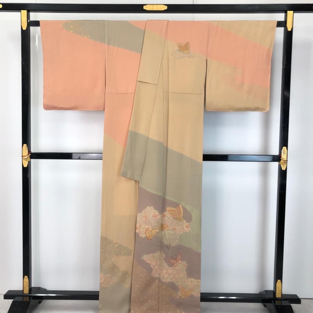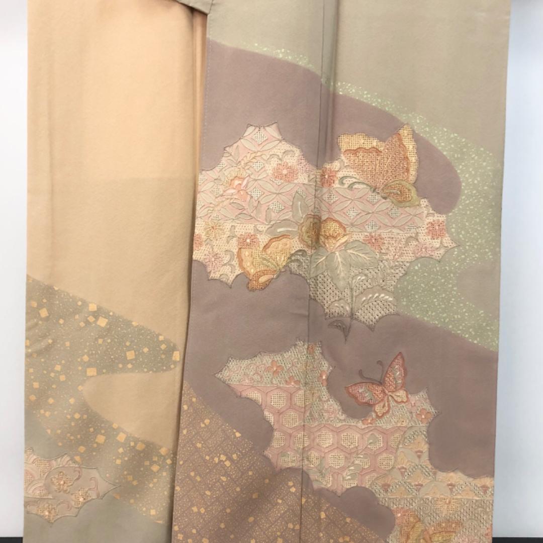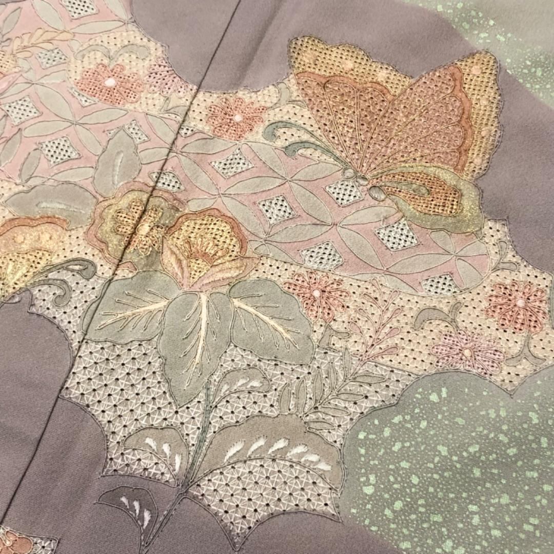 染分けの淡い色彩、刺繍の花模様、蝶々、亀甲などの柄裄がデザインされた素敵なお品でございます。
