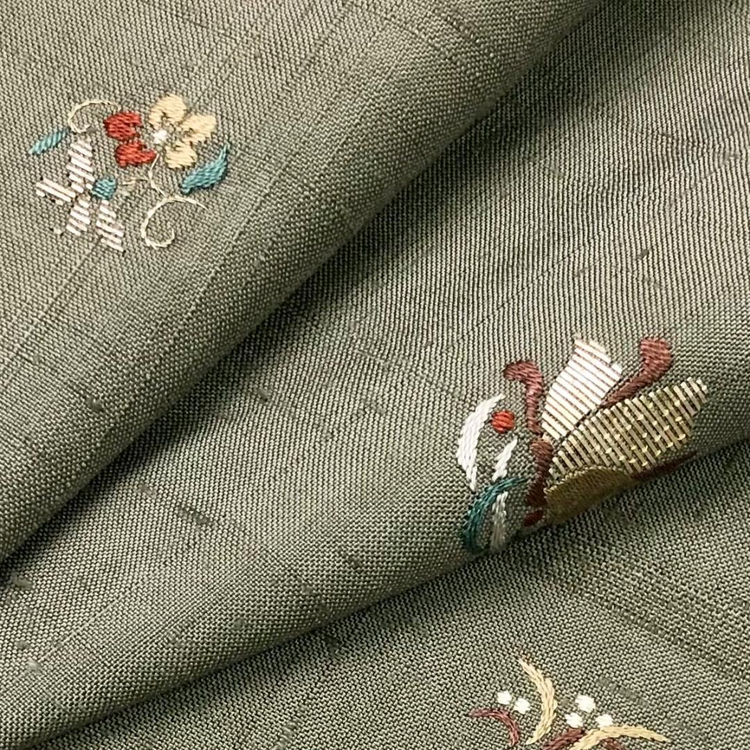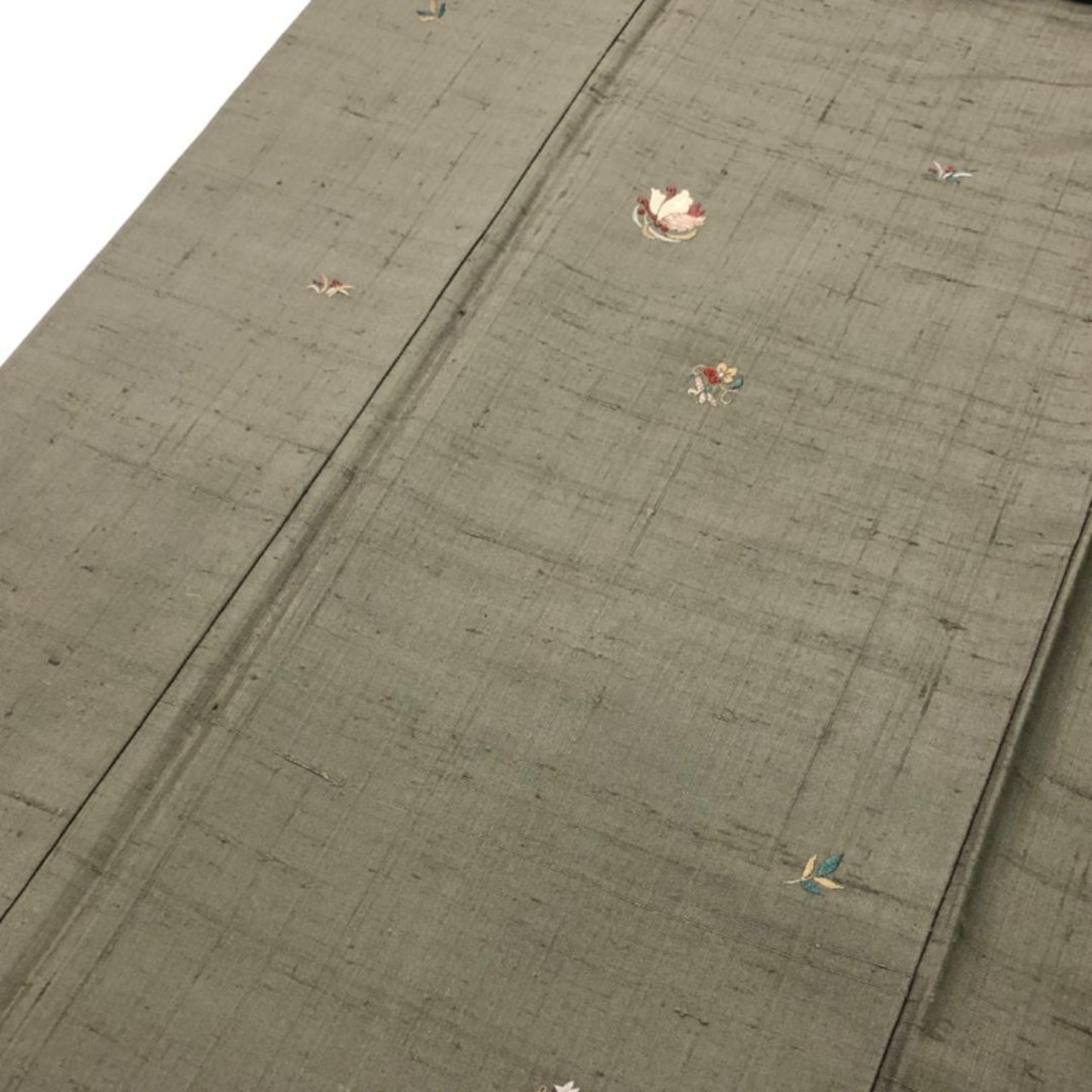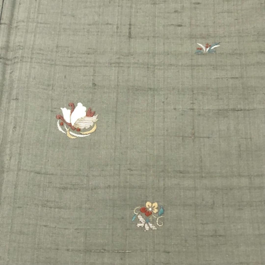浮草鼠色の落ち着いたお色味の紬地に刺繍が使われた花模様の柄行がデザインされた素敵なお品でございます。