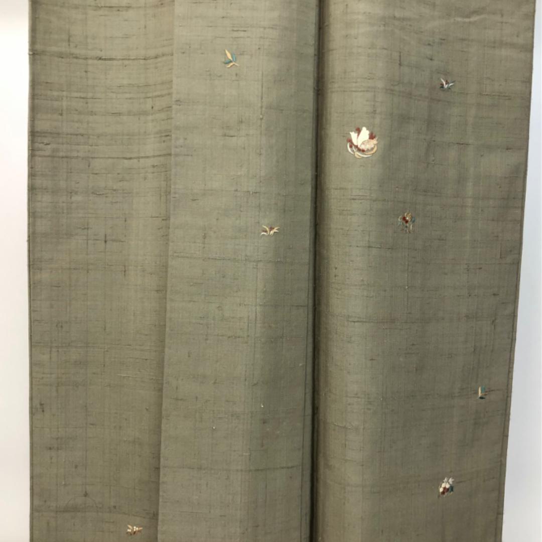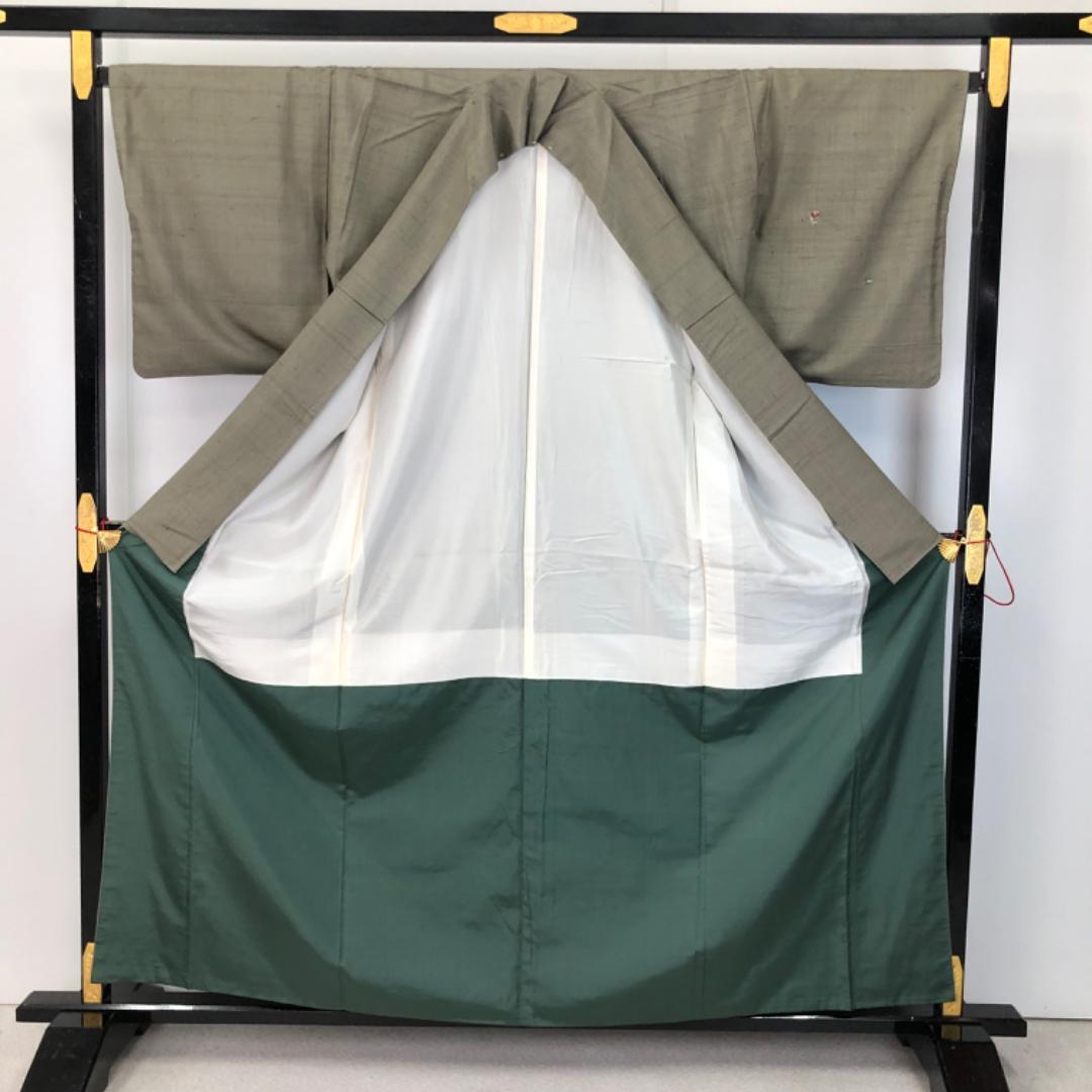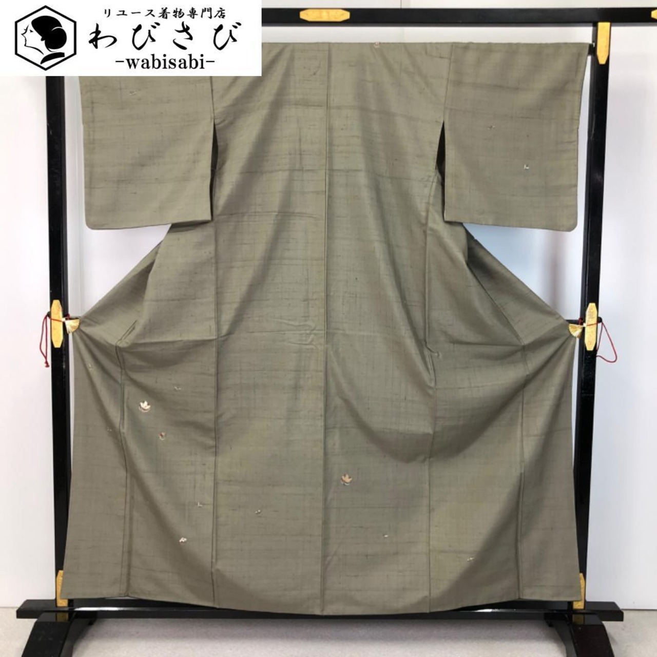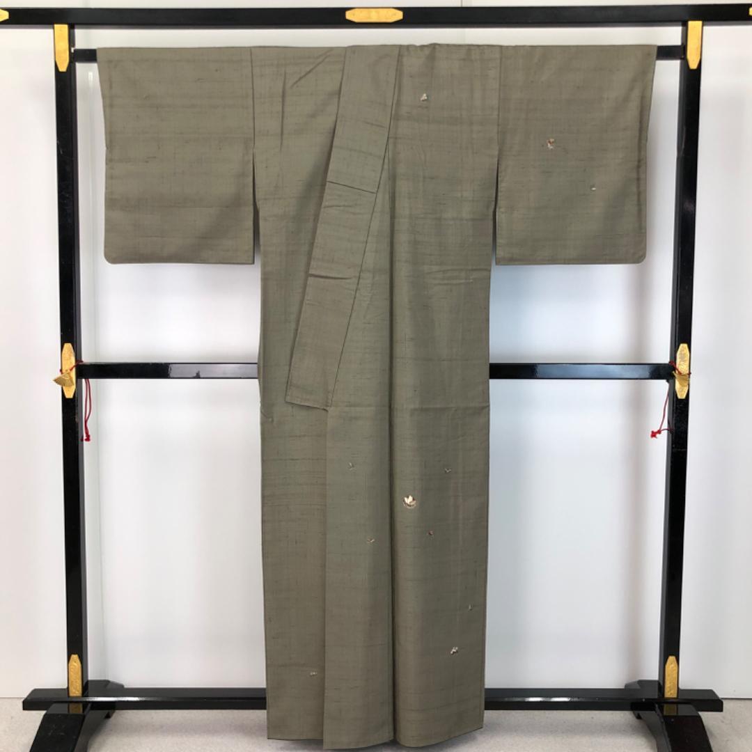 浮草鼠色の落ち着いたお色味の紬地に刺繍が使われた花模様の柄行がデザインされた素敵なお品でございます。