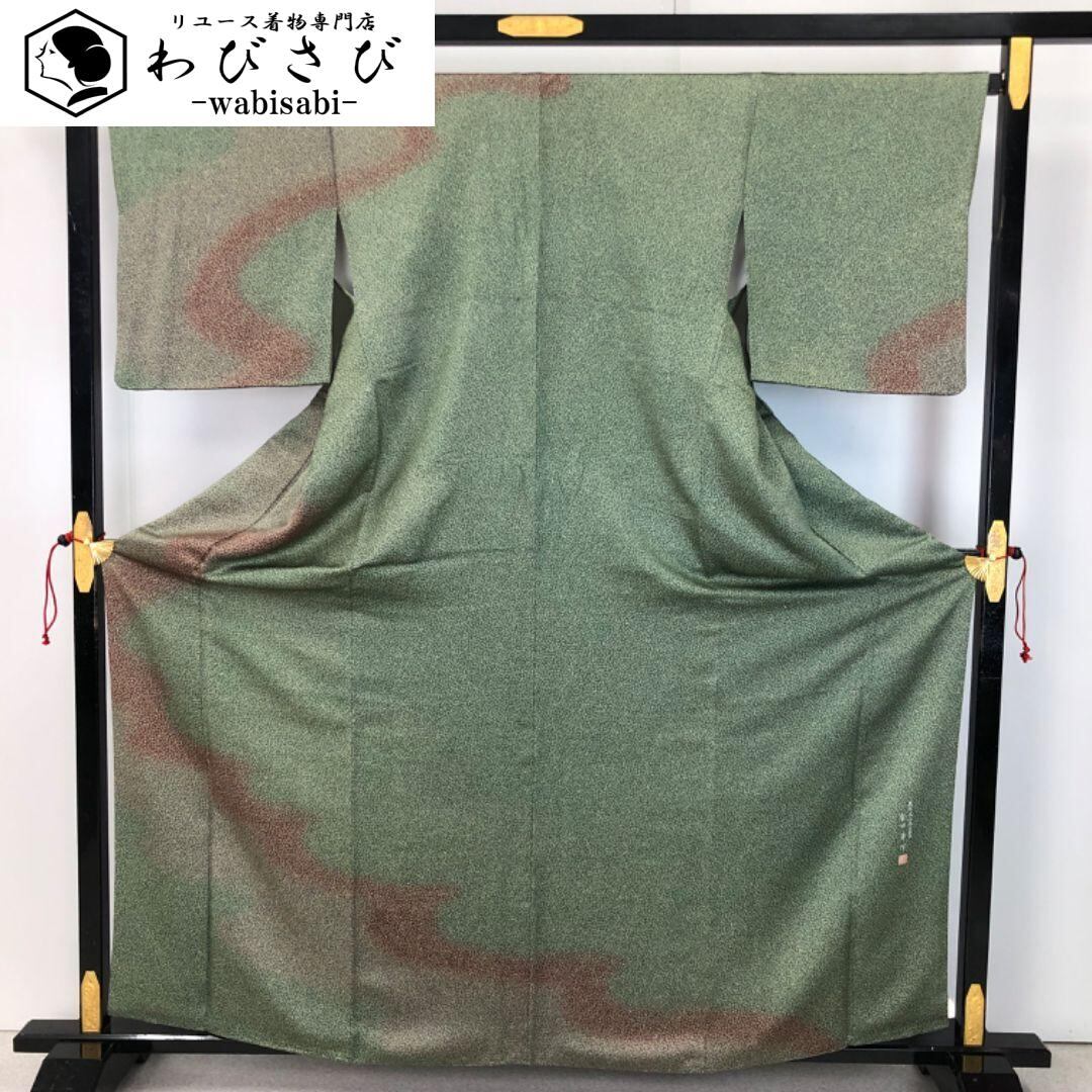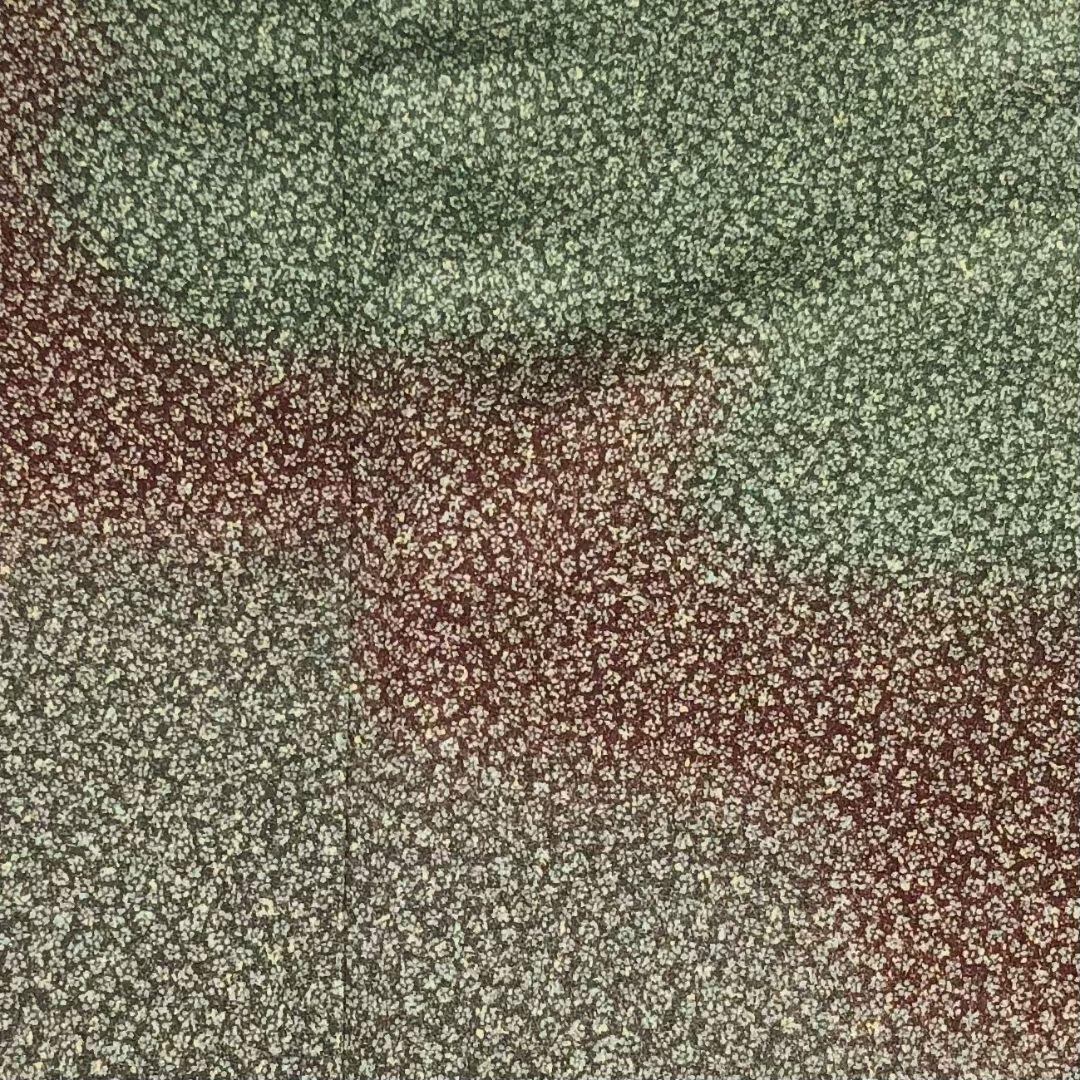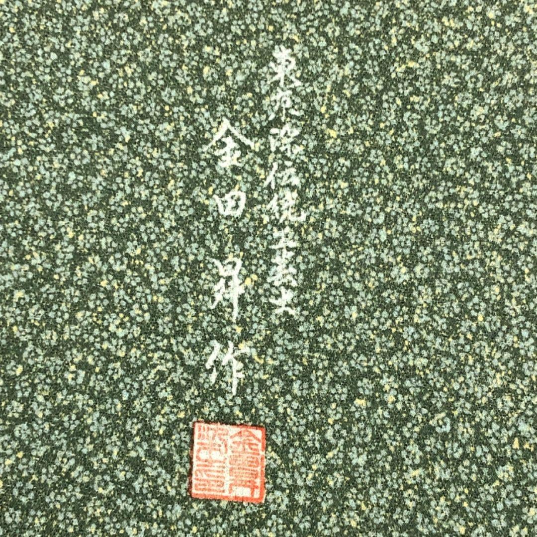 老竹色ベースのお色味に可愛らしい小花柄に霞模様の色彩がデザインされた雰囲気の良い素敵なお品でございます。