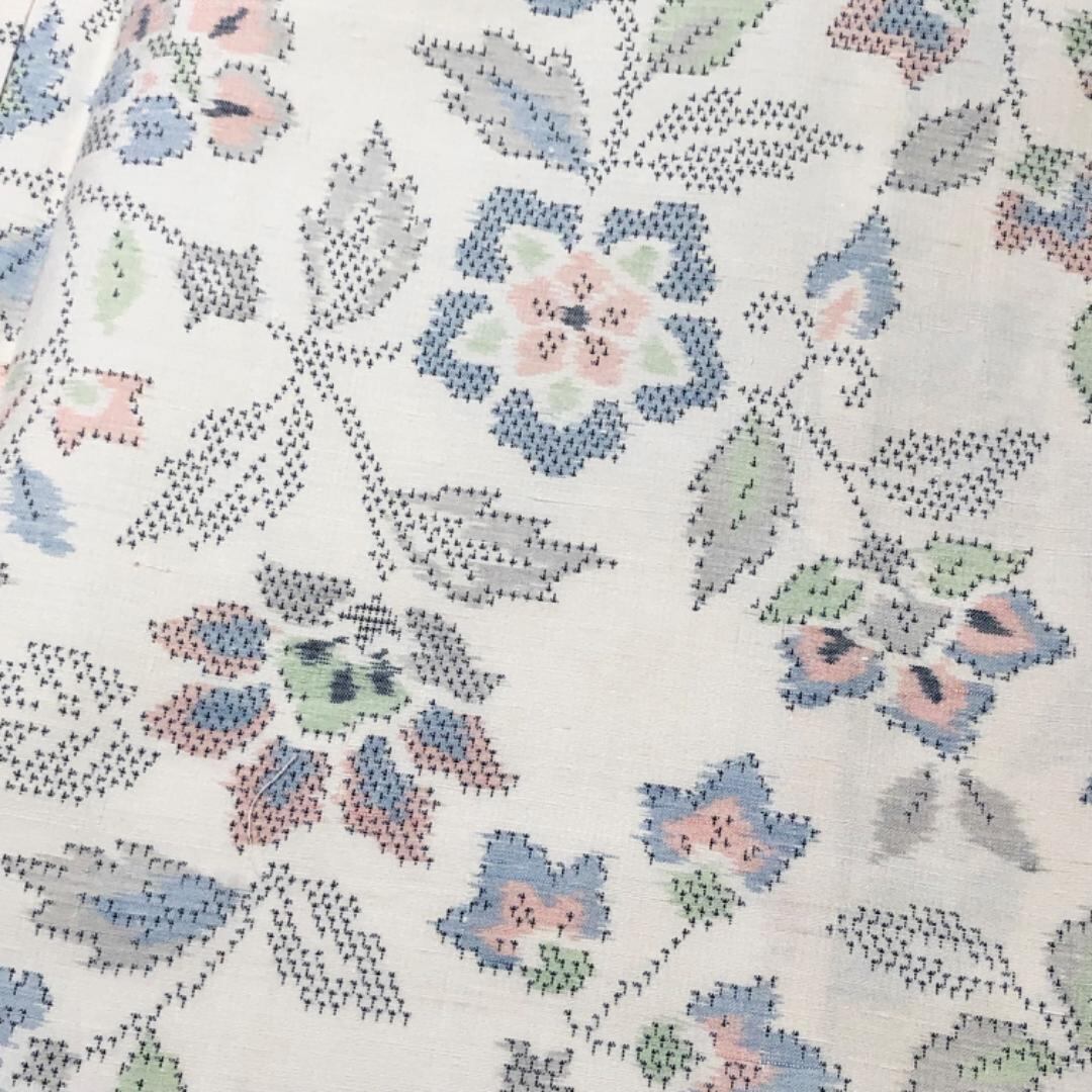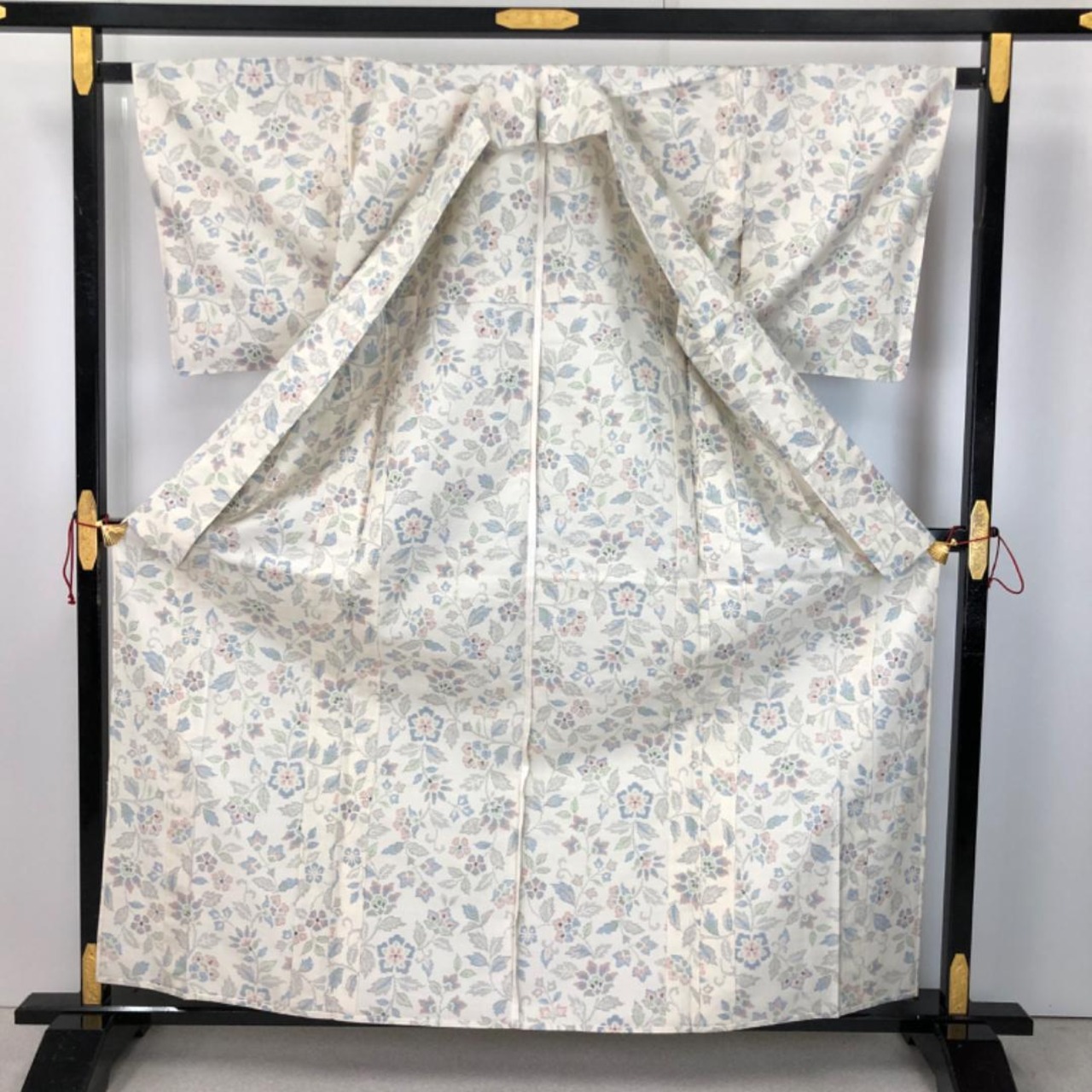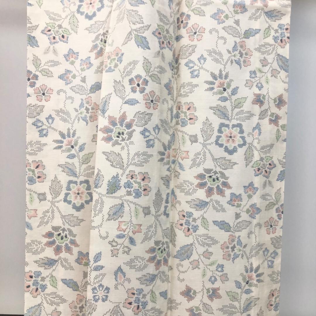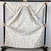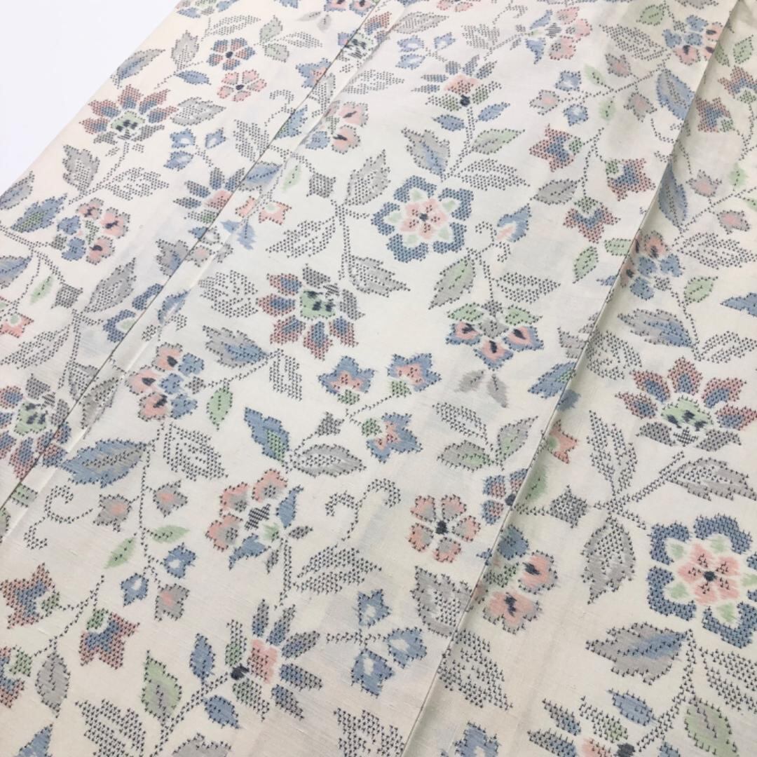 乳白色の上品なお色味に花柄模様の柄裄がデザインされた雰囲気の良い素敵なお品でございます。