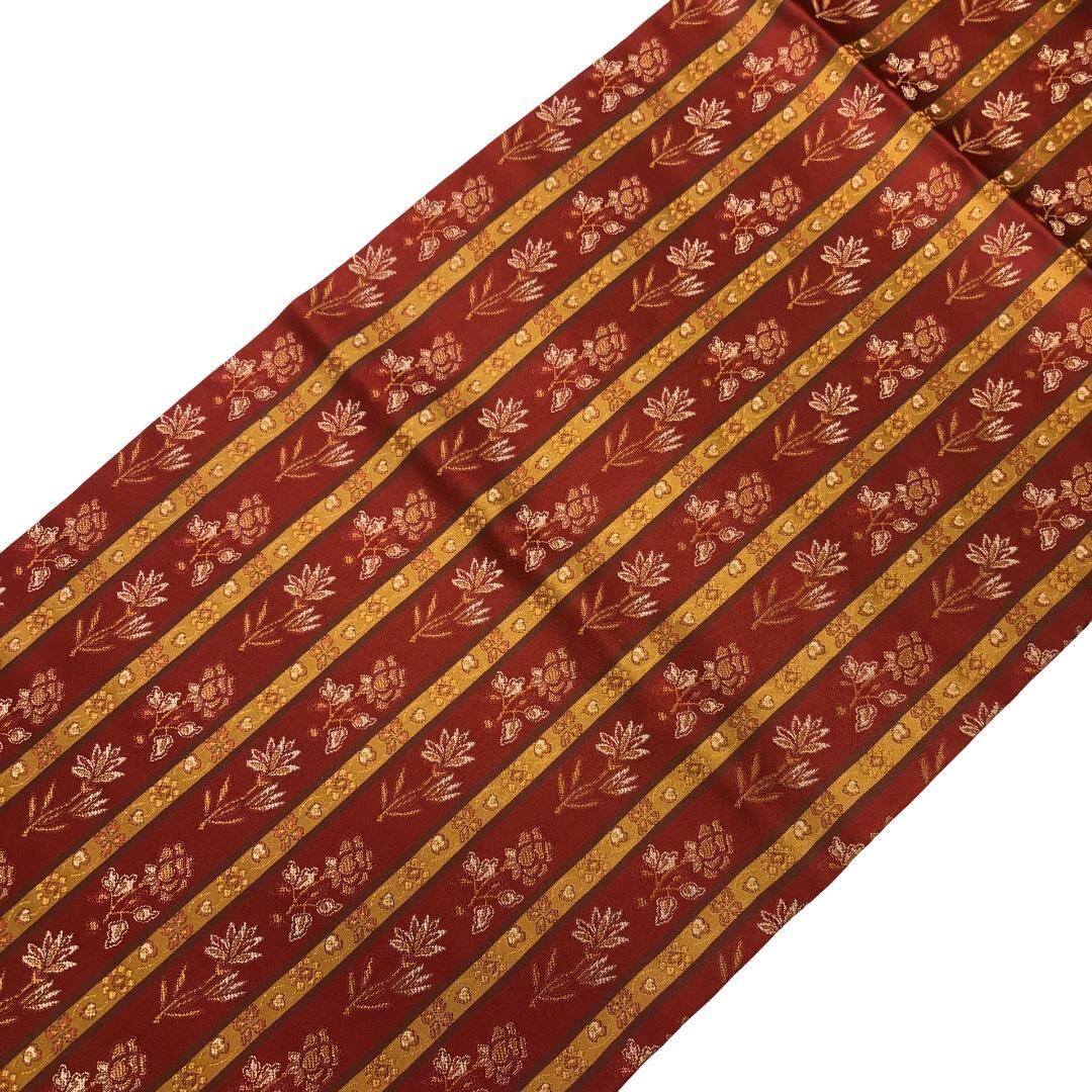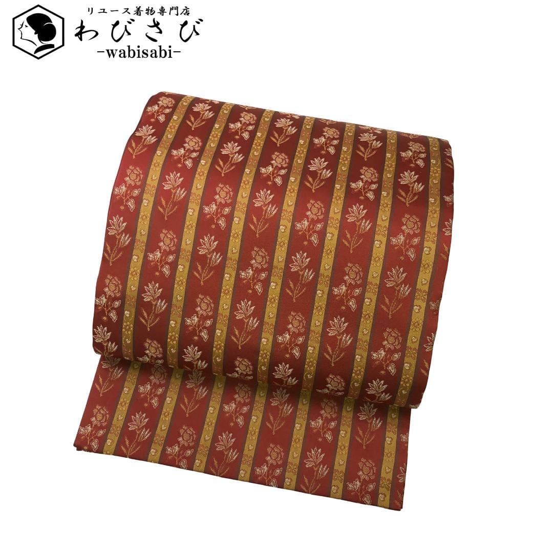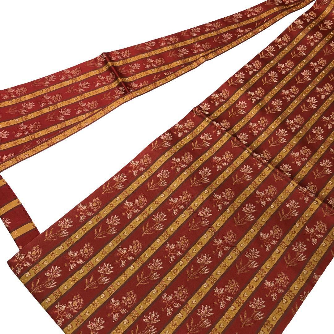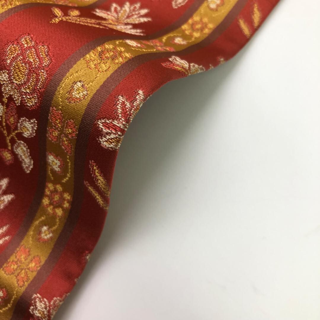 海老赤色ベースのお色味に縦縞に花柄模様がデザインされた素敵なお品でございます。