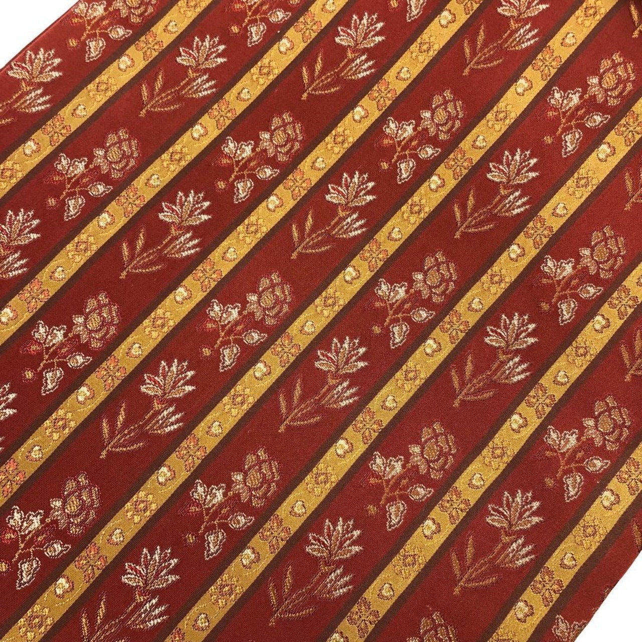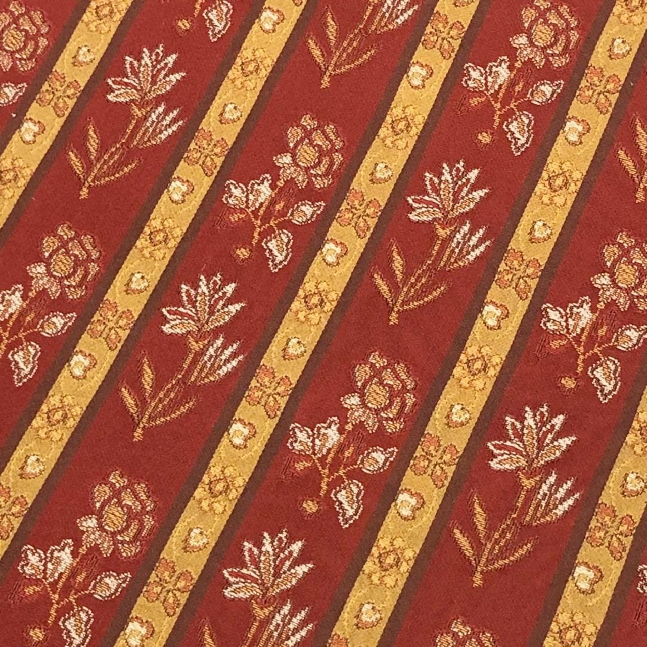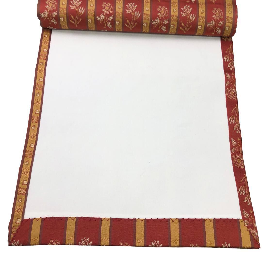 海老赤色ベースのお色味に縦縞に花柄模様がデザインされた素敵なお品でございます。