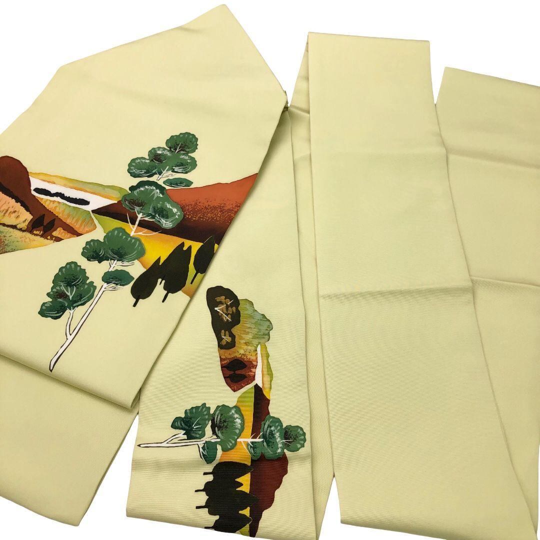 名古屋帯 塩瀬 手描き 風景柄 硫黄色 O-5829 着物 きもの kimono 和服 和装 中古 リサイクル着物 【送料無料】