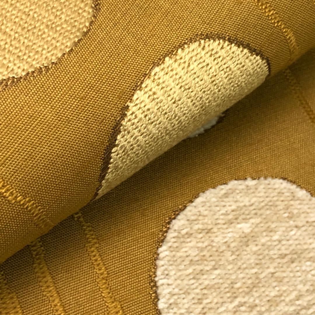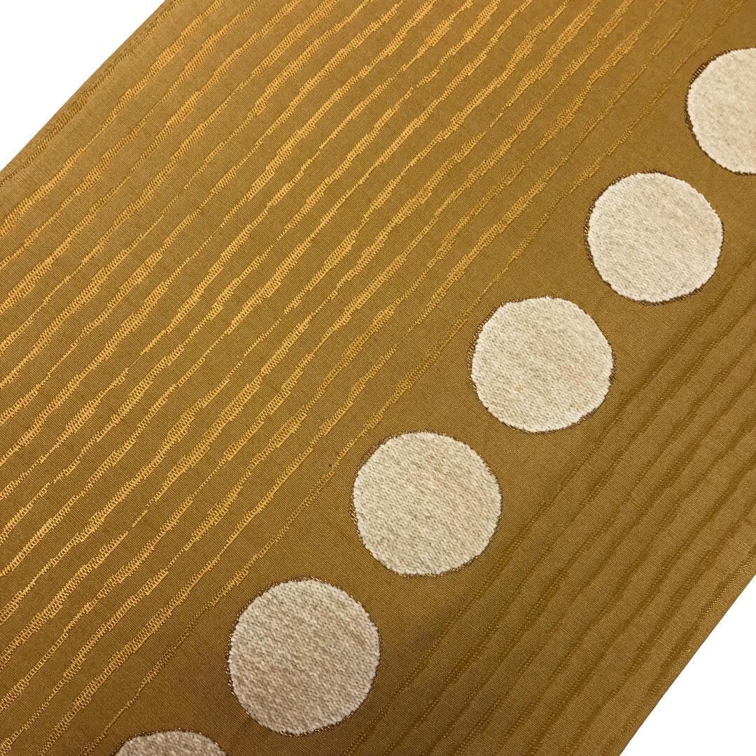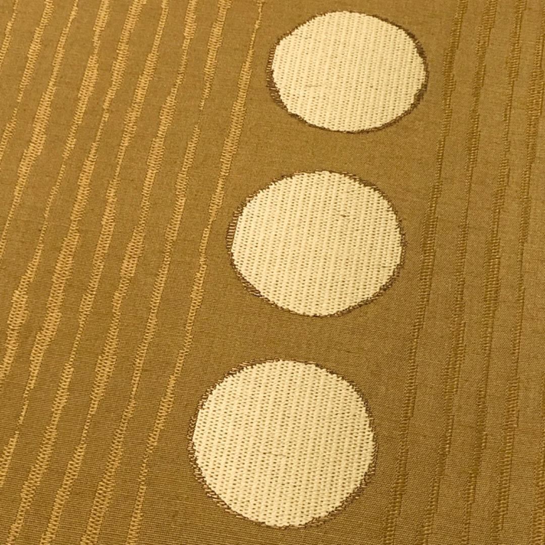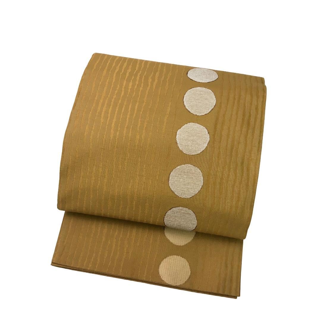 枇杷茶色ベースのお色味に縦柄の織模様、縦柄の●模様で太鼓部分にモール織の丸がデザインされた雰囲気の良い素敵な柄行のお品でございます。