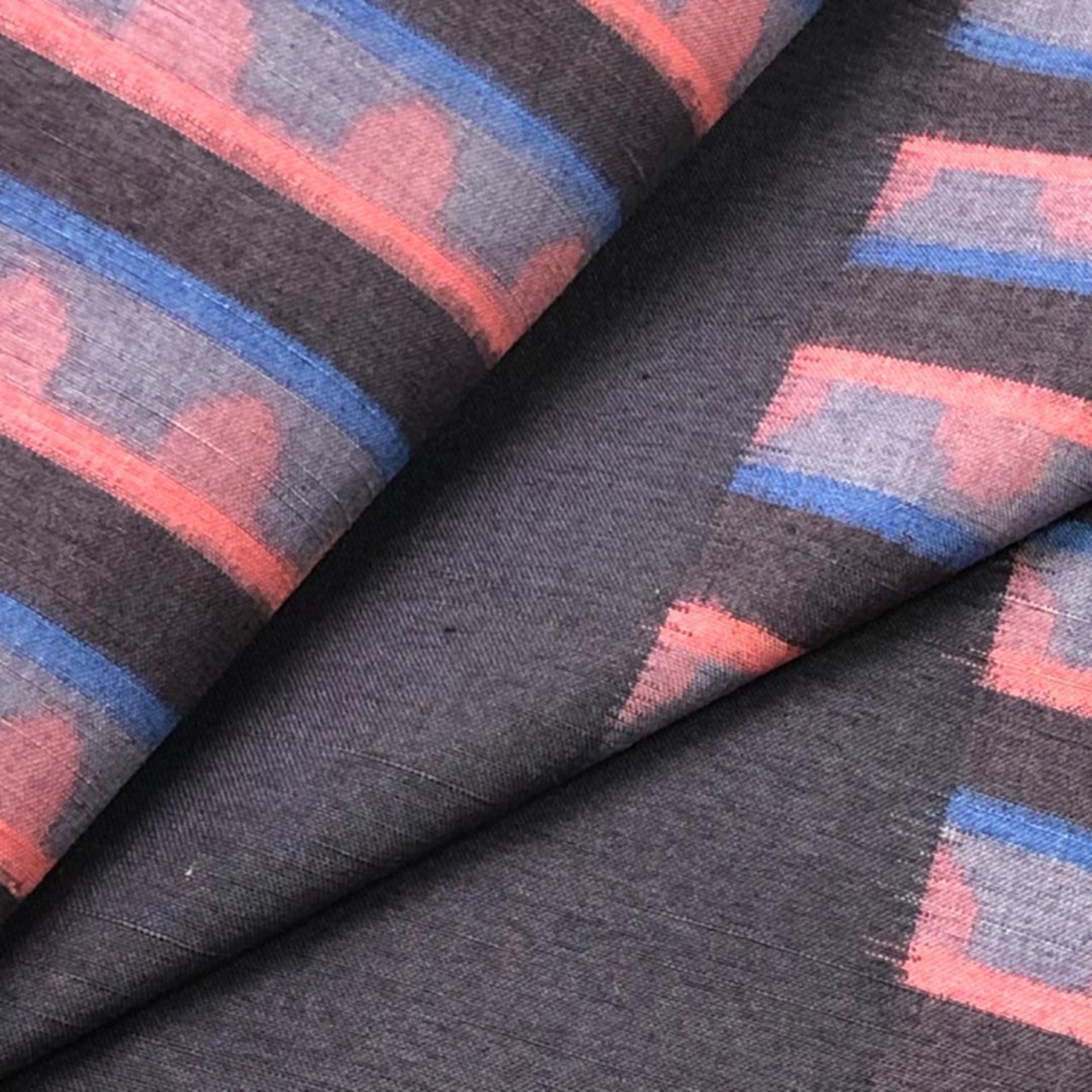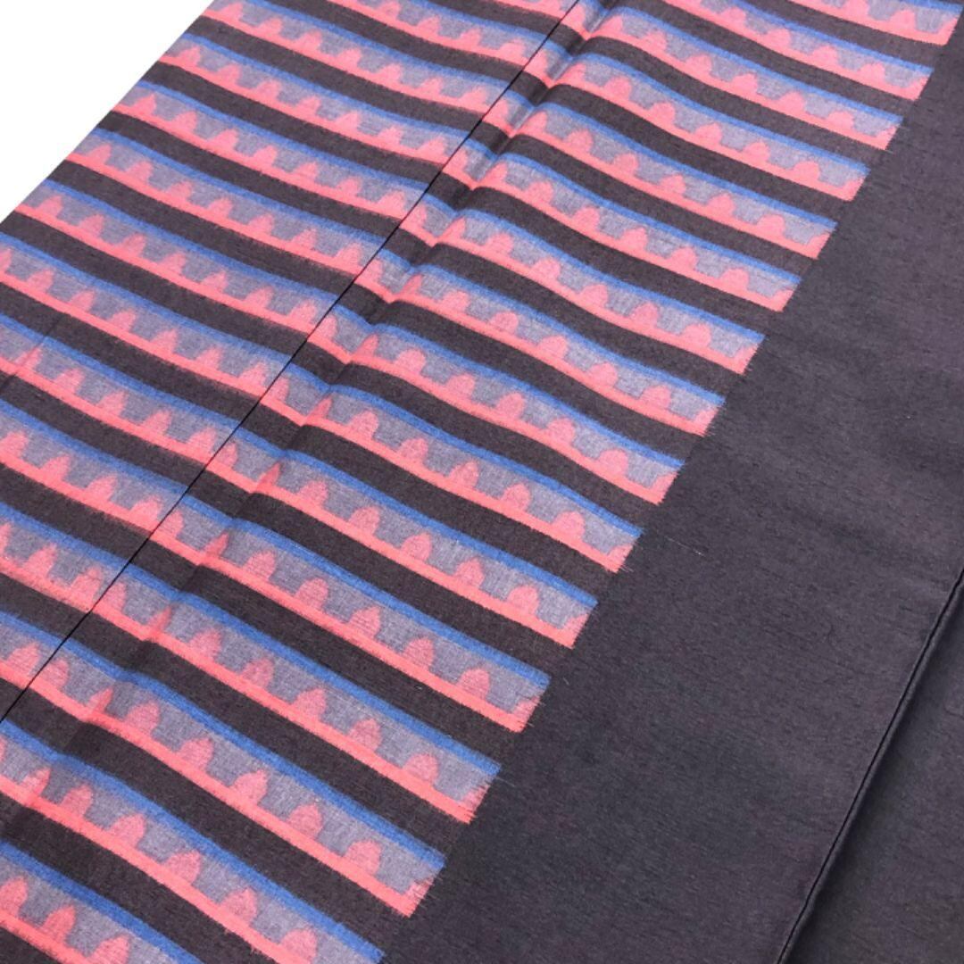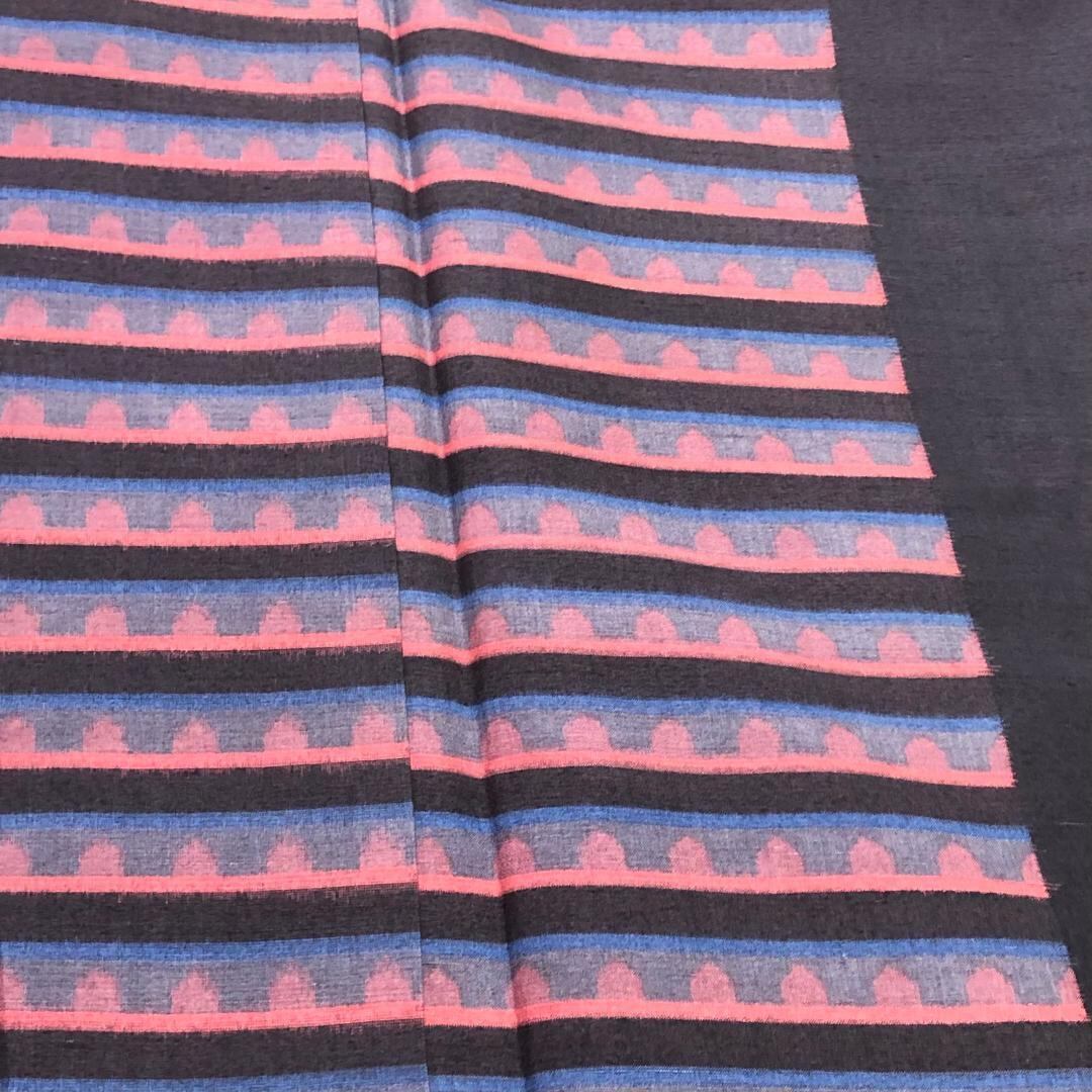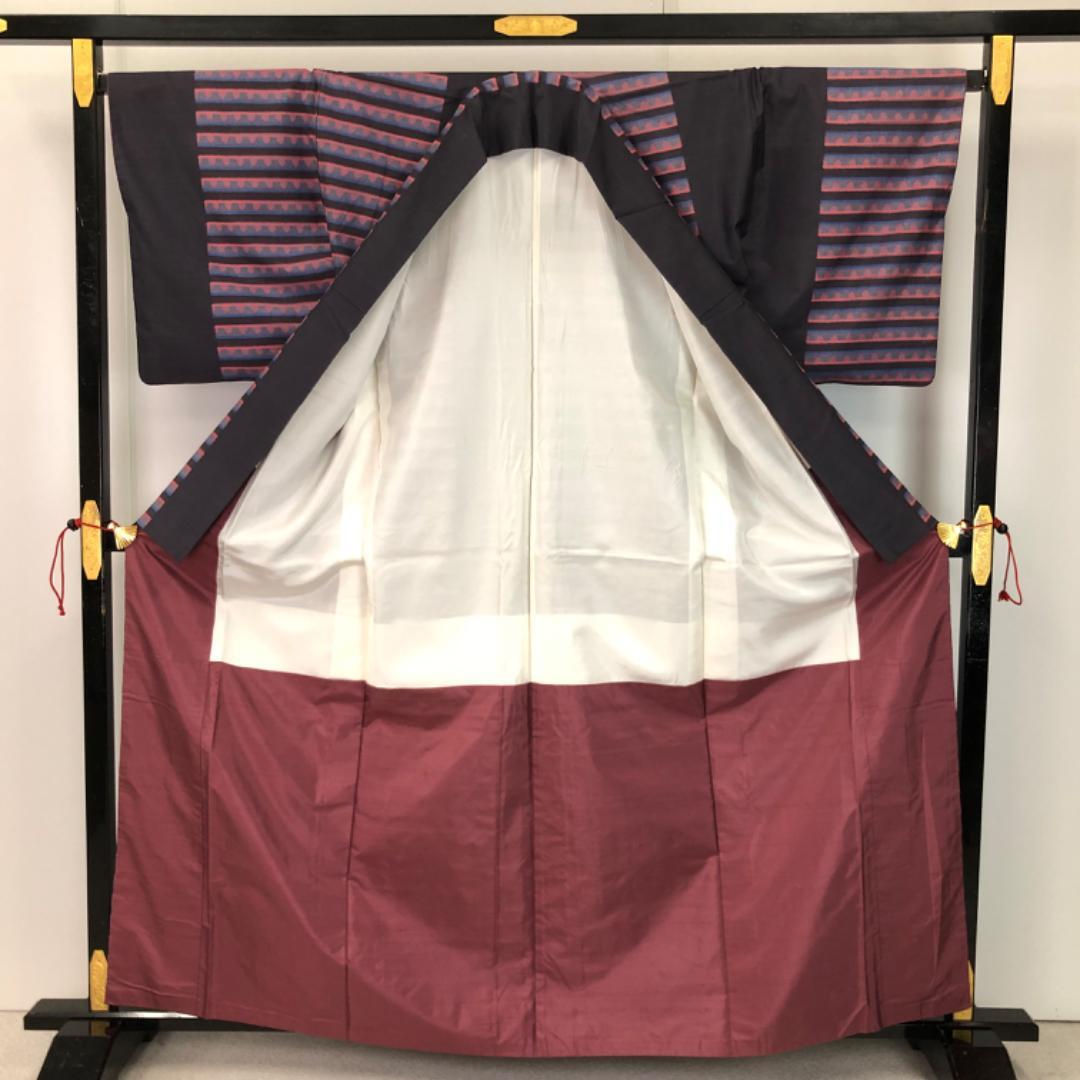 藤煤竹色のお色味に抽象横段模様の柄裄がデザインされた素敵なお品でございます。