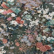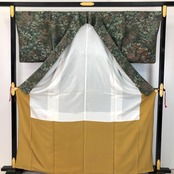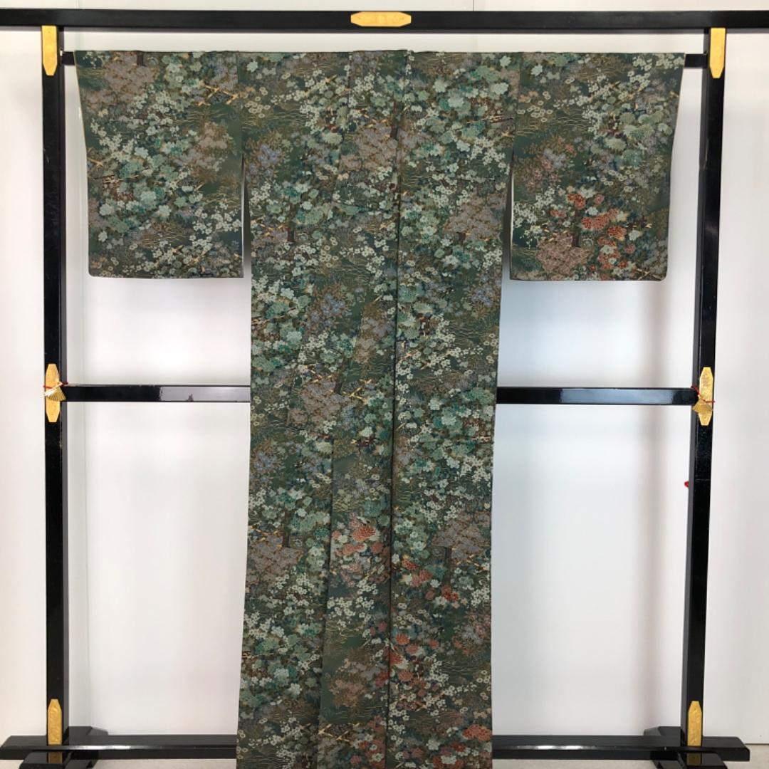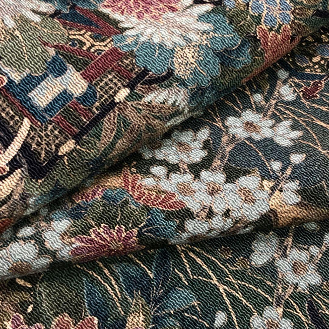 薩摩納戸色のお色味の縮緬地に美しい花模様の柄裄がデザインされた素敵なお品でございます。