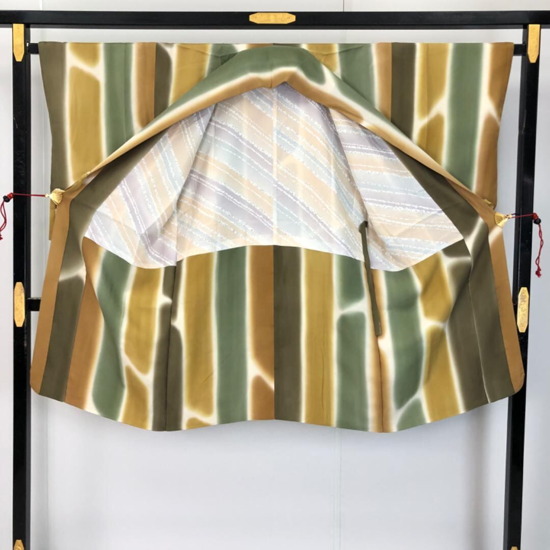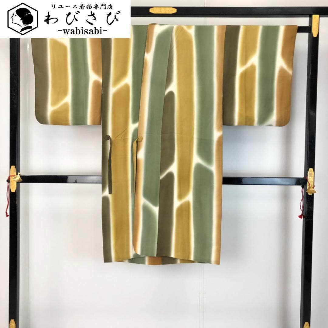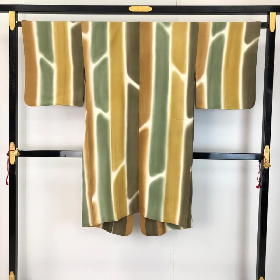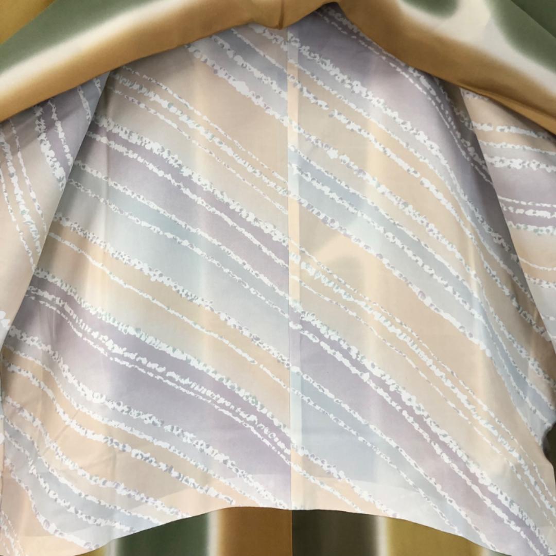 暈し染めの雰囲気の良いお色味に縦縞模様の柄裄がデザインされた素敵なお品でございます。