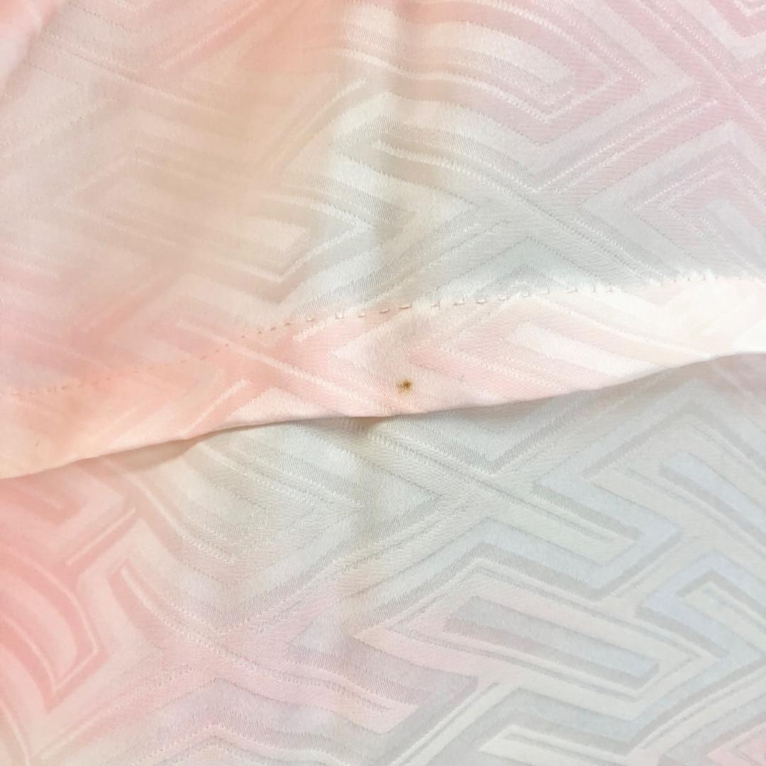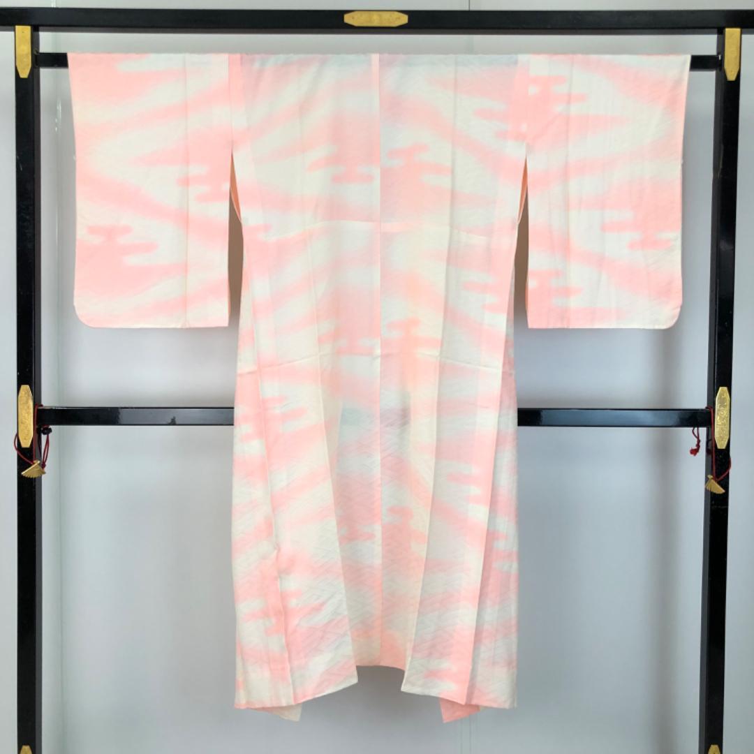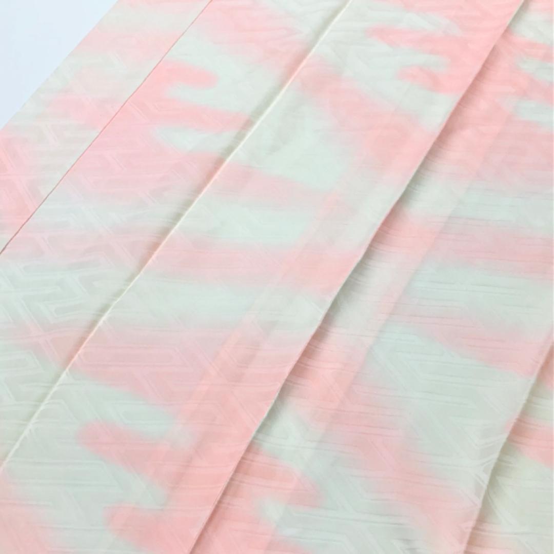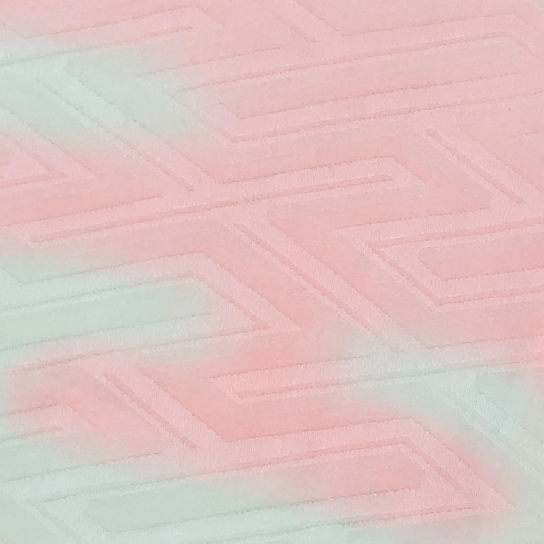 乙女色ベースの暈しのお色味に紗綾形の柄裄がデザインされた素敵なお品でございます。