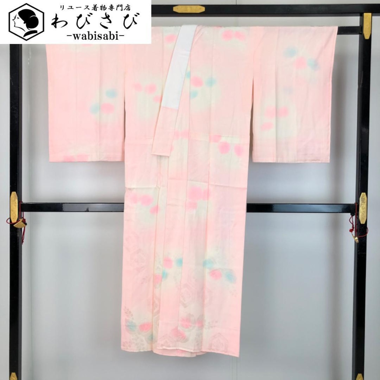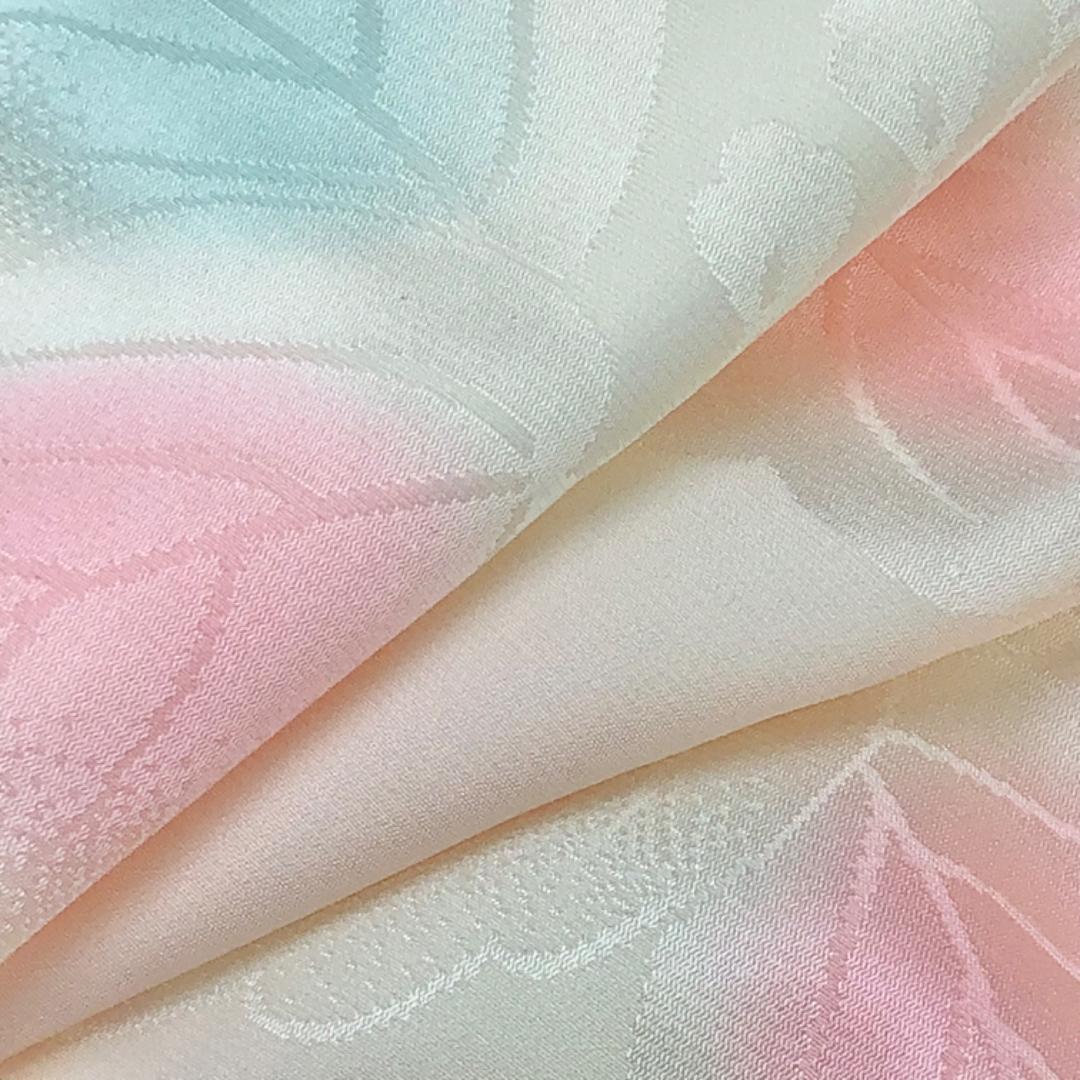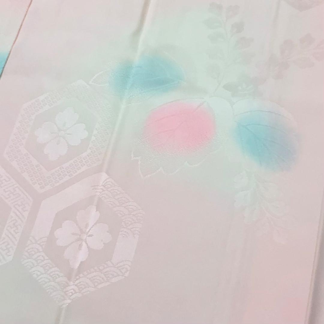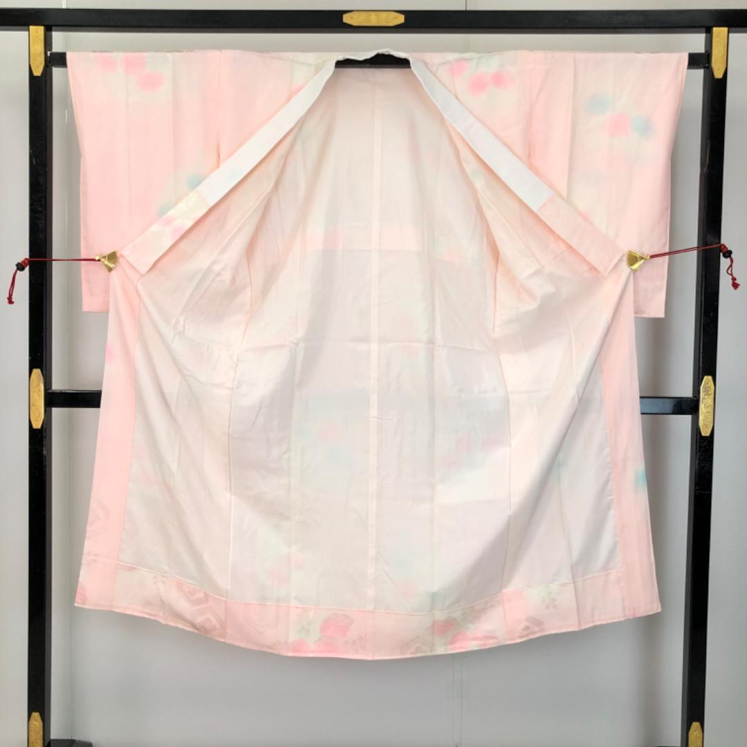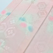 乙女色ベースの暈しのお色味に桐に花亀甲などの柄裄がデザインされた素敵なお品でございます。