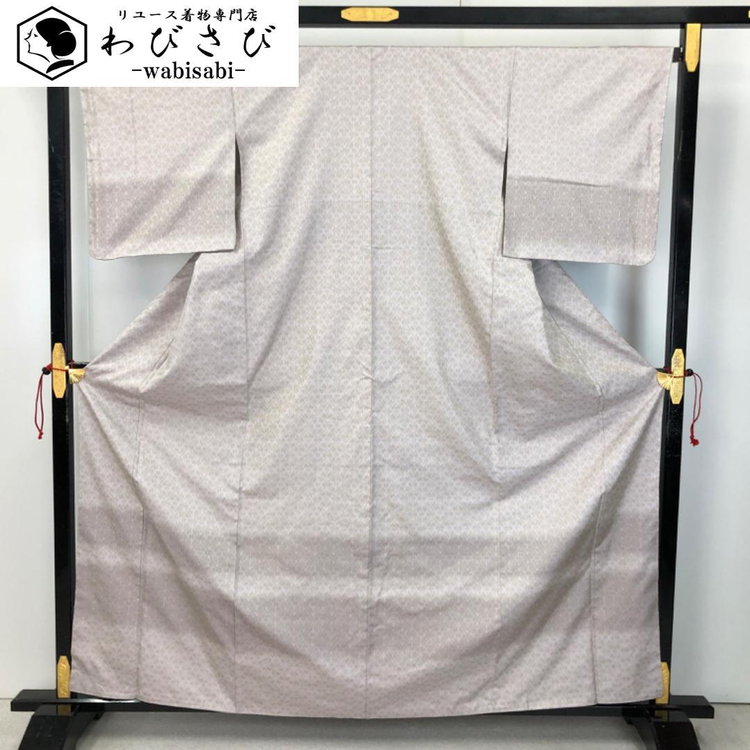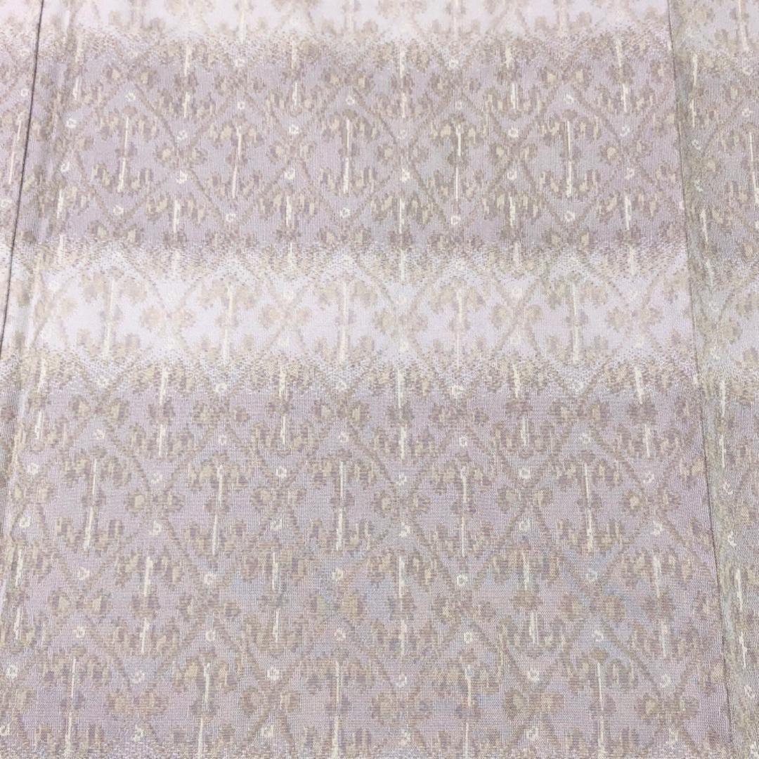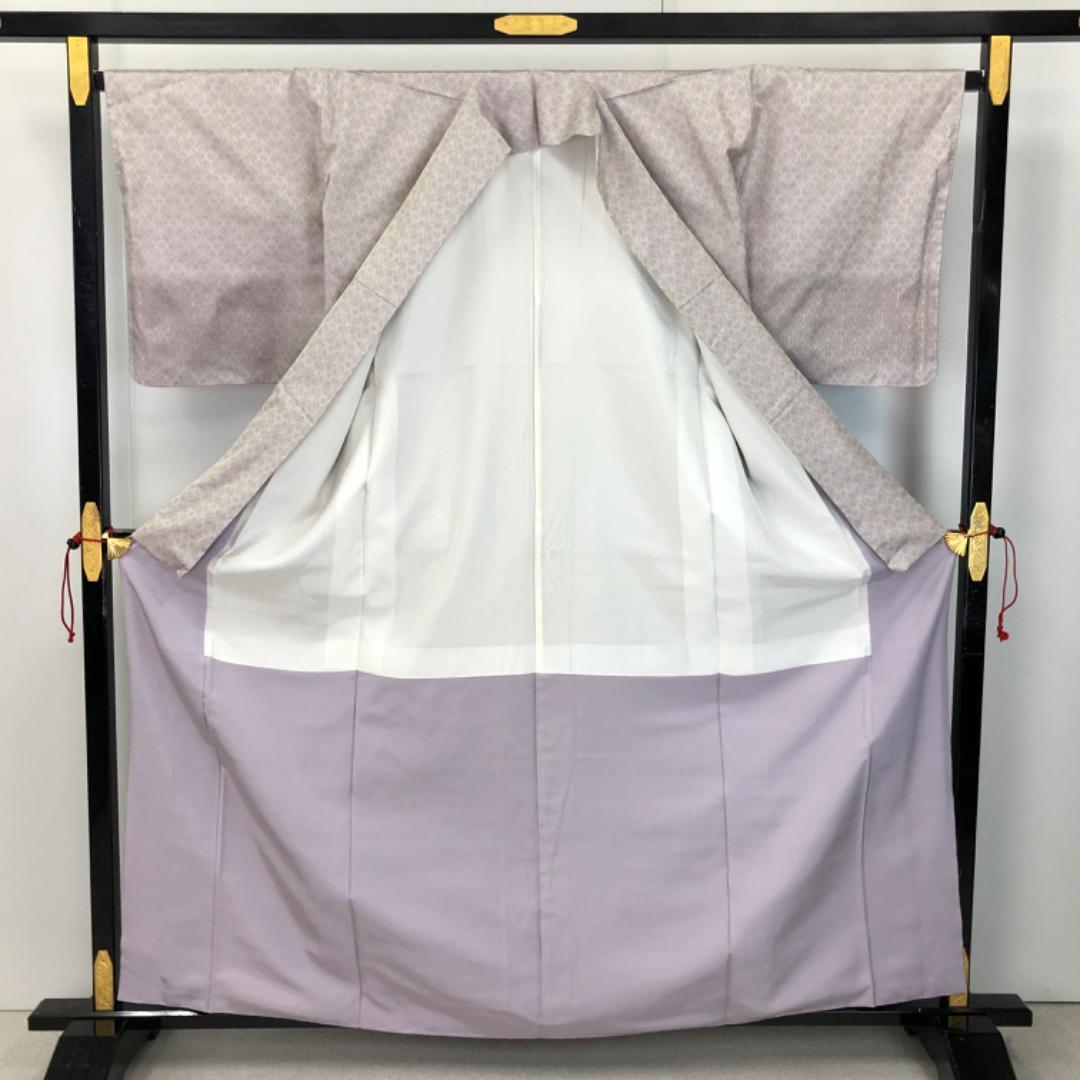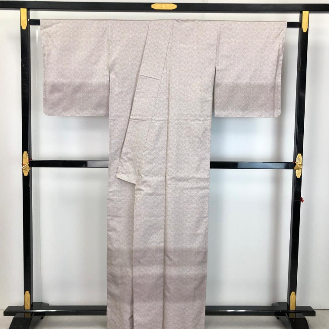 灰桜色ベースの上品なお色味に横縞に抽象模様の柄裄がデザインされた雰囲気の良い素敵なお品でございます。