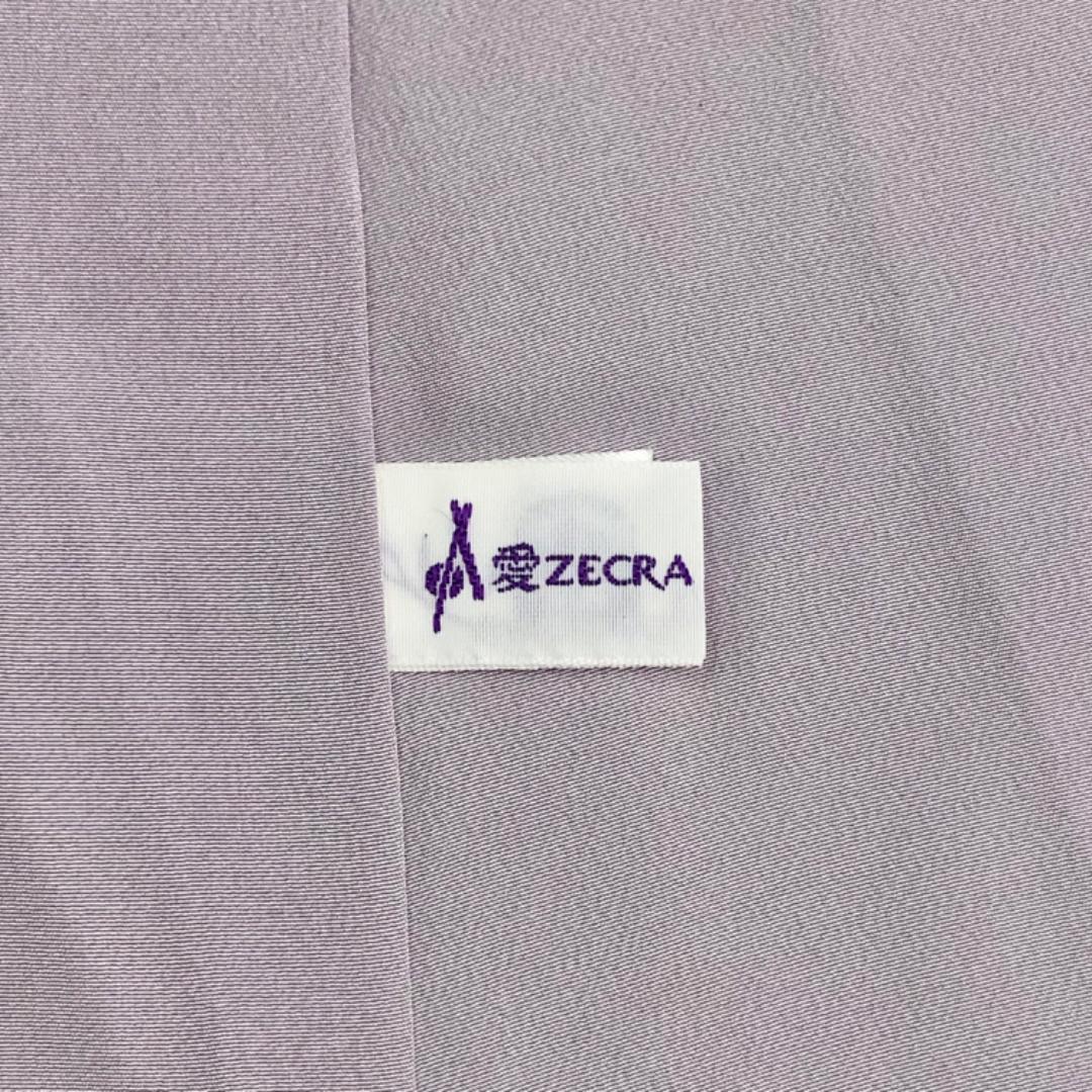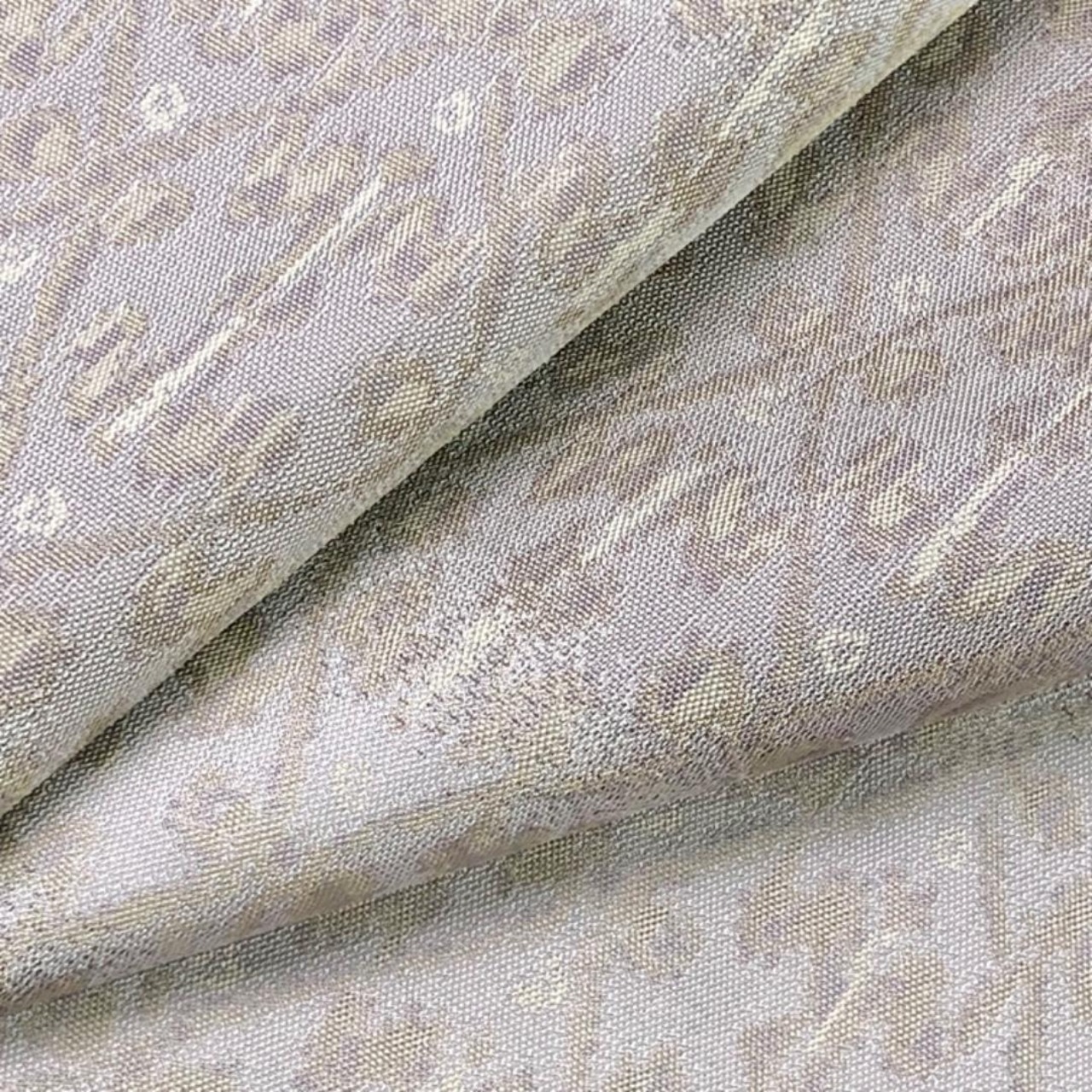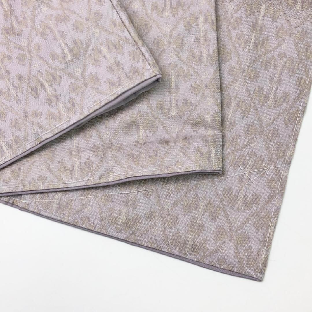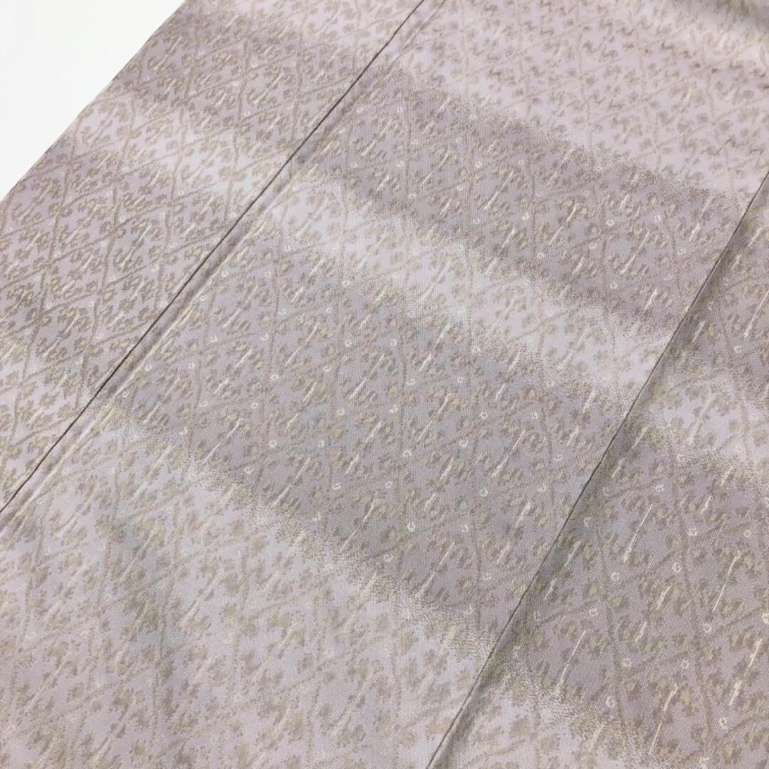灰桜色ベースの上品なお色味に横縞に抽象模様の柄裄がデザインされた雰囲気の良い素敵なお品でございます。