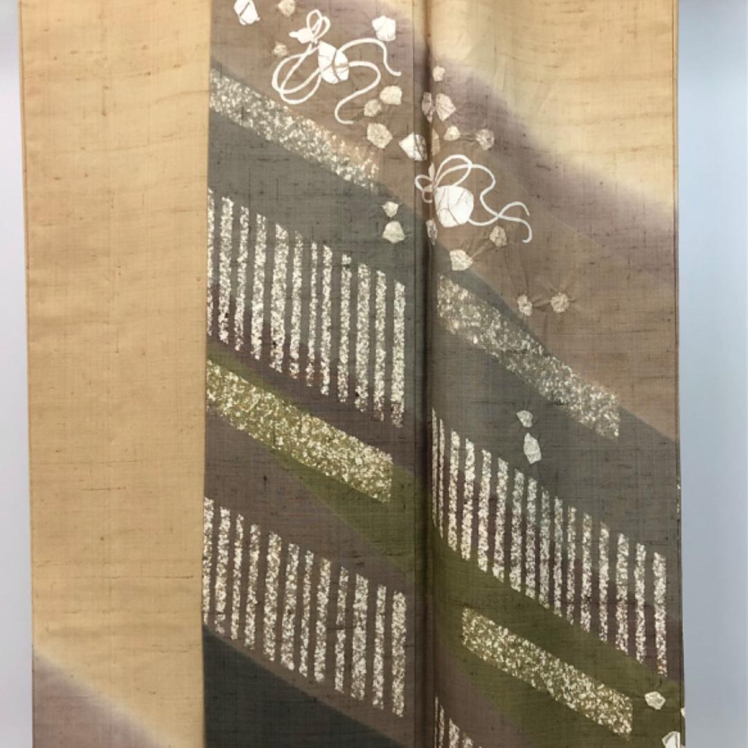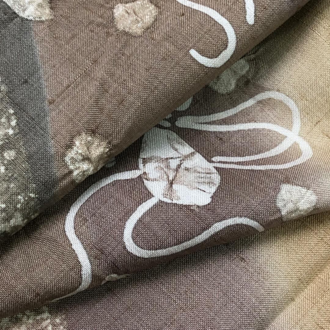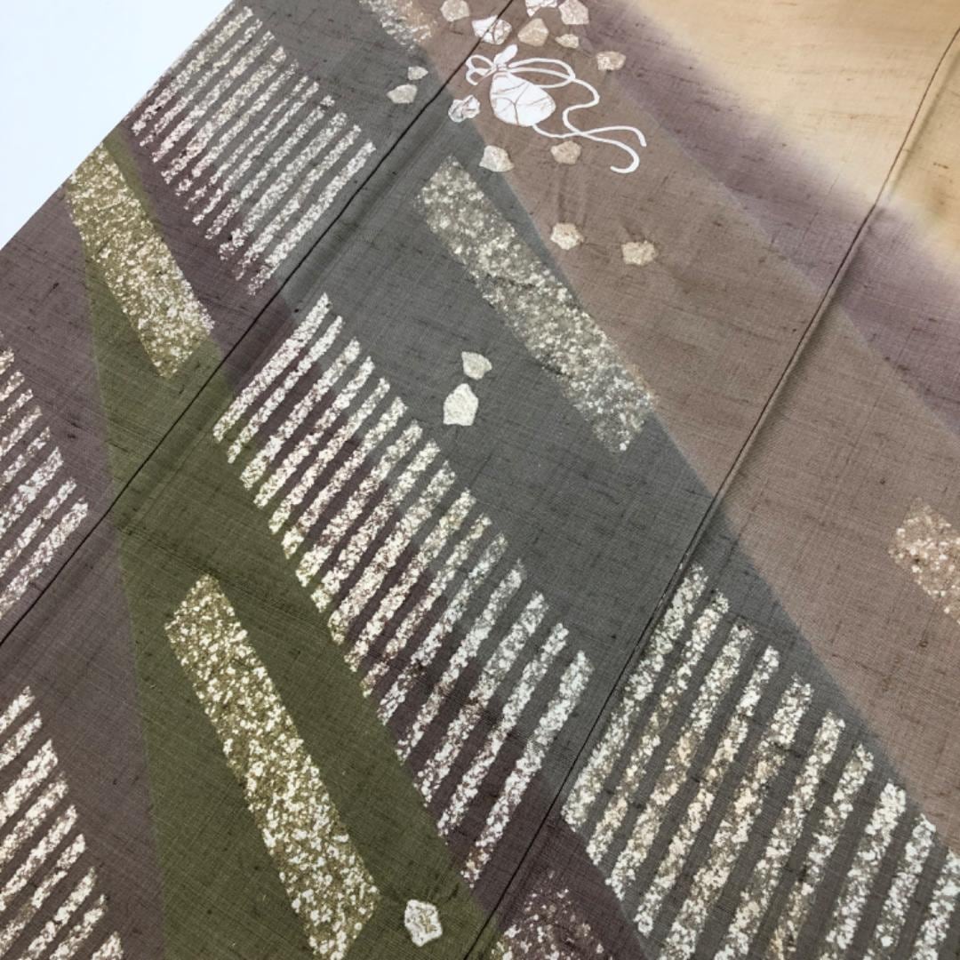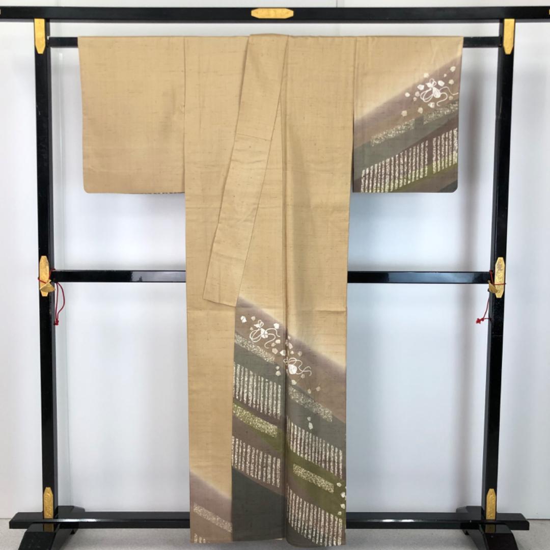薄麦藁色ベースのお色味の上質な紬地に雰囲気の良い絞り柄が染模様がデザインされた素敵なお品でございます。
