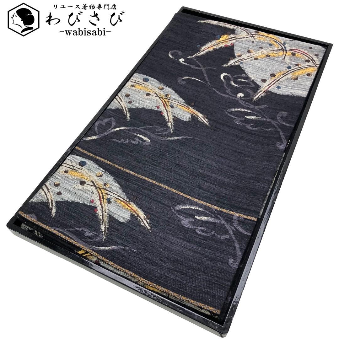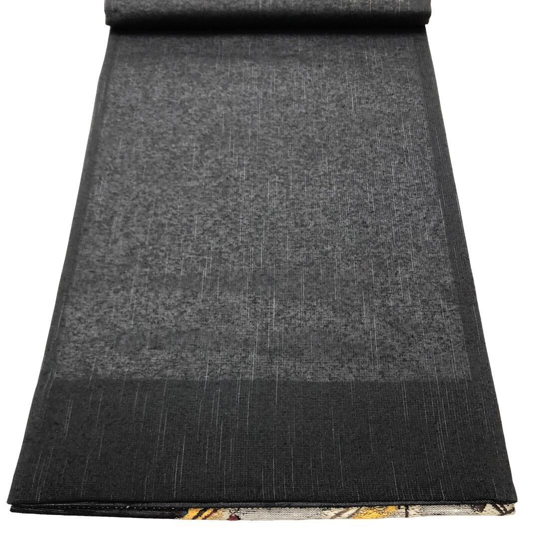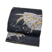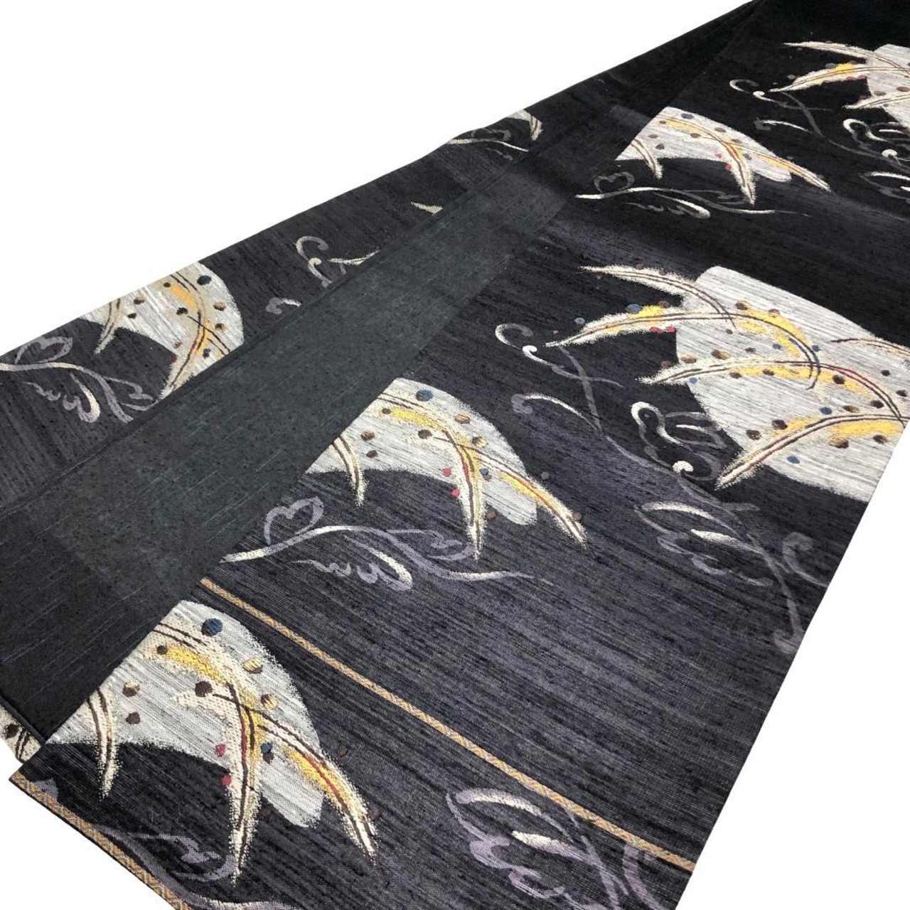 鶴の黒羽色の落ち着いたお色味、抽象的な月にうさぎ、葉模様がデザインされた雰囲気の良い素敵な柄裄のお品でございます。