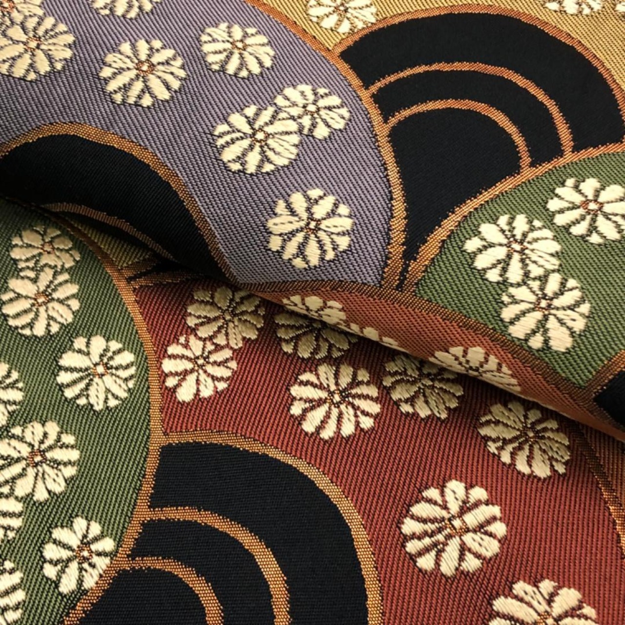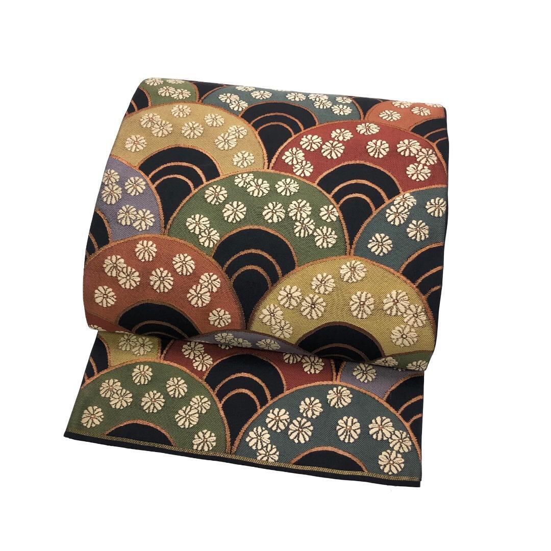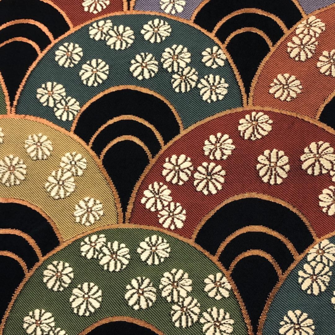 黒色のお色味に色鮮やかな青海波、菊の花模様がデザインされた素敵な柄裄のお品でございます。