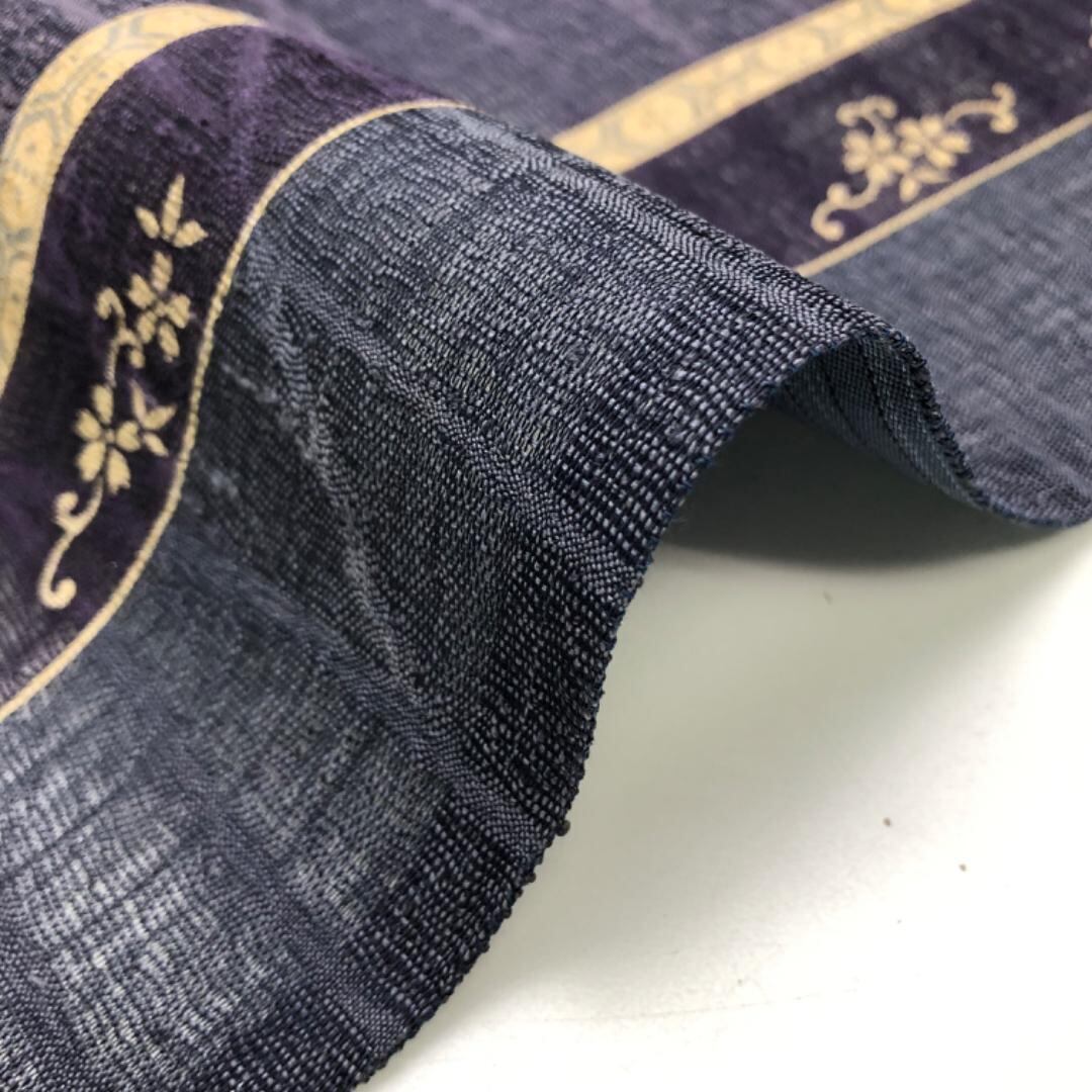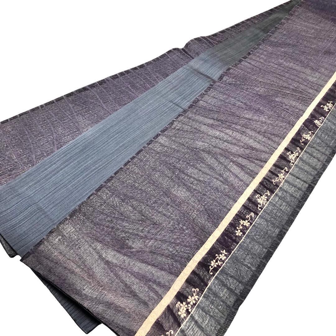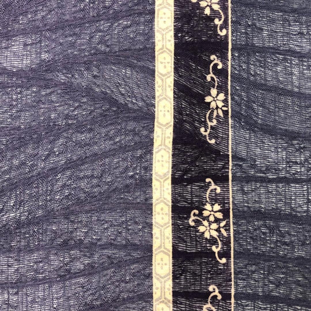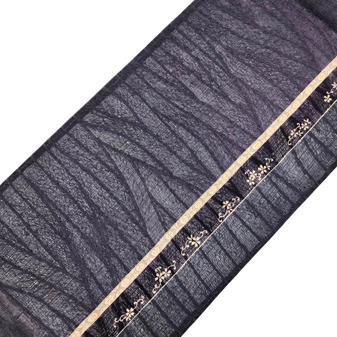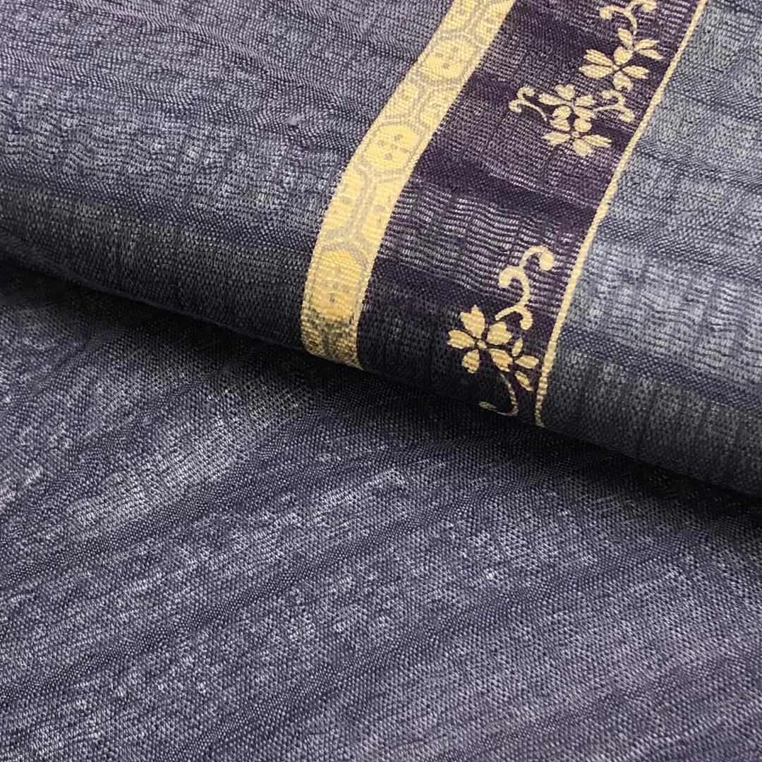 滅紫色ベースの透け感のあるすくい織、縦柄花唐草模様がデザインされた雰囲気の良い素敵な柄裄のお品でございます。
