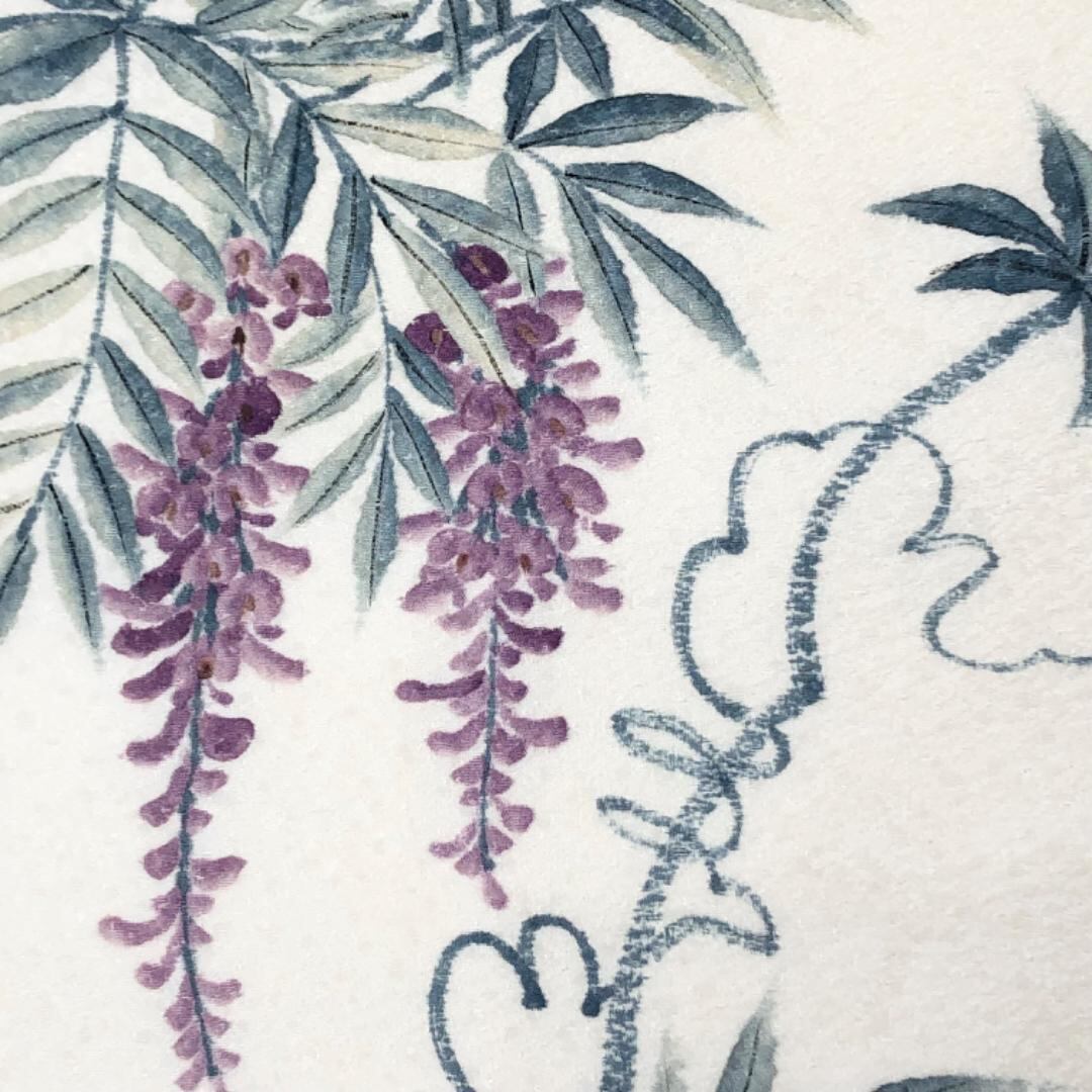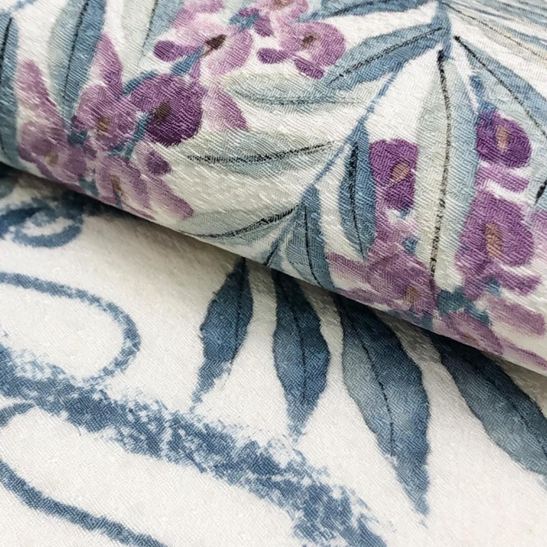 乳白色の上品なお色味に手描きの藤の花模様がデザインされた品のある素敵な柄裄のお品でございます。