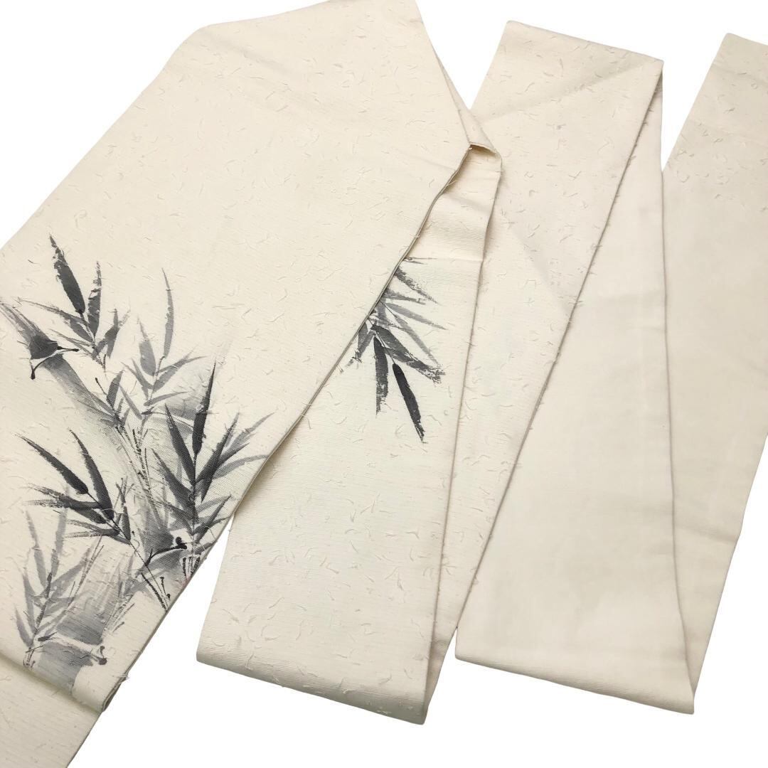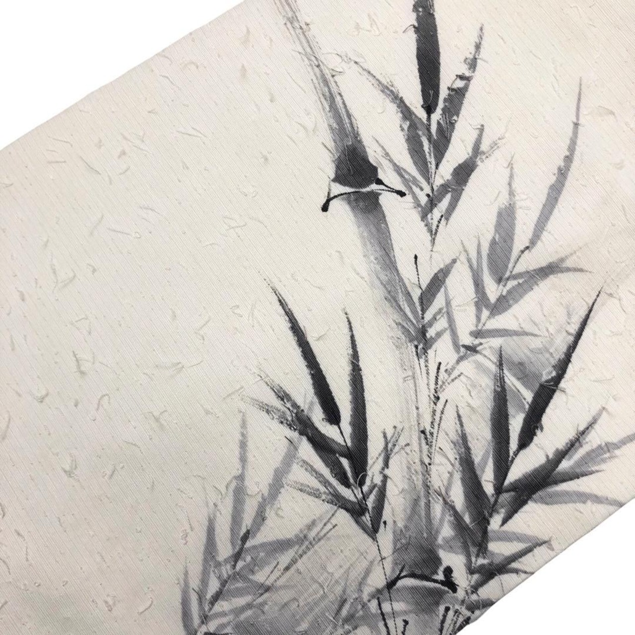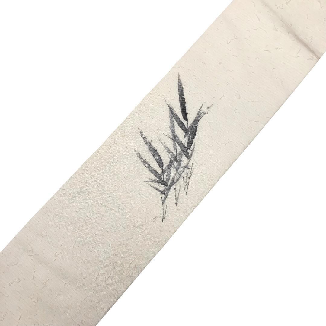 乳白色の品のあるお色味の髭紬、墨描きの笹の葉模様がデザインされた雰囲気の良い素敵な柄裄のお品でございます。