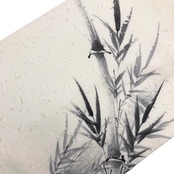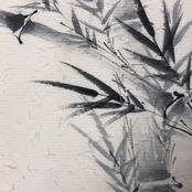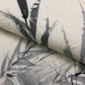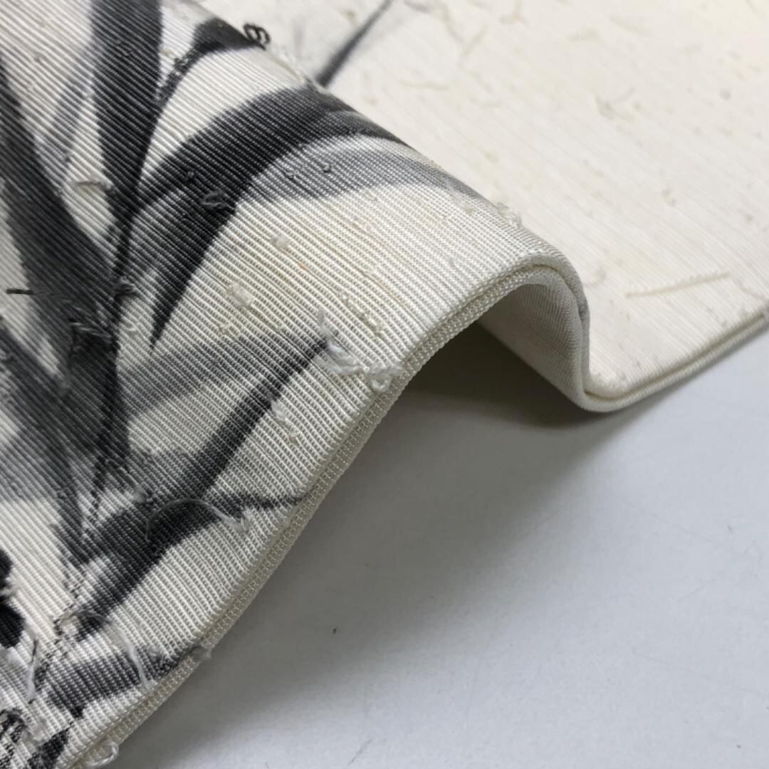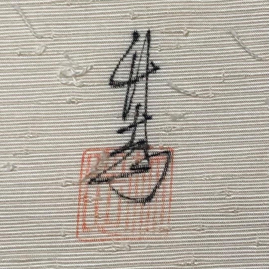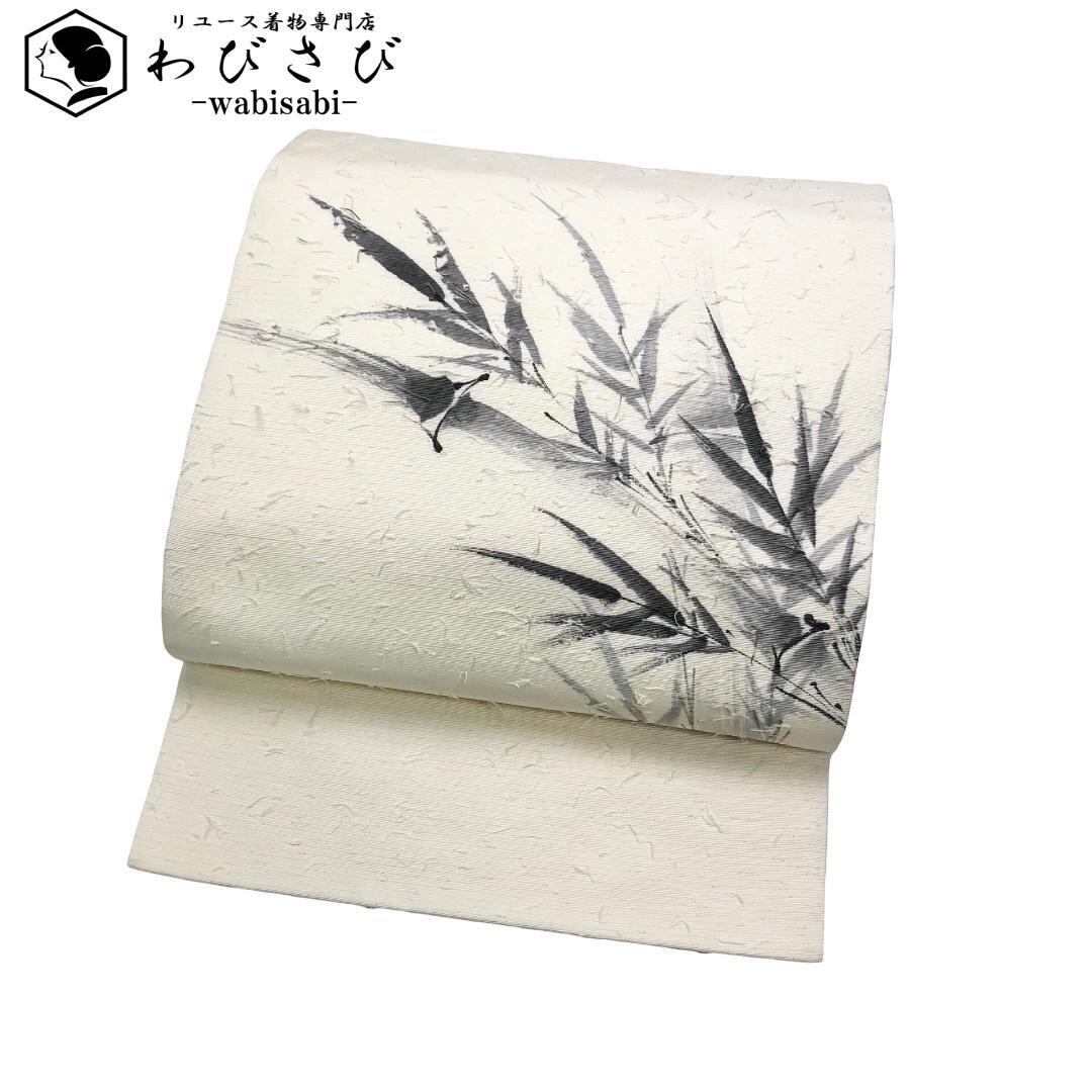 乳白色の品のあるお色味の髭紬、墨描きの笹の葉模様がデザインされた雰囲気の良い素敵な柄裄のお品でございます。