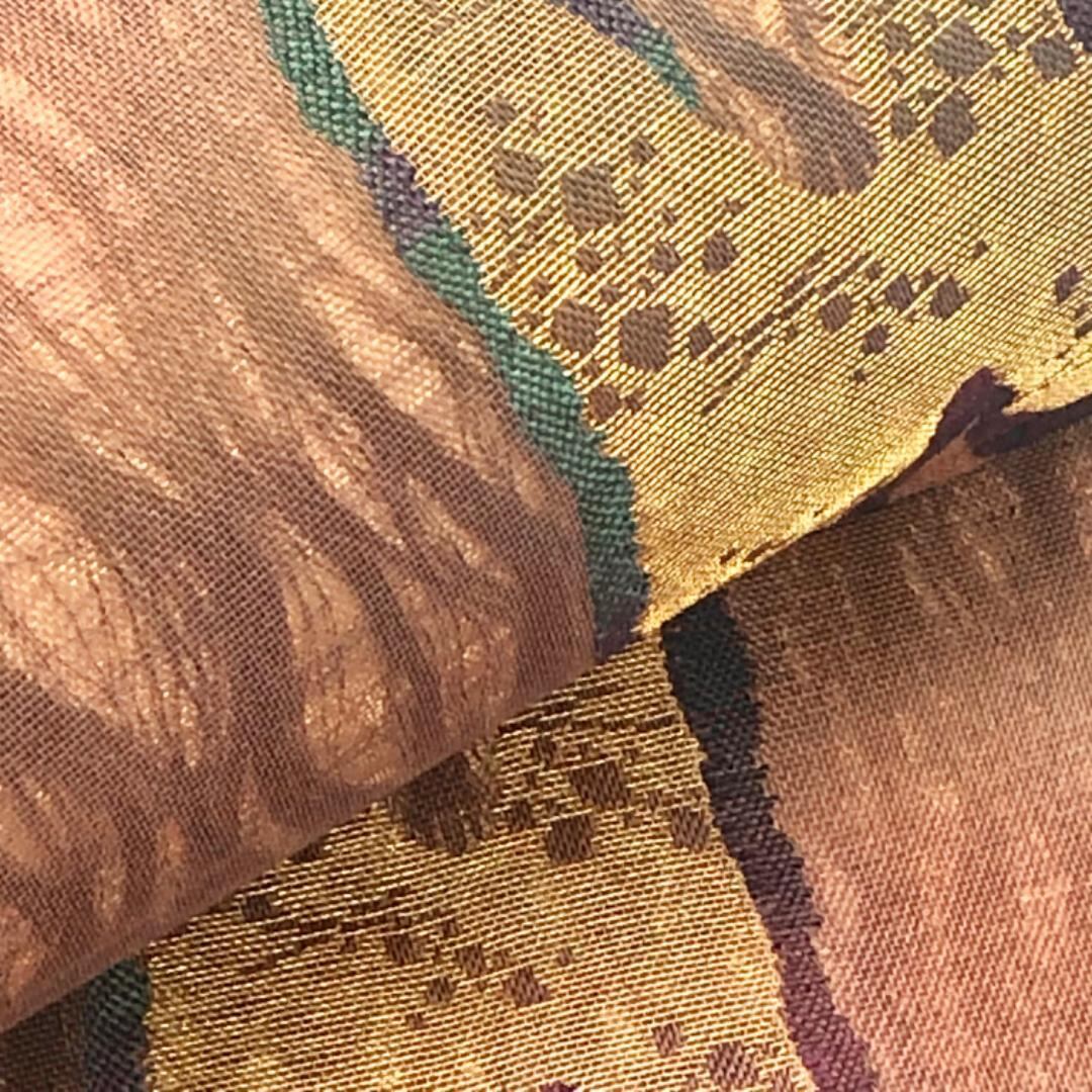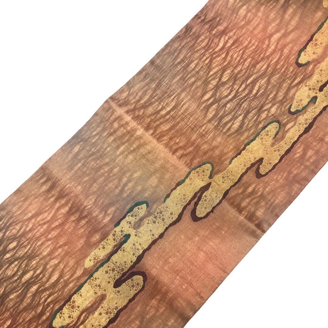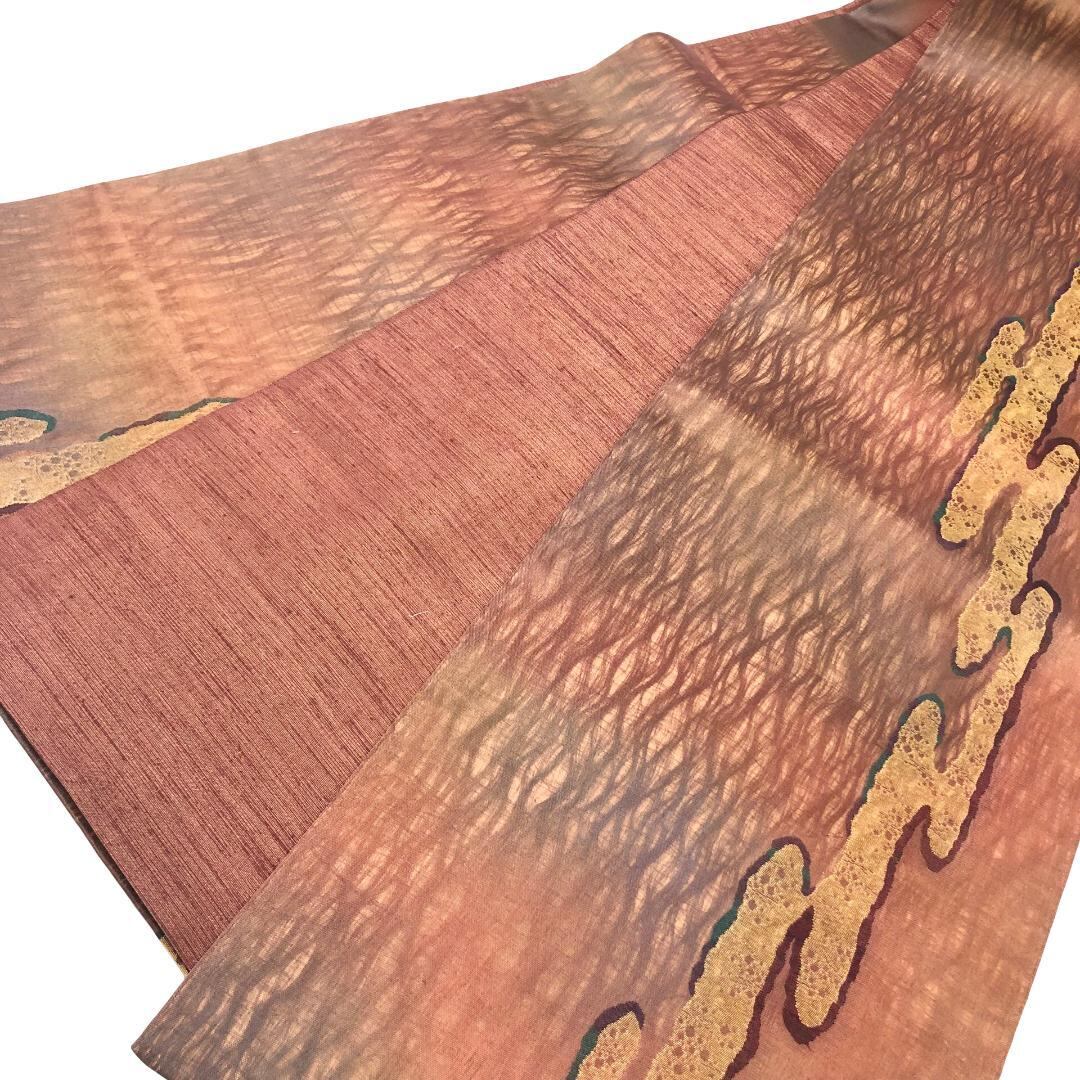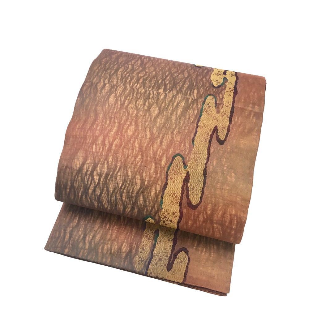雀色ベースの落ち着いたお色味に縦柄抽象霞模様がデザインされたすくい織の透け感のある素敵なお品でございます。