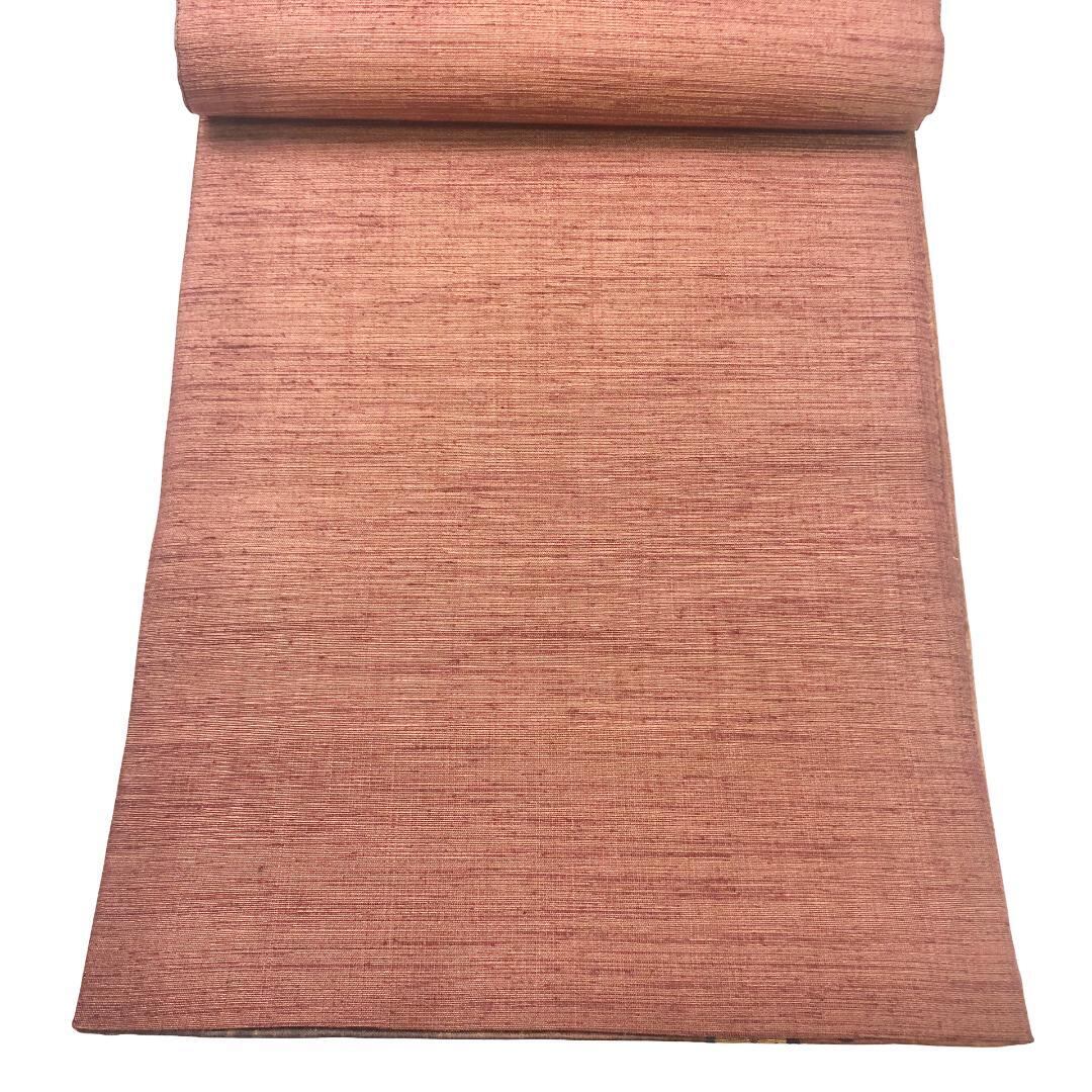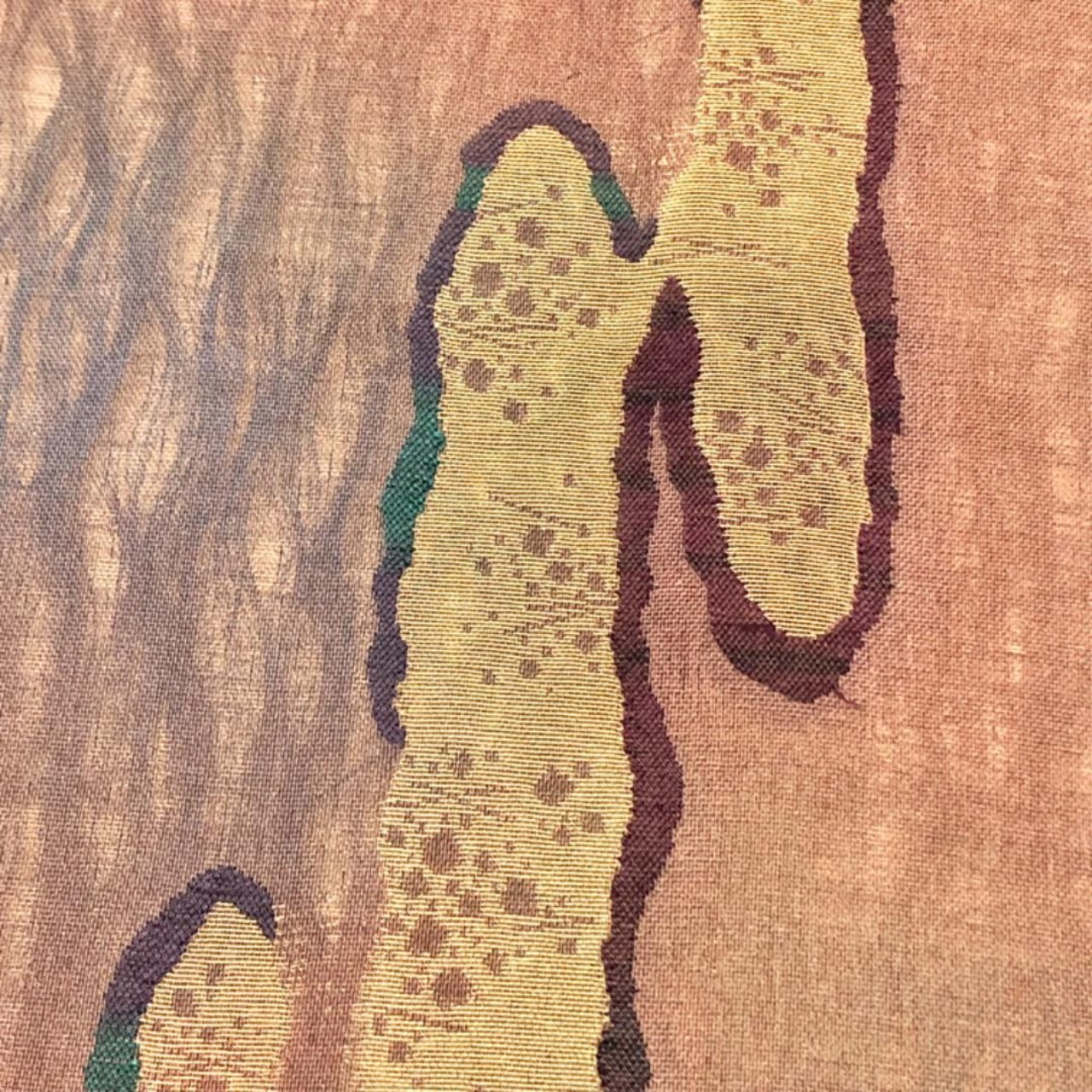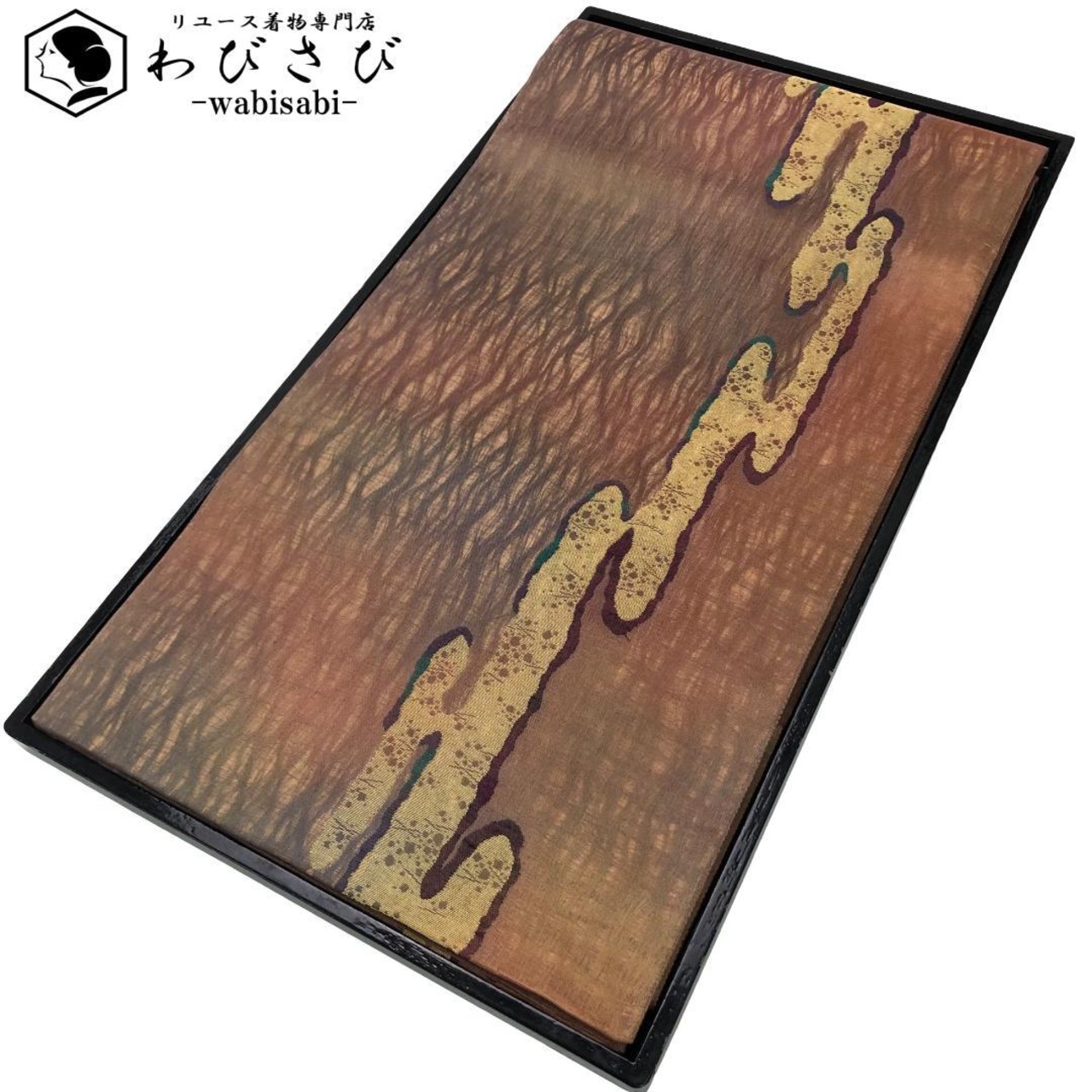 雀色ベースの落ち着いたお色味に縦柄抽象霞模様がデザインされたすくい織の透け感のある素敵なお品でございます。