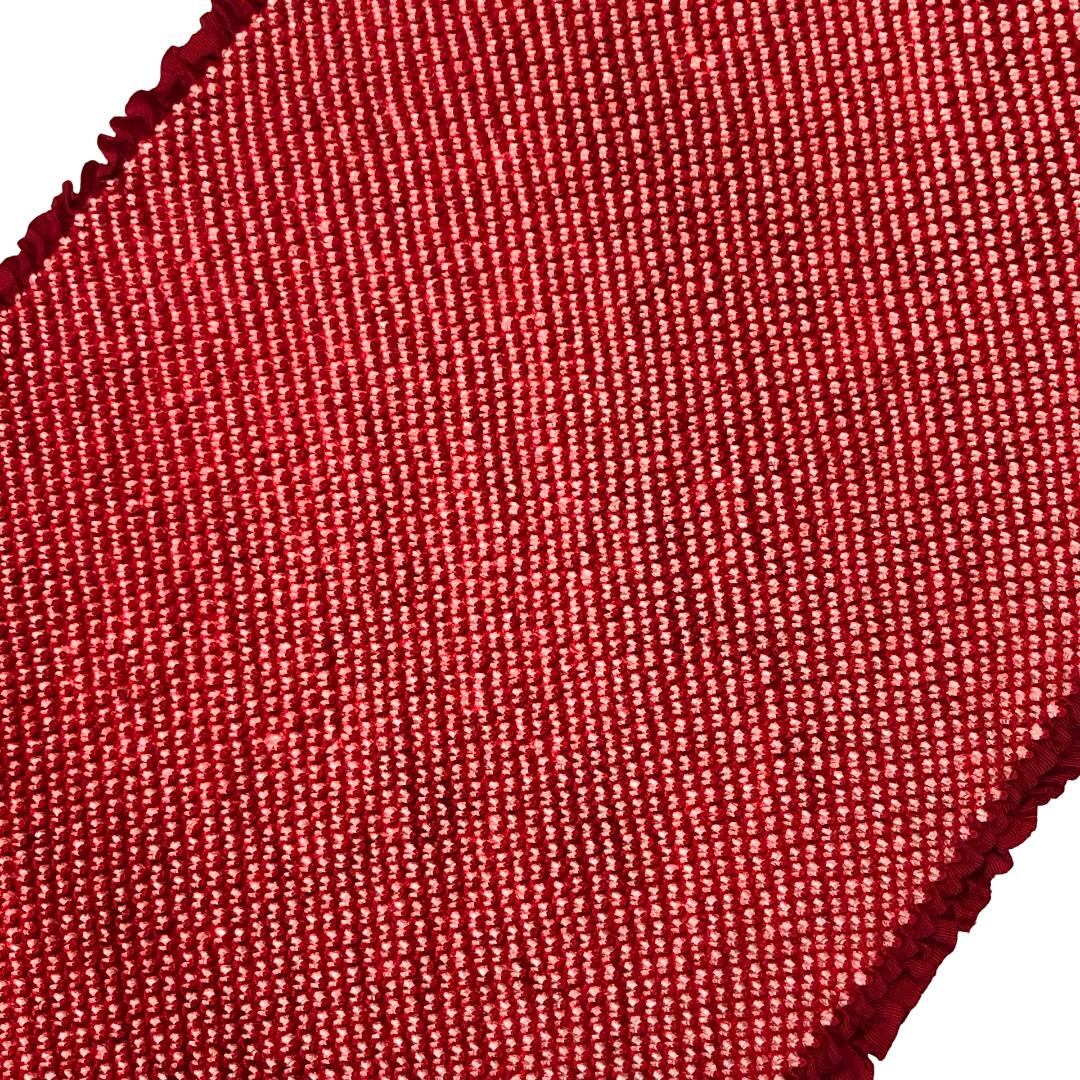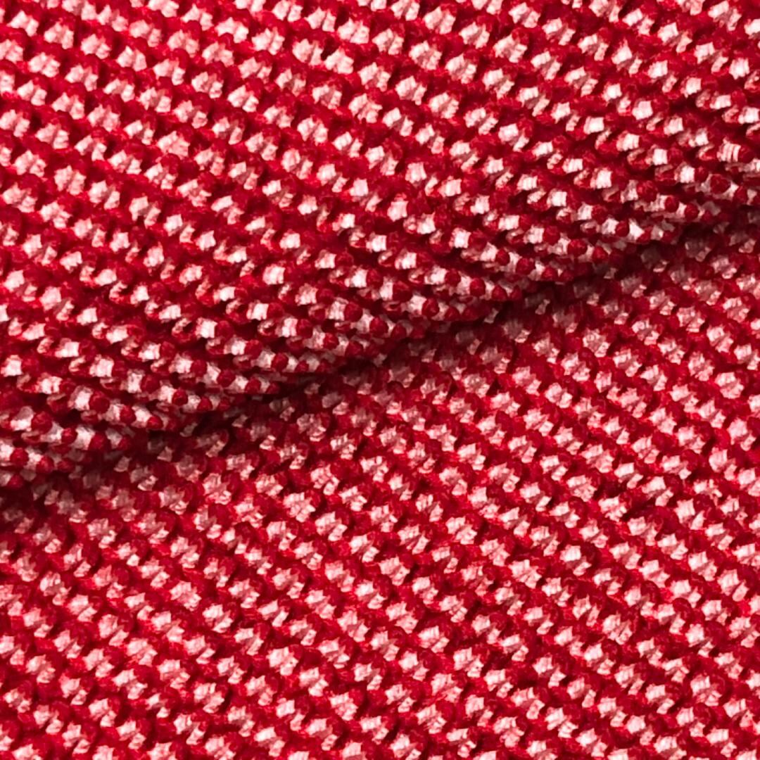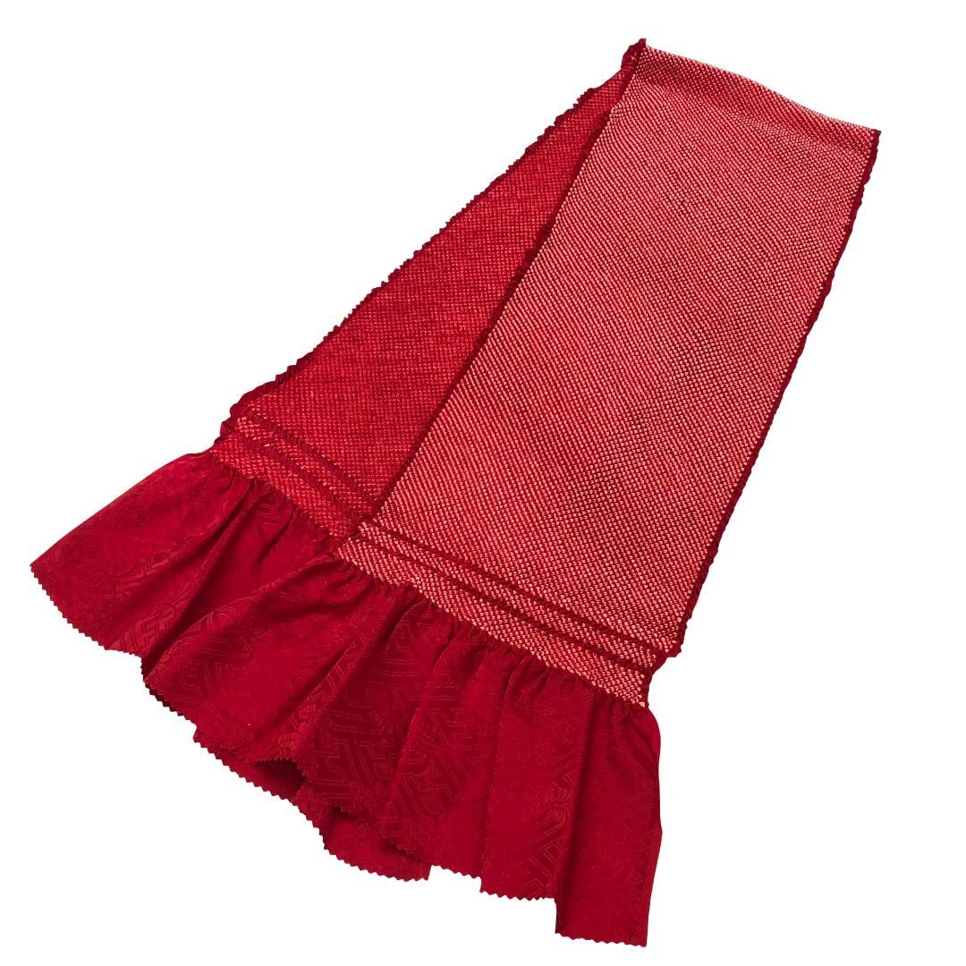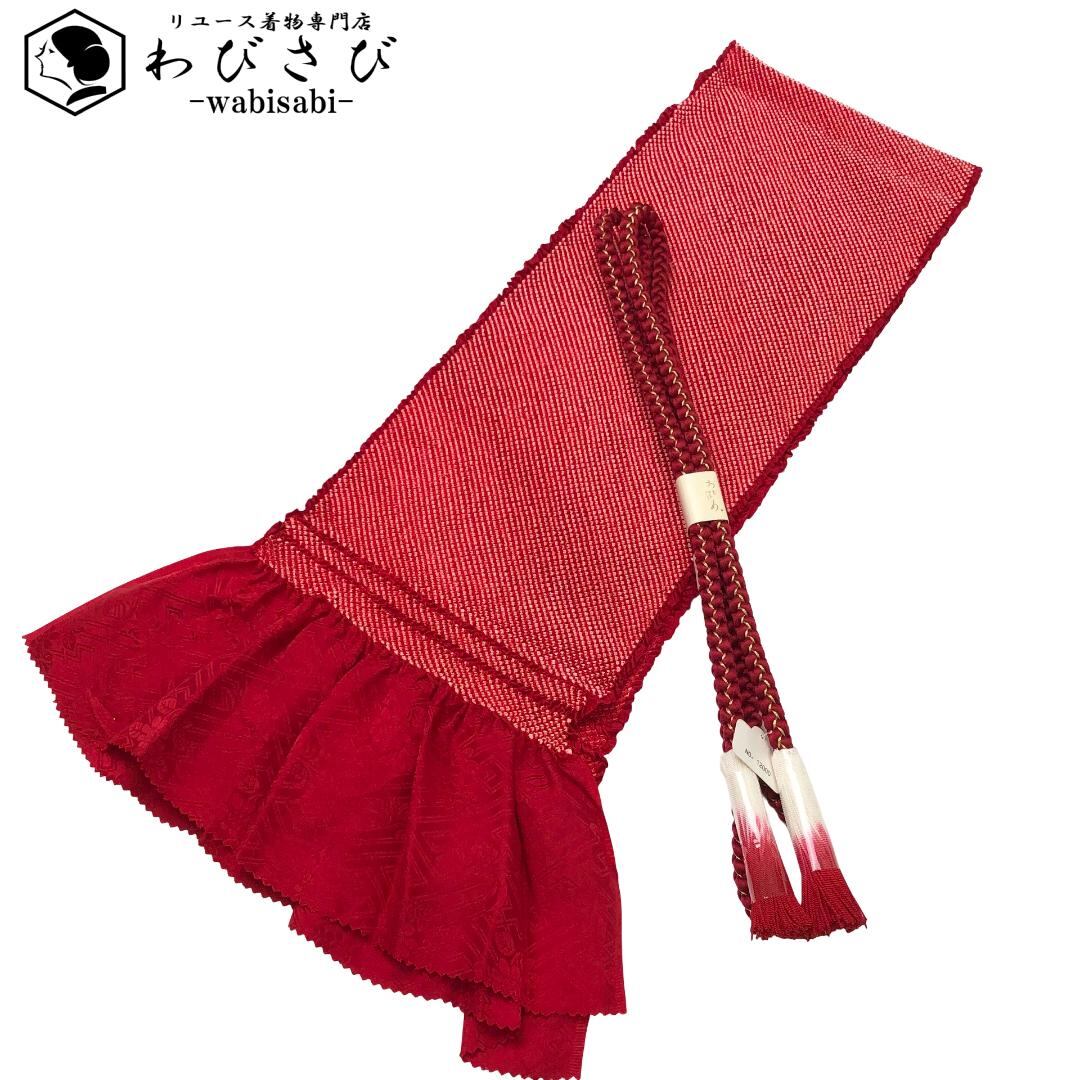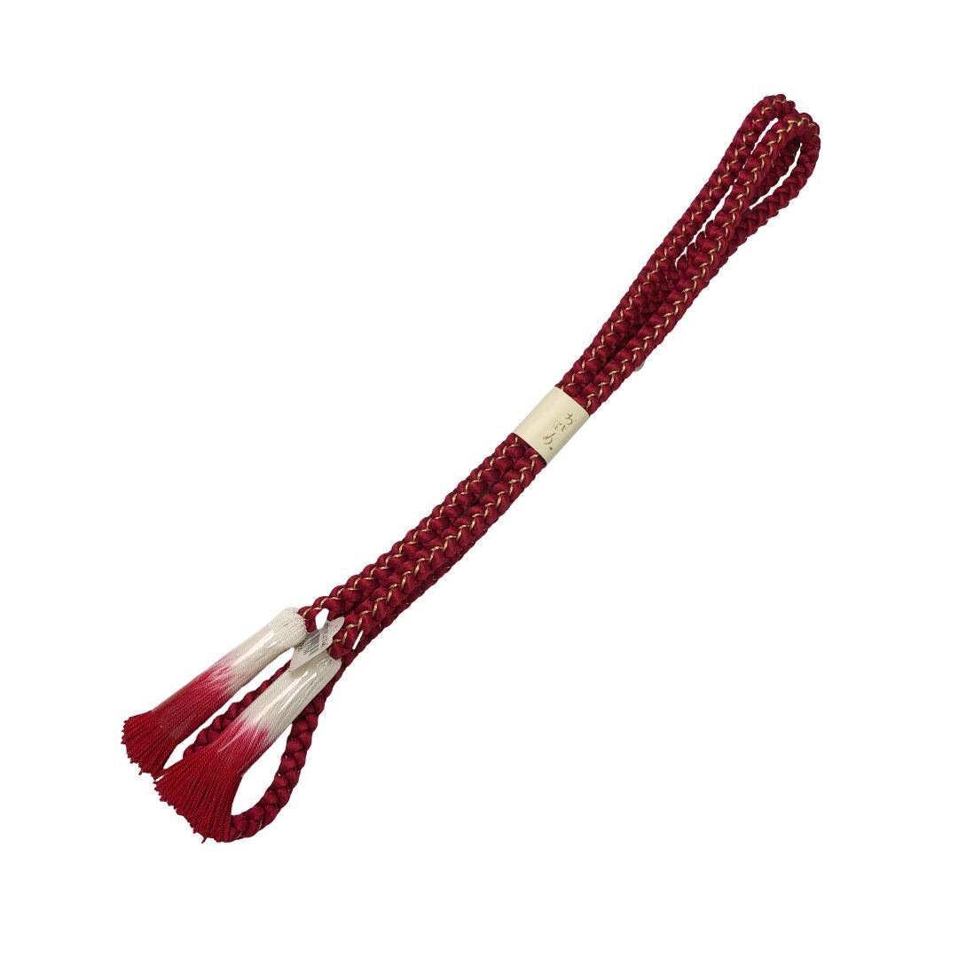 赤色のお色味に総絞りの帯揚げ、丸組紐の帯締めが素敵なお品でございます。