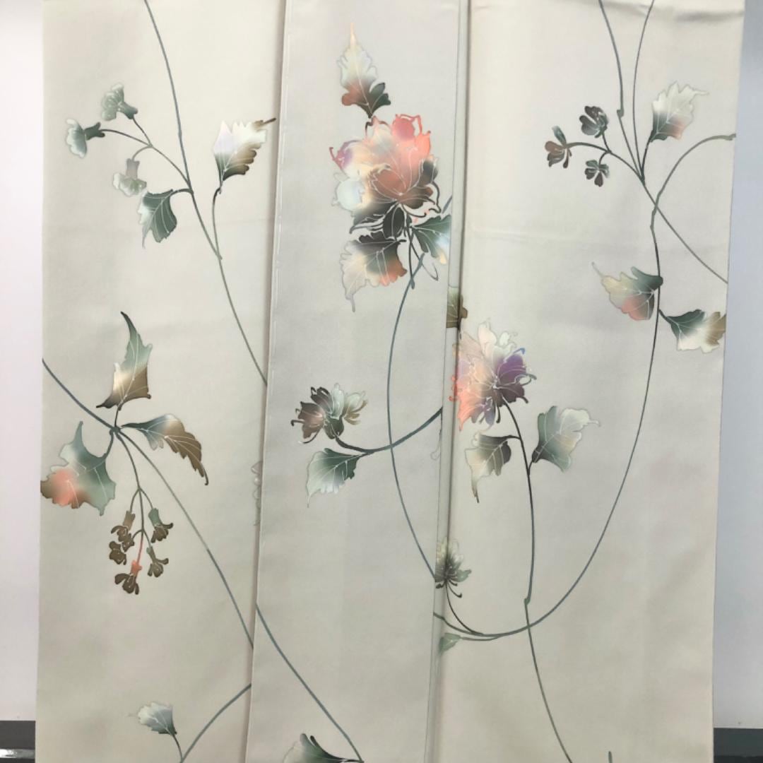 薄利休鼠色の上品なお色味に雰囲気の良い美しい花模様の柄裄がデザインされた素敵なお品でございます。