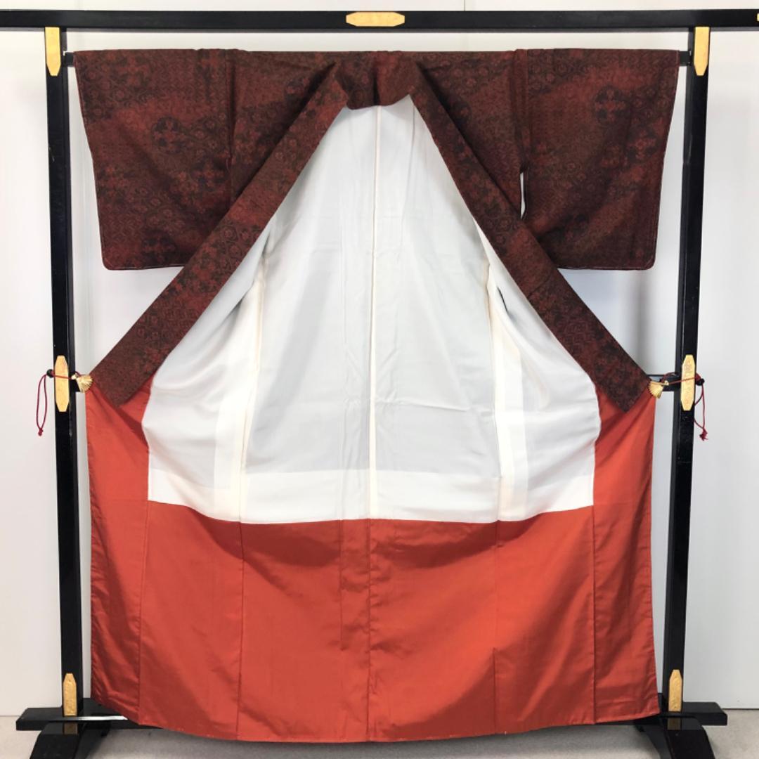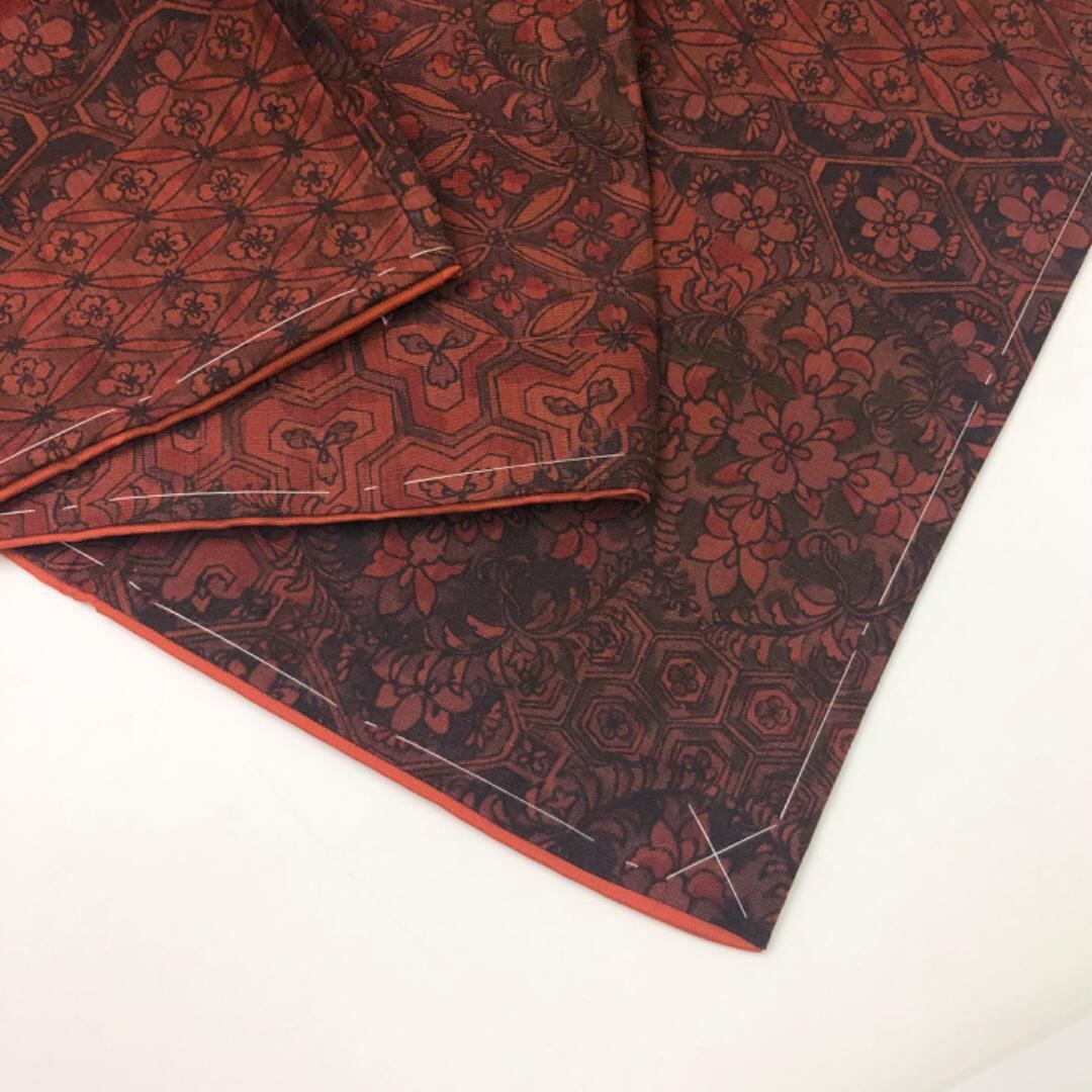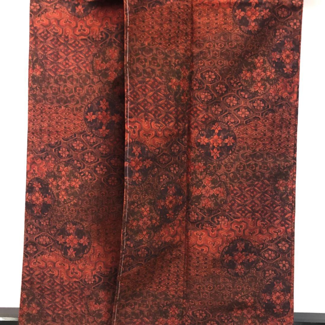 赤銅色ベースのお色味に花亀甲、花七宝などの花模様の柄裄がデザインされた雰囲気の良い素敵なお品でございます。
